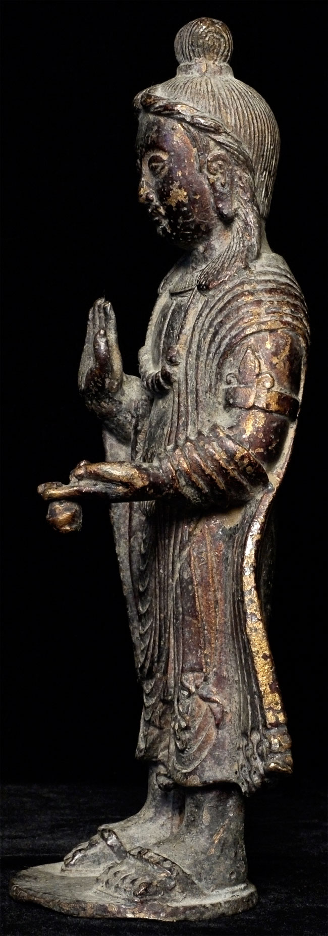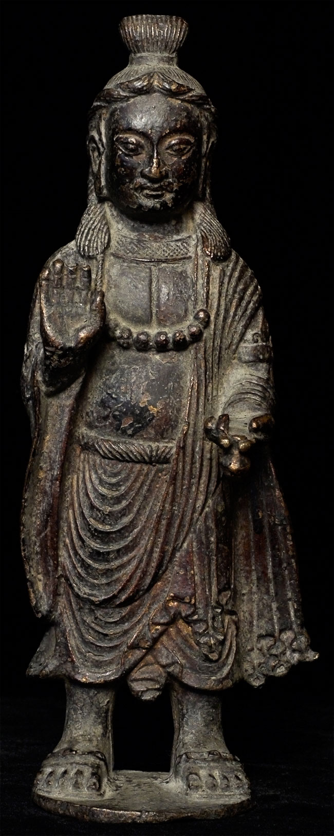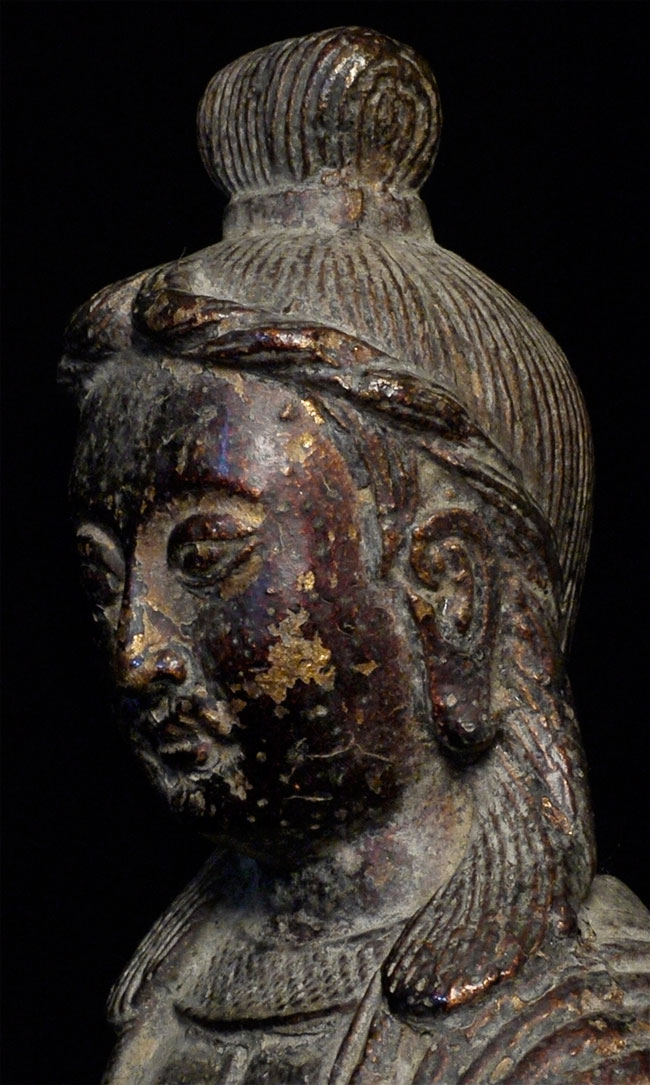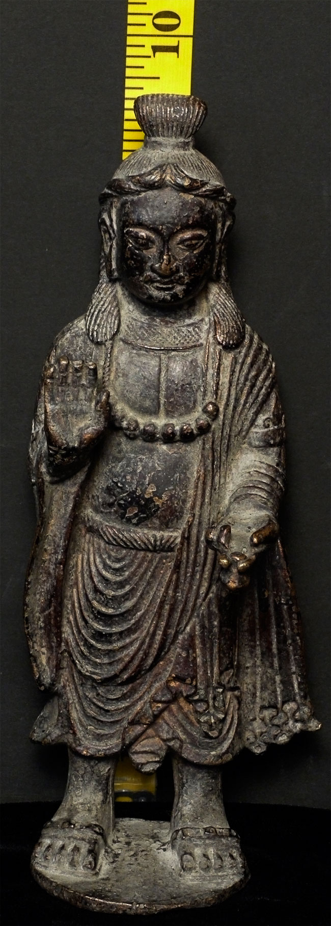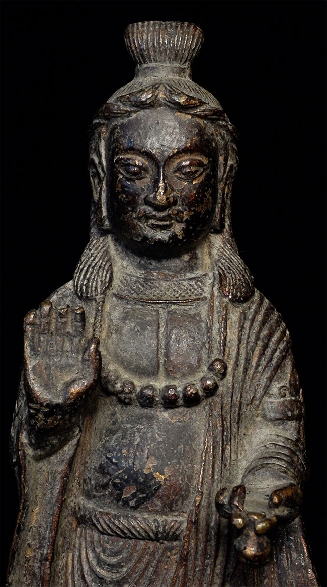 Very distinctive bronze Bodhisattva- a bit of a mystery. Probably a Chinese/Silk Road emulation of a Gandharan style. Likely 20thC, though may be earlier. Very beautiful statue unlike any other I have offered. Stands 9.25 inches tall. Purchased out of a small local estate auction in England.