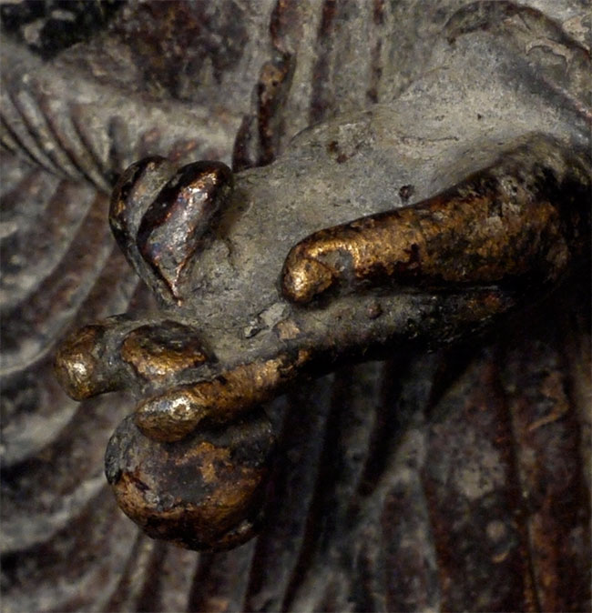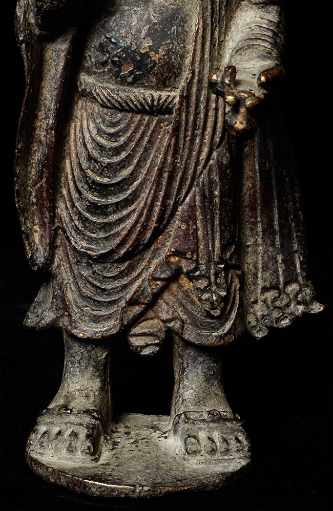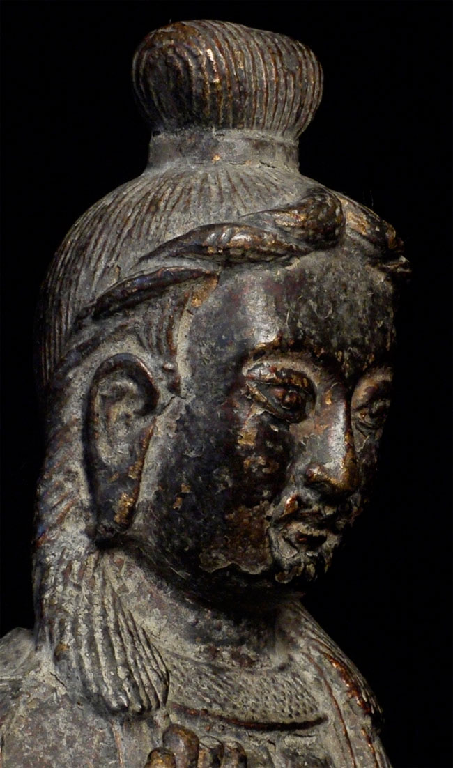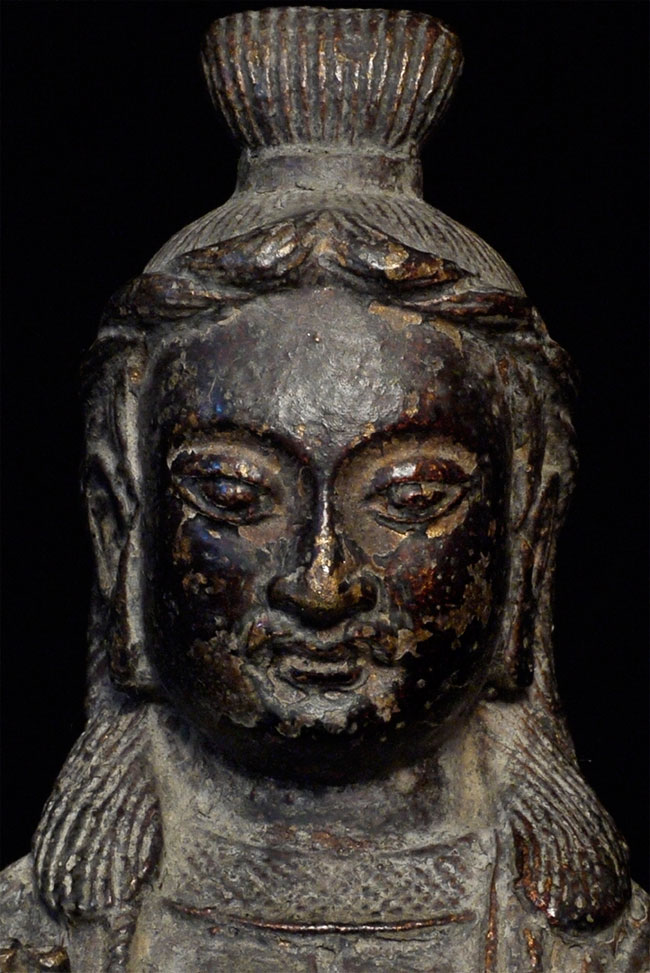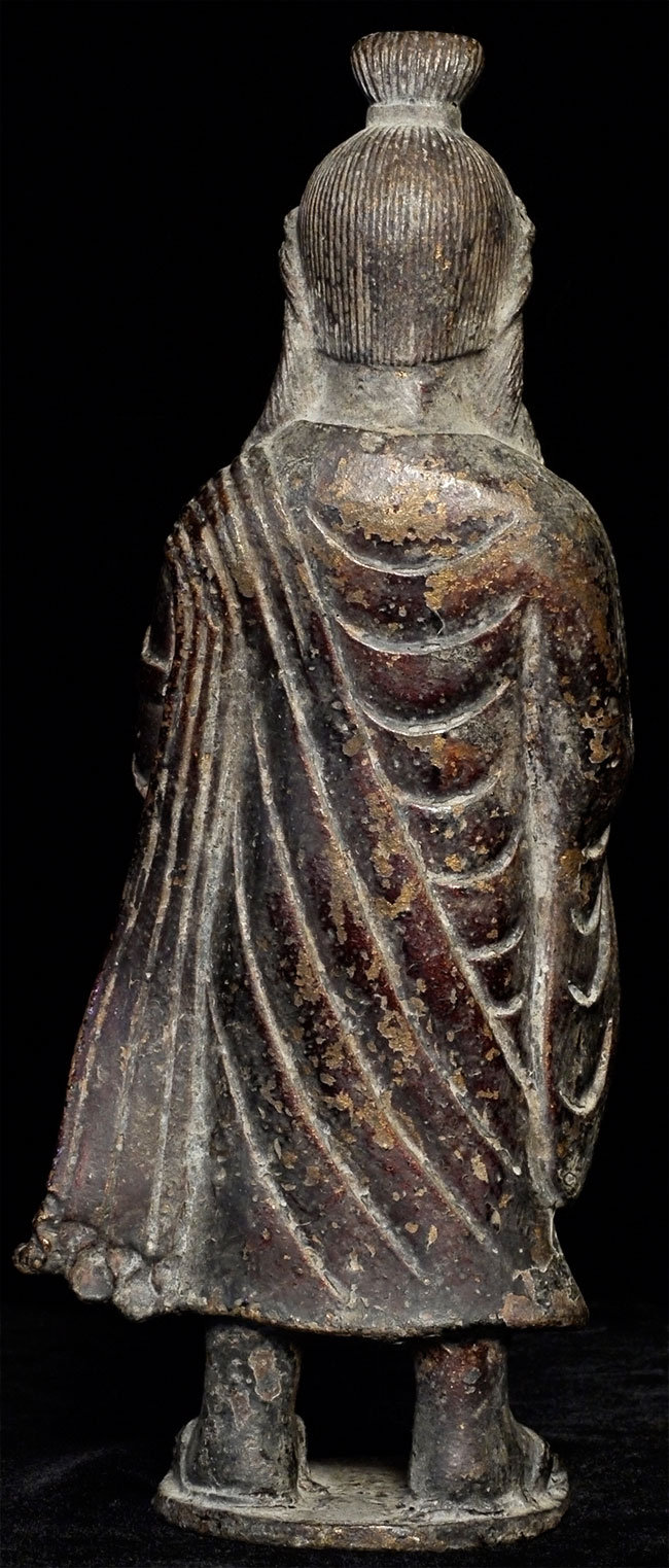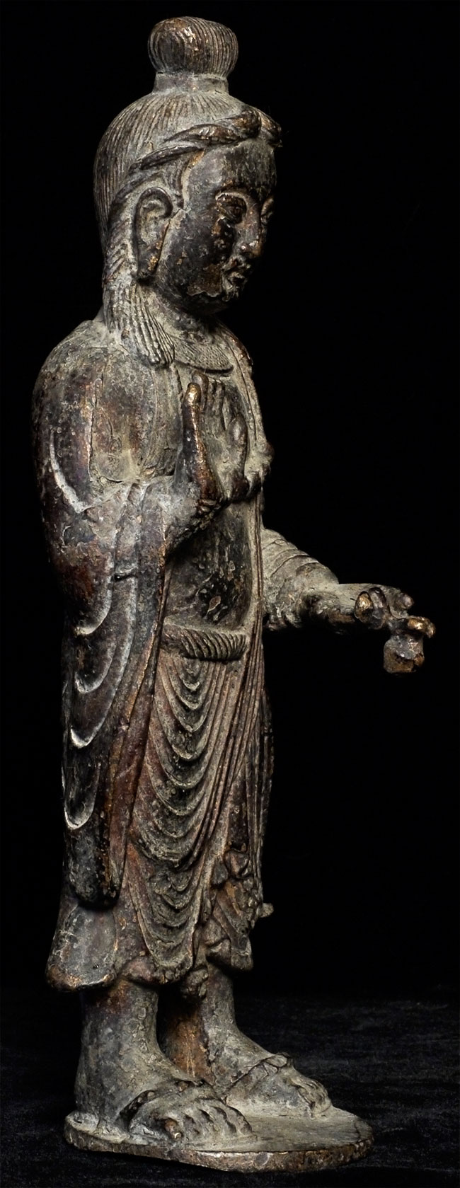 Very distinctive bronze Bodhisattva- a bit of a mystery. Probably a Chinese/Silk Road emulation of a Gandharan style. Likely 20thC, though may be earlier. Very beautiful statue unlike any other I have offered. Stands 9.25 inches tall. Purchased out of a small local estate auction in England.