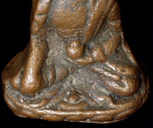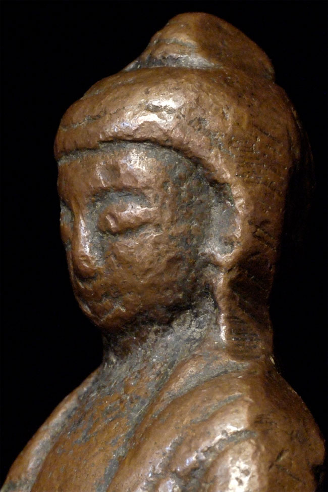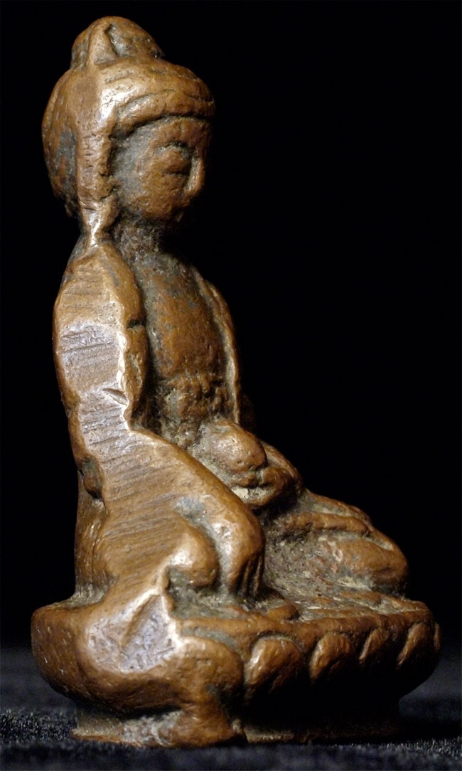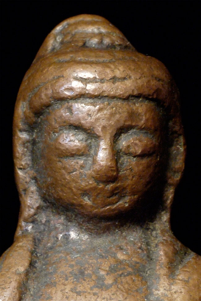 VERY early (600 years+) solid-cast Tibetan or Nepalese Buddha. Deeply serene face which radiates calm and peace. From an old collection of very early solid-cast Buddhist figures that also included items 6814 and 6826. Sits only 1 7/8 inches tall, but with a presence that is huge.