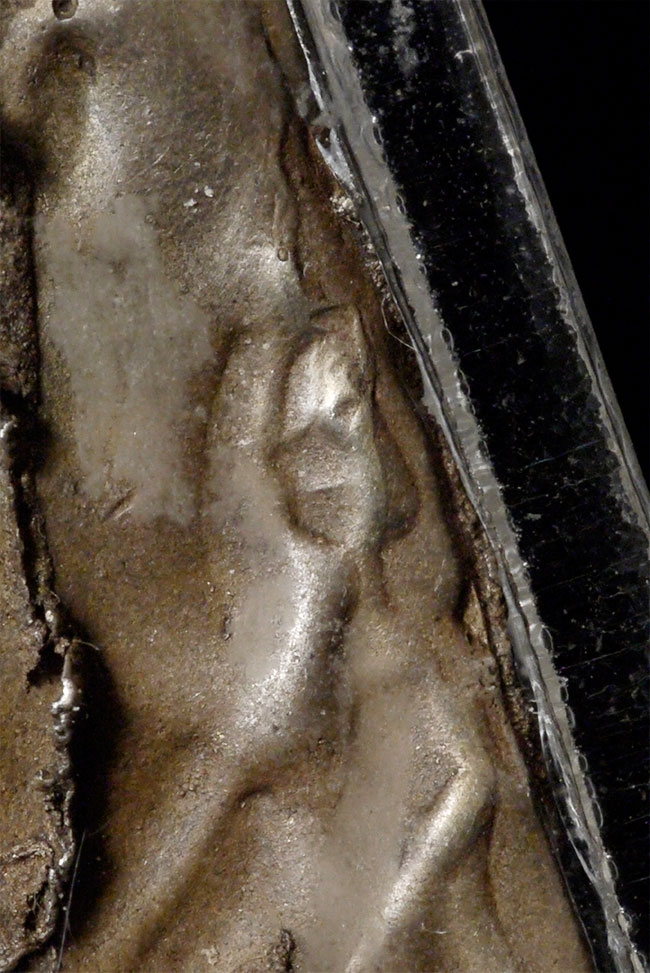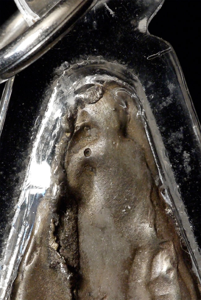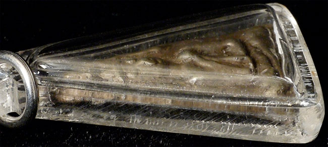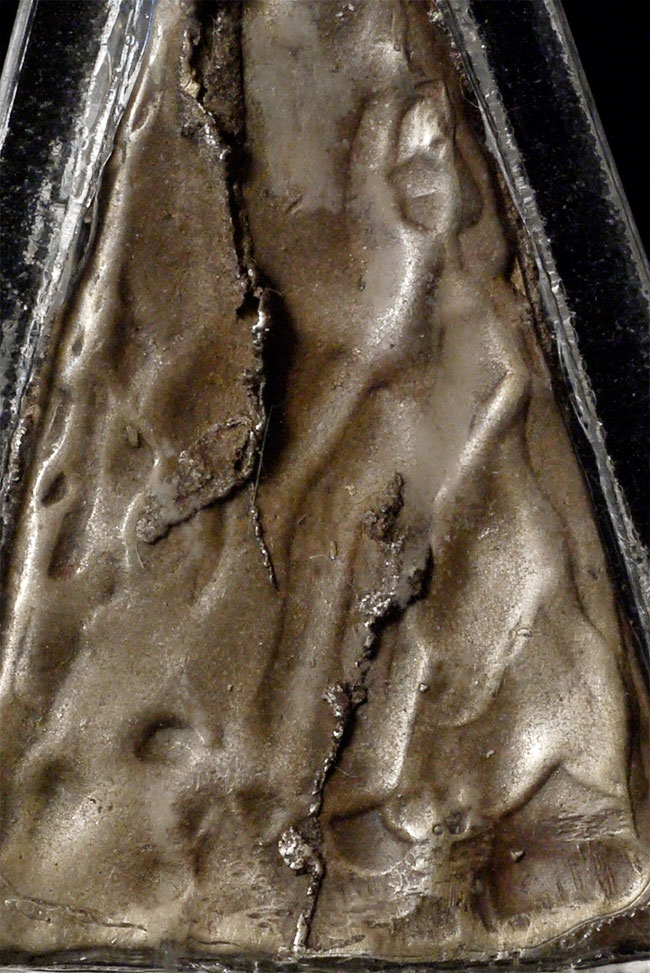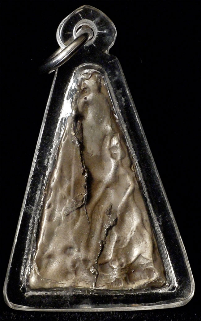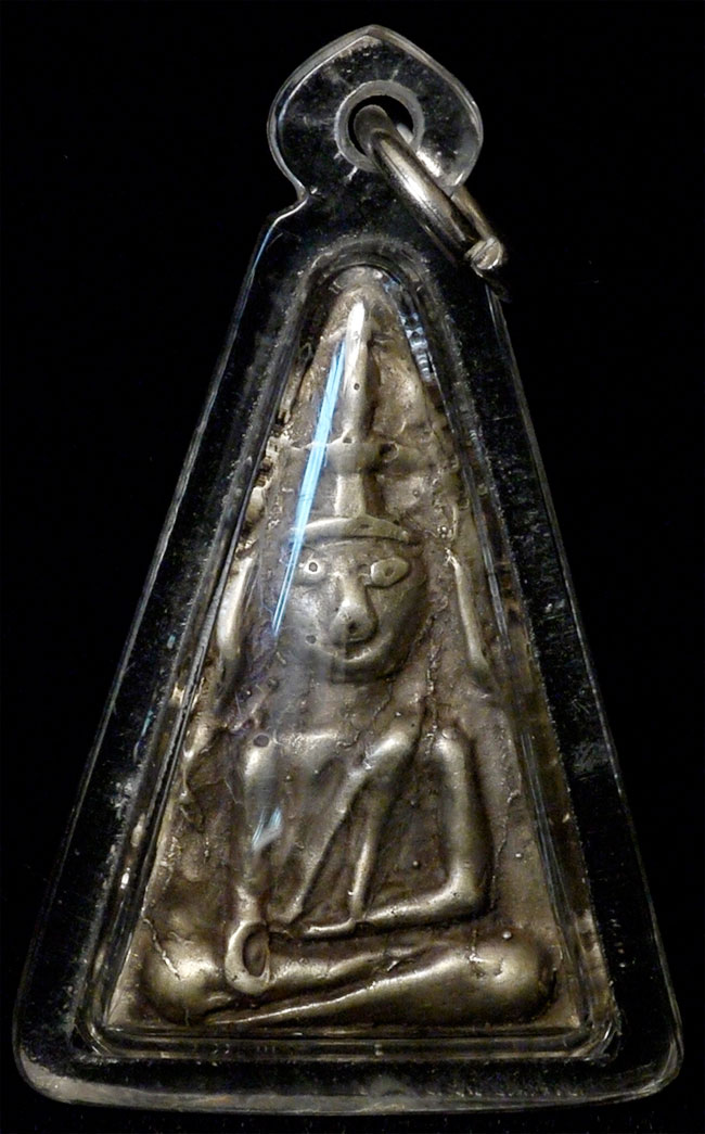 Antique Laos silver Amulet in modern case. Approx size is 1-1/5 inches including the case. Wonderful size to wear-flat and light weight. Delightfully expressive folk art feel to the Buddha. Unsure of actual silver content.