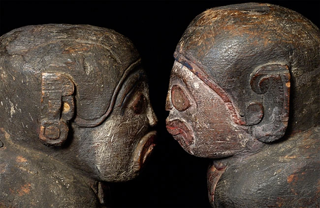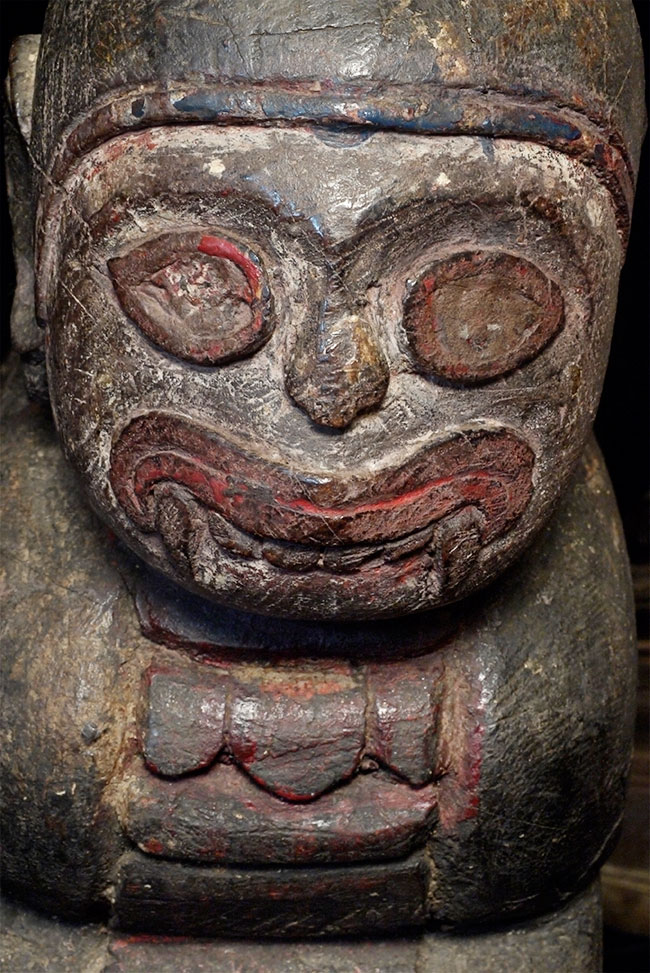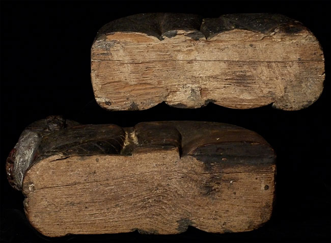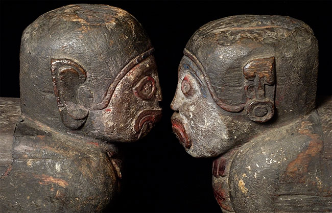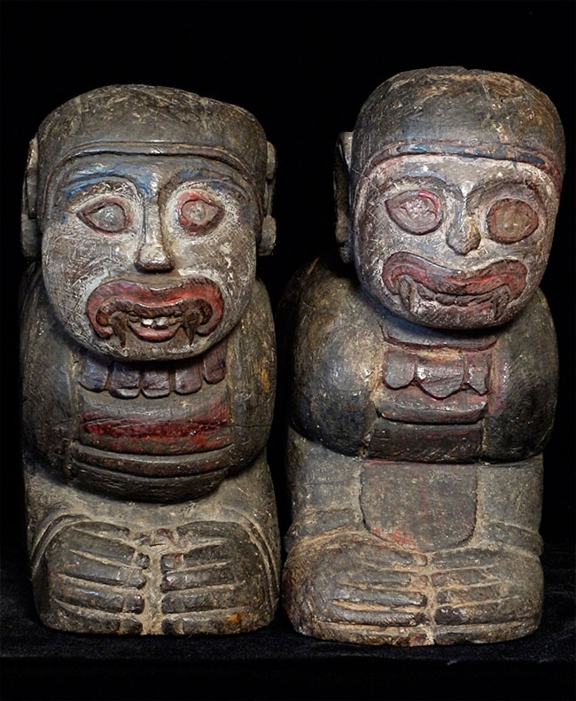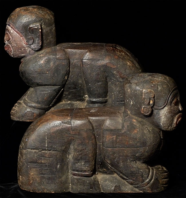 Burmese protective figures carved out of solid teak. Unsure of original purpose-possibly the feet of a piece of altar furniture. Each piece measures 10 inches tall, 13 inches deep, 5 inches wide. Very good age, as evidenced by the beautiful patina. I've never seen another pair (or one) of these before.