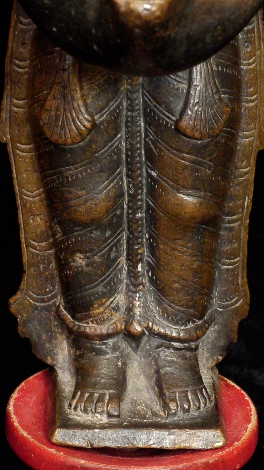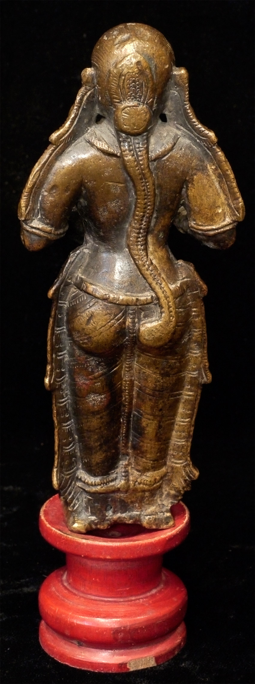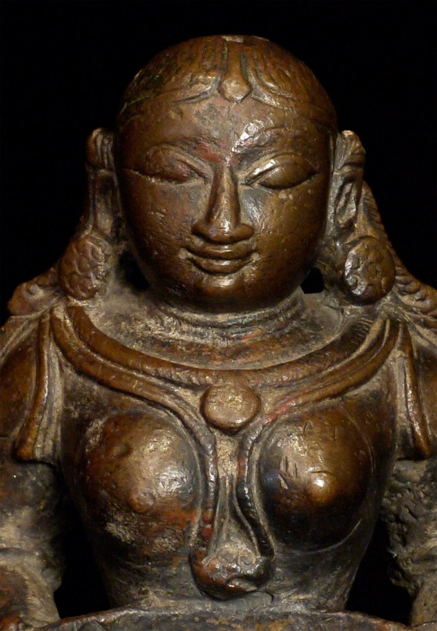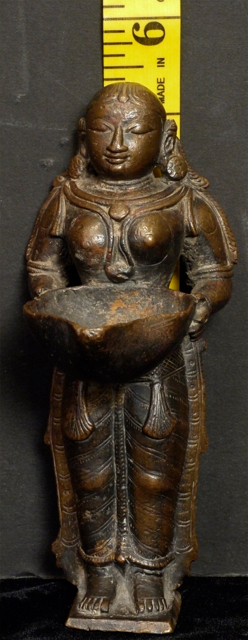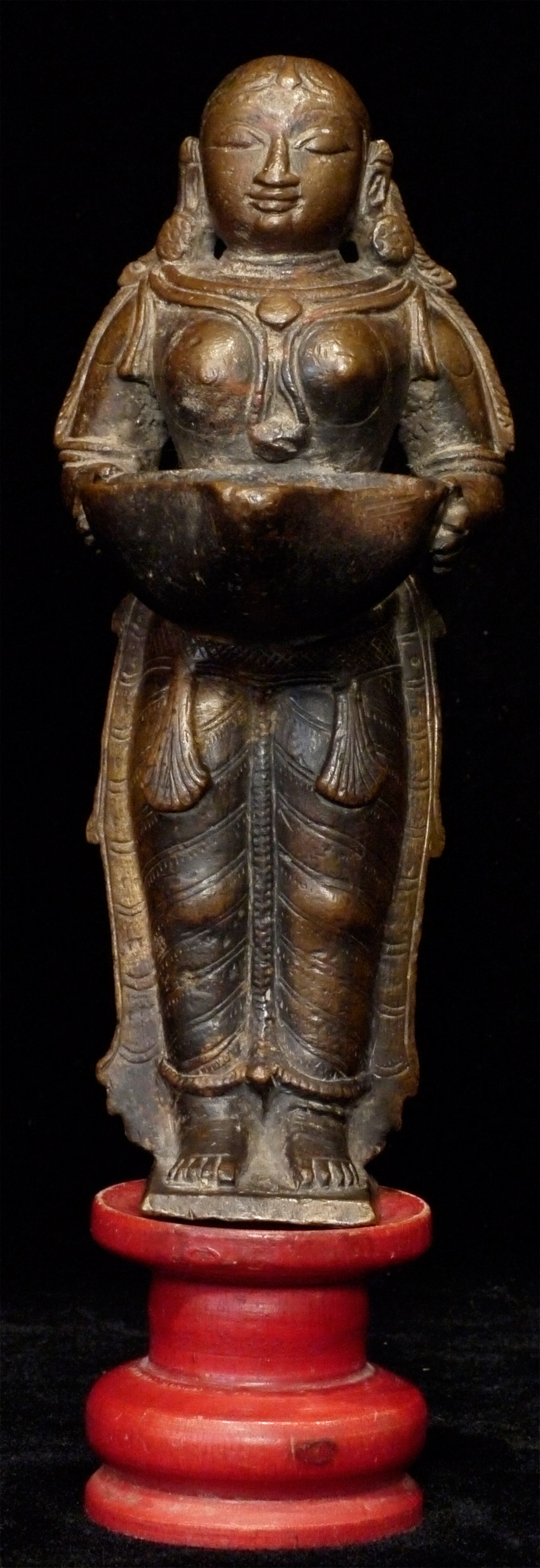 Beautiful 17thC bronze Indian Bodhisattva as an oil lamp. Currently loosely perched on a wooden base, she stands OK, but could use a proper base made for it in order to stand properly. Super face, magnificent patina. Stands 5 3/8 inches tall
