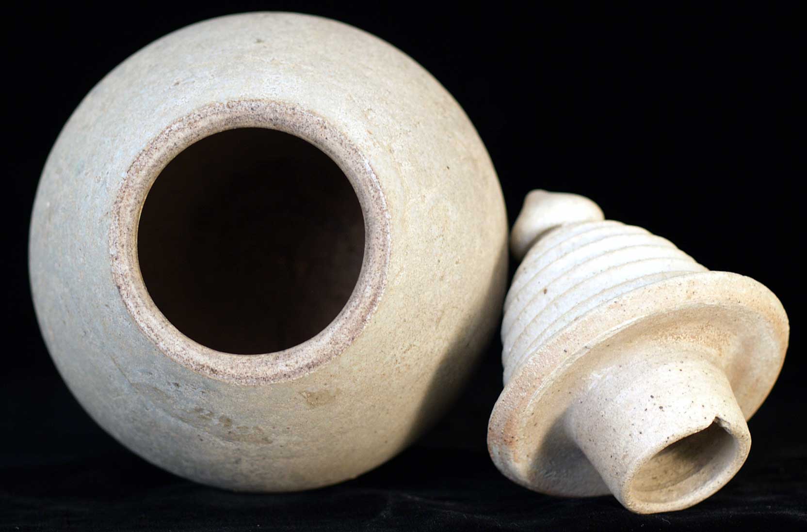 Very nice quality Thai Sawankalok covered container. It is uncommon to find a high quality piece which is unglazed. It is also very desirable to have the original matched to and bottom. A very good size at 8" tall X 4 1/4" at the thickest point. A few expectable rim chips and darkening- generally in excellent condition.