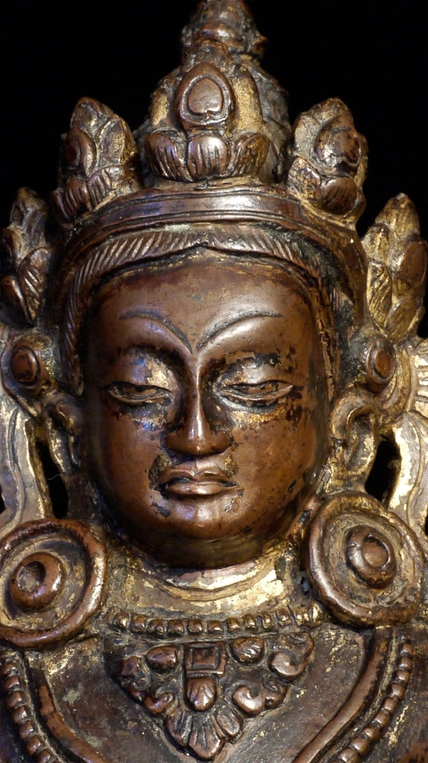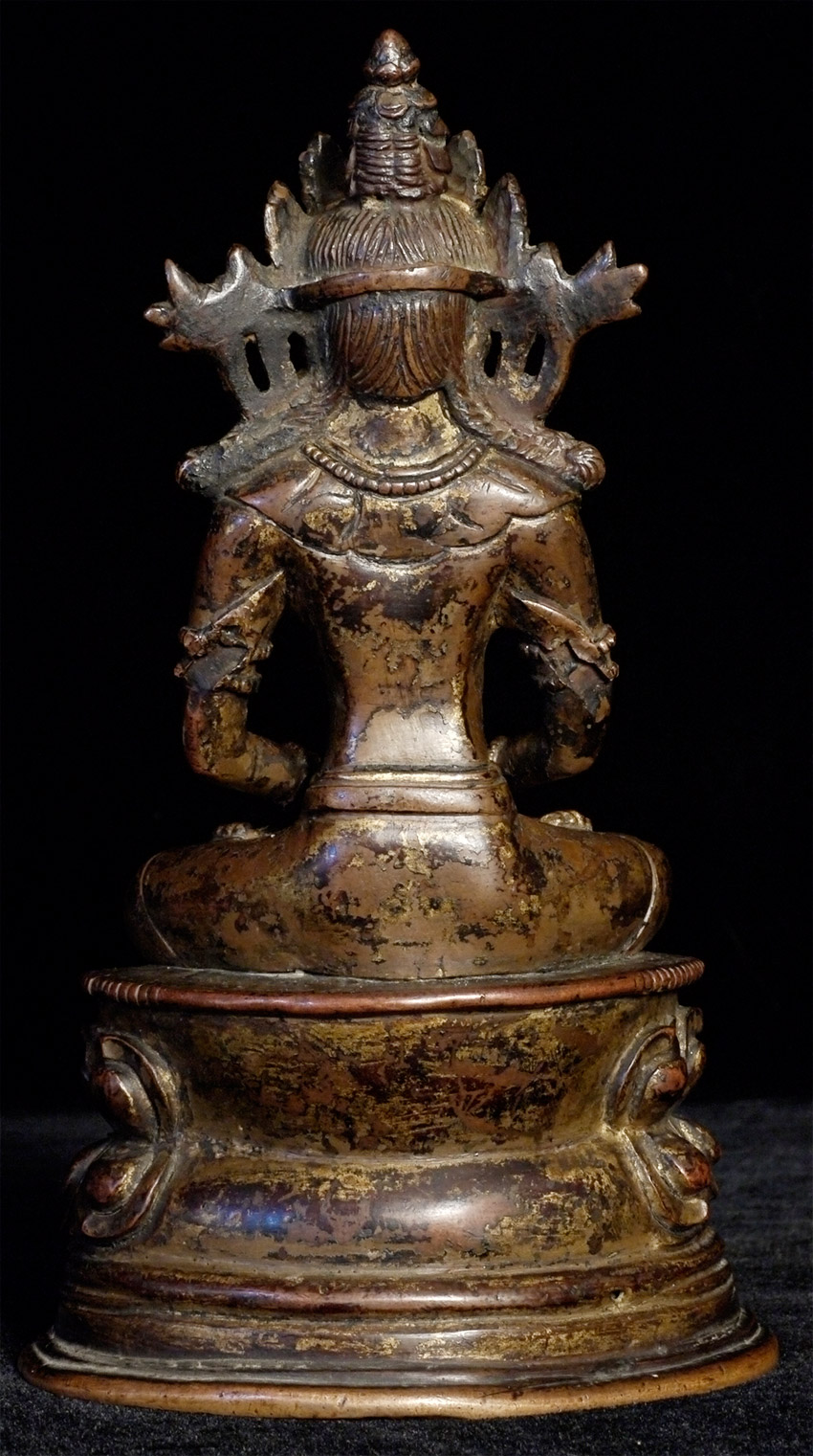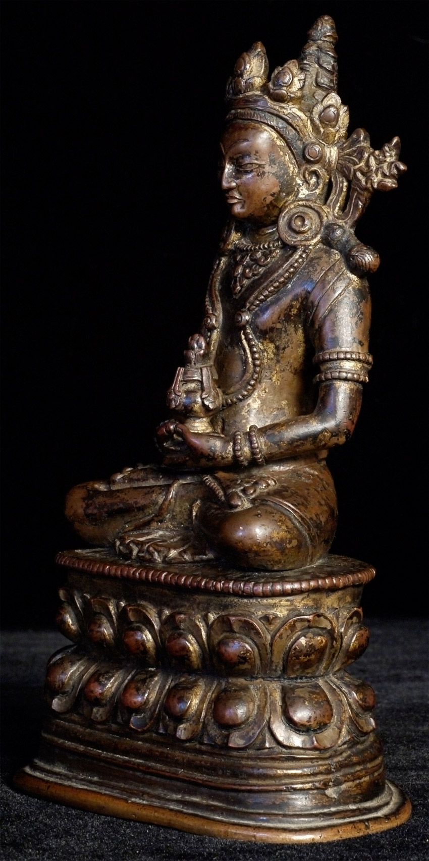 Superb 17/18thC Western Tibetn Bodhisattva of Long Life. Cast in an uncommon way, but one I've seen from West Tibet from this period before. Sits 6.5 inches tall. I believe Base, legs, torso, arms, head and headdress, and bowl of long life were all cast separately and carefully put together. The entire thing was then lacquered and gilding (some remains)Amazing wide crown that is in perfect balance with the overall sculpture, and at the same time makes it stand out from most any of its counterparts. A special piece.