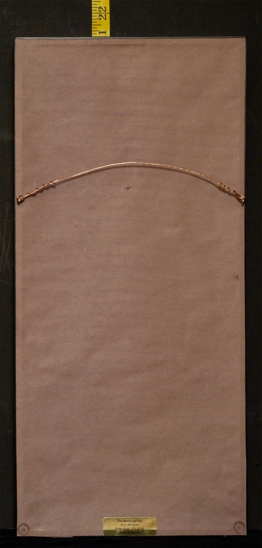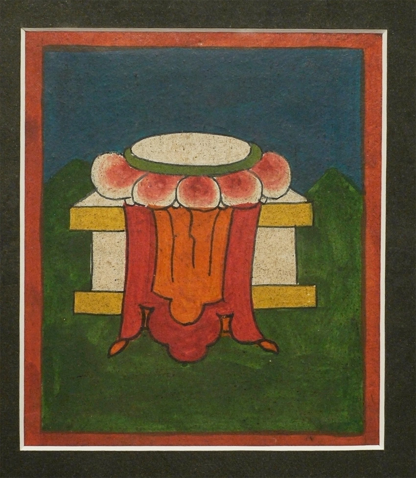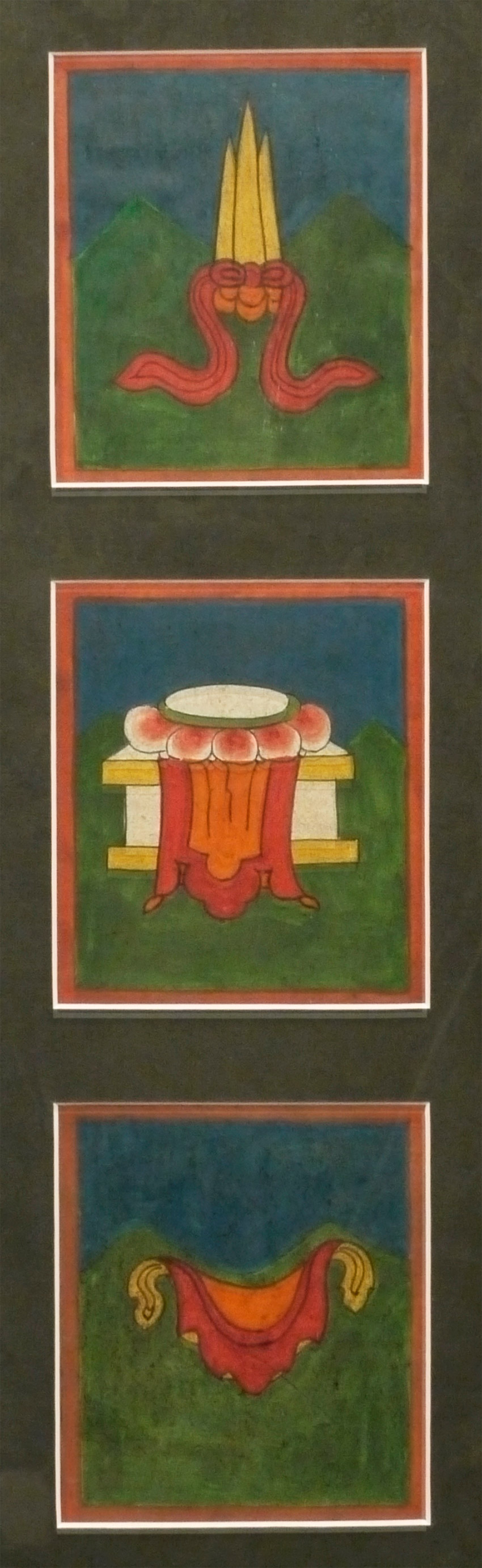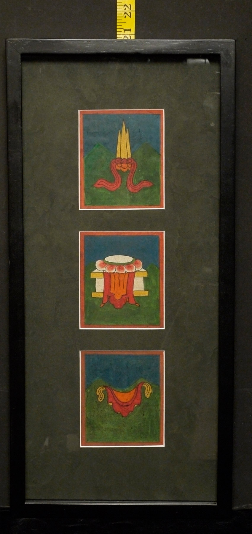 Three small old Thangkas of auspicious symbols or symbolic altar objects. Probably originally part of a large set. Beautiful colors, they go together extremely well. In exceptional condition. These look to be authentic examples made for ritual use that were probably taken out of Tibet long ago or they would be far more soiled and darkened. Each of the three Thankas measure 3.5 x 4 inches, outer frame is 9.75 x 20.75 inches