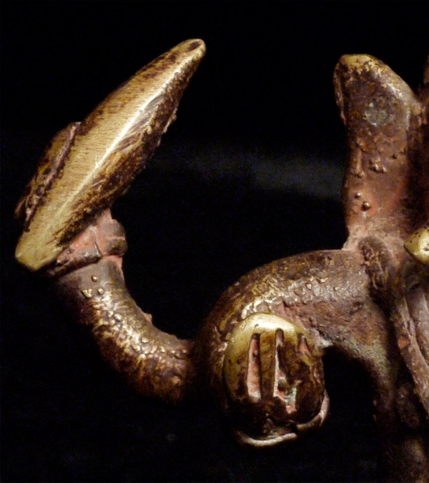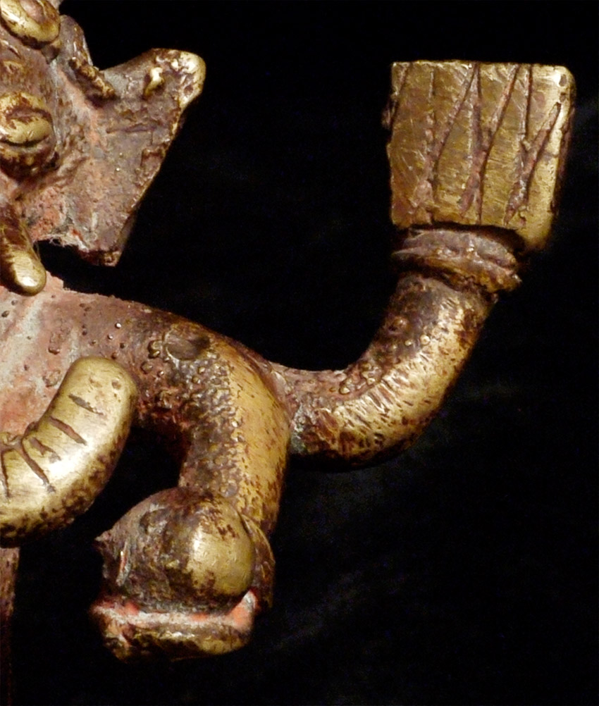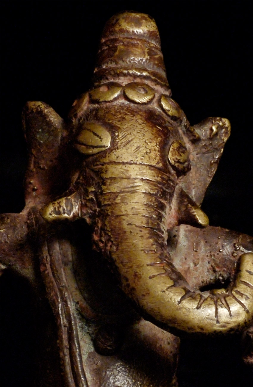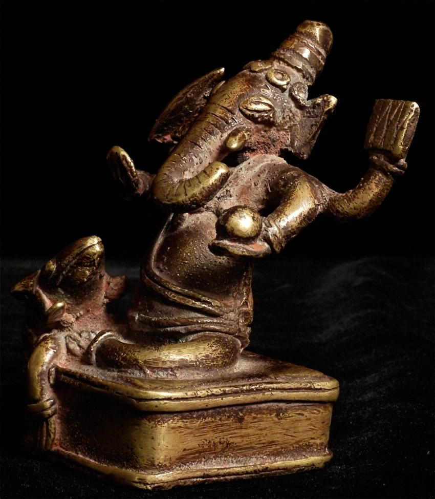 Antique Ganesh and his rat sit on a bronze cushion that measures a little over 2.25" square. The height of this piece is 4" tall. I couldn't resist this piece-note how huge the rat is- almost looks like a puppy.