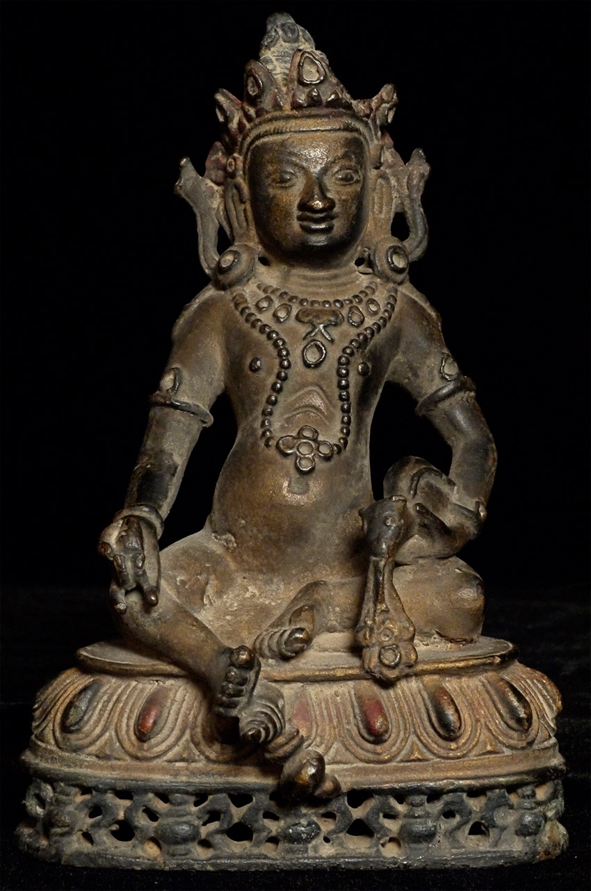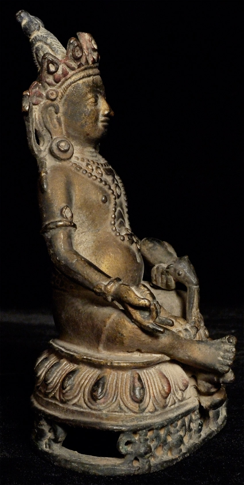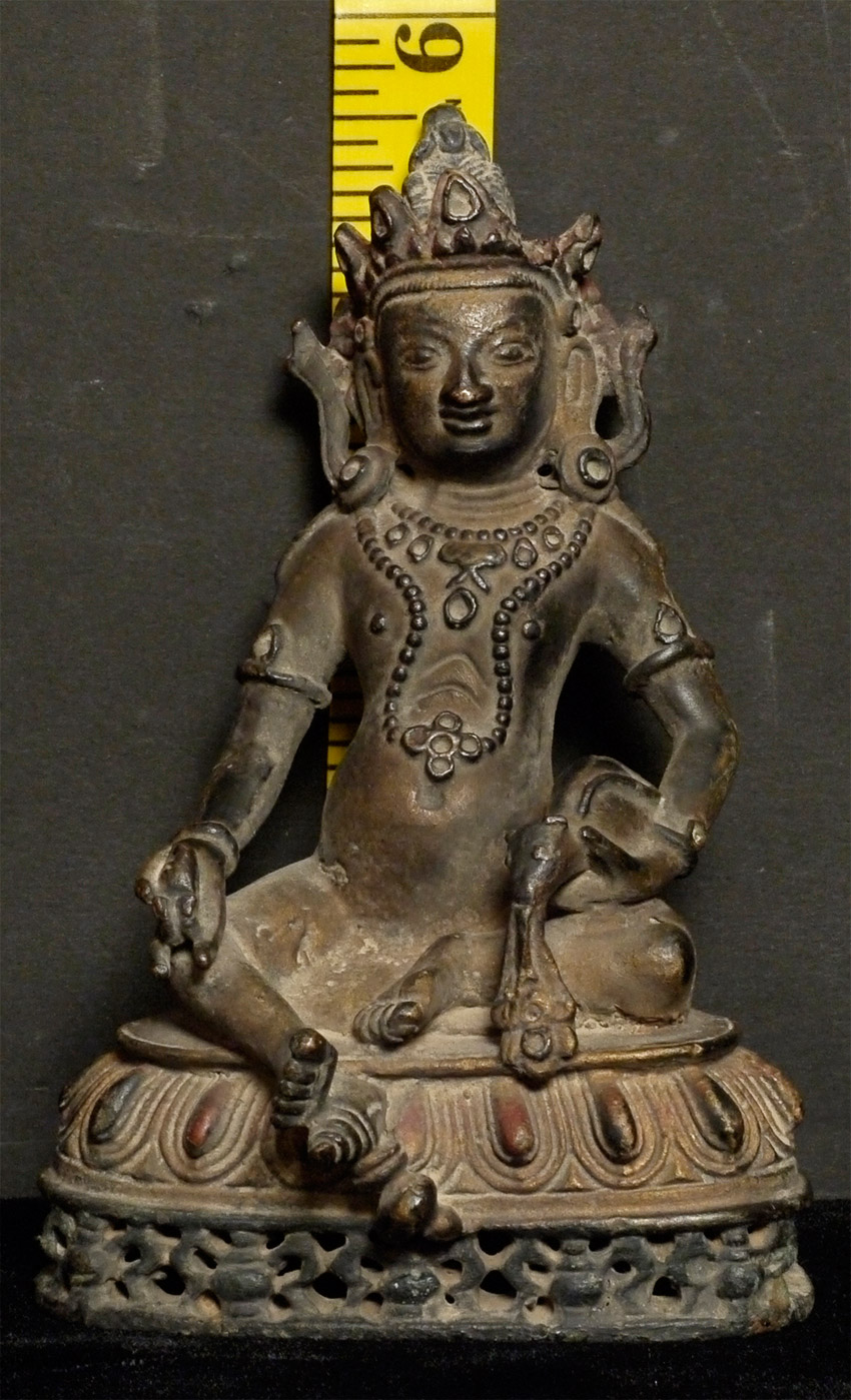 Decorative Jambala or Kubera figure- meant to bring good luck or abundance. 5.5 inches tall. This one has a particularly distinctive mongoose, which is spitting out wish granting jewels. Beautifully cast.