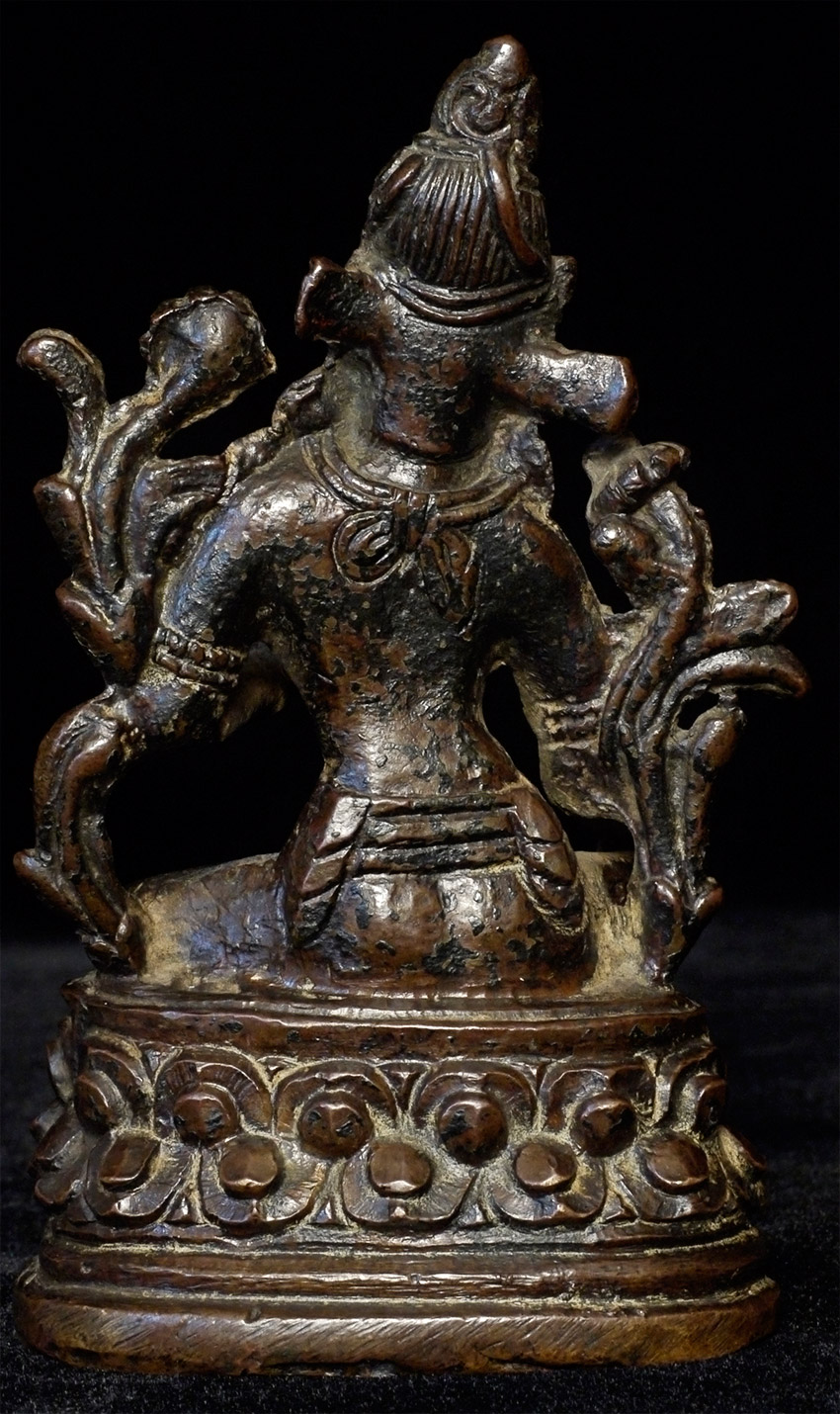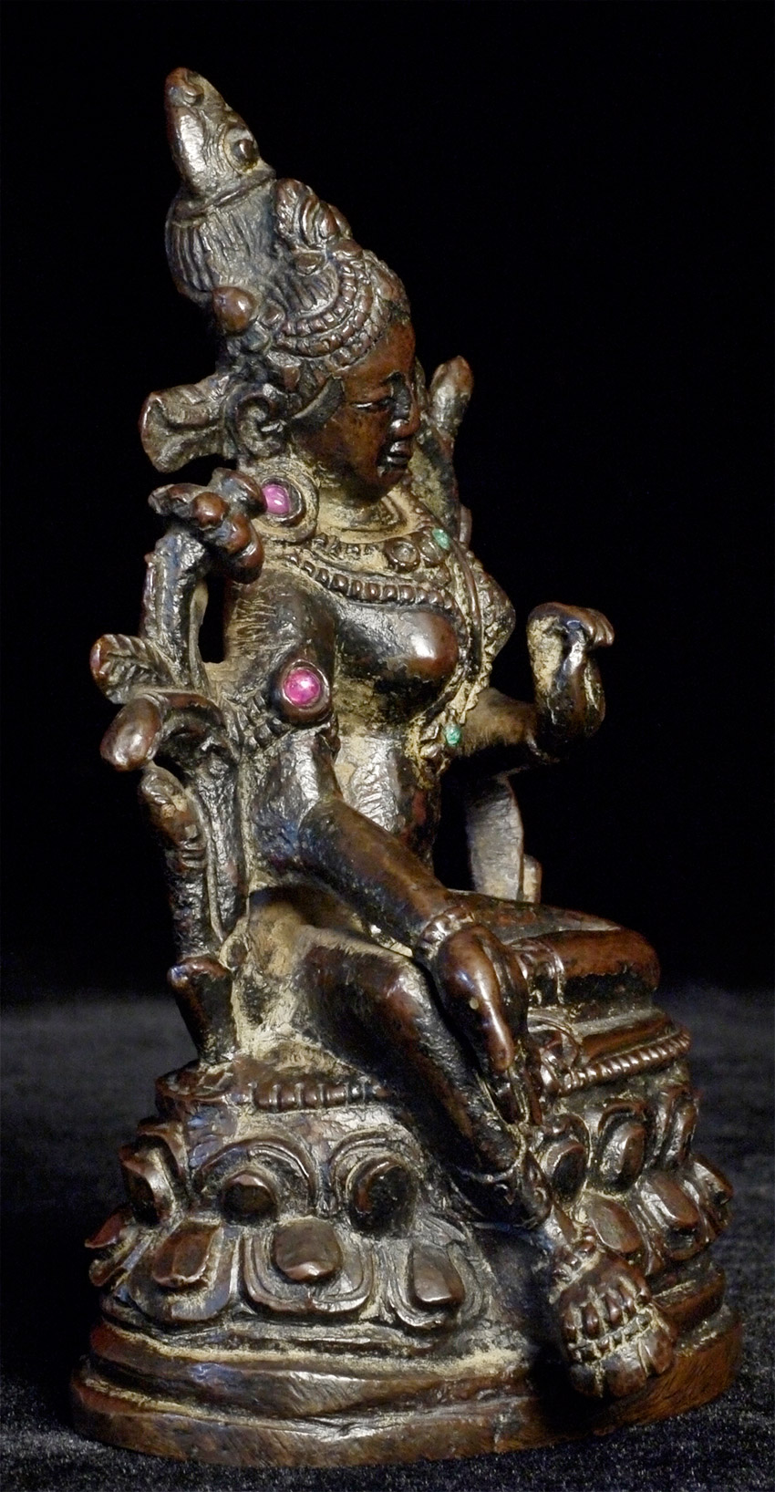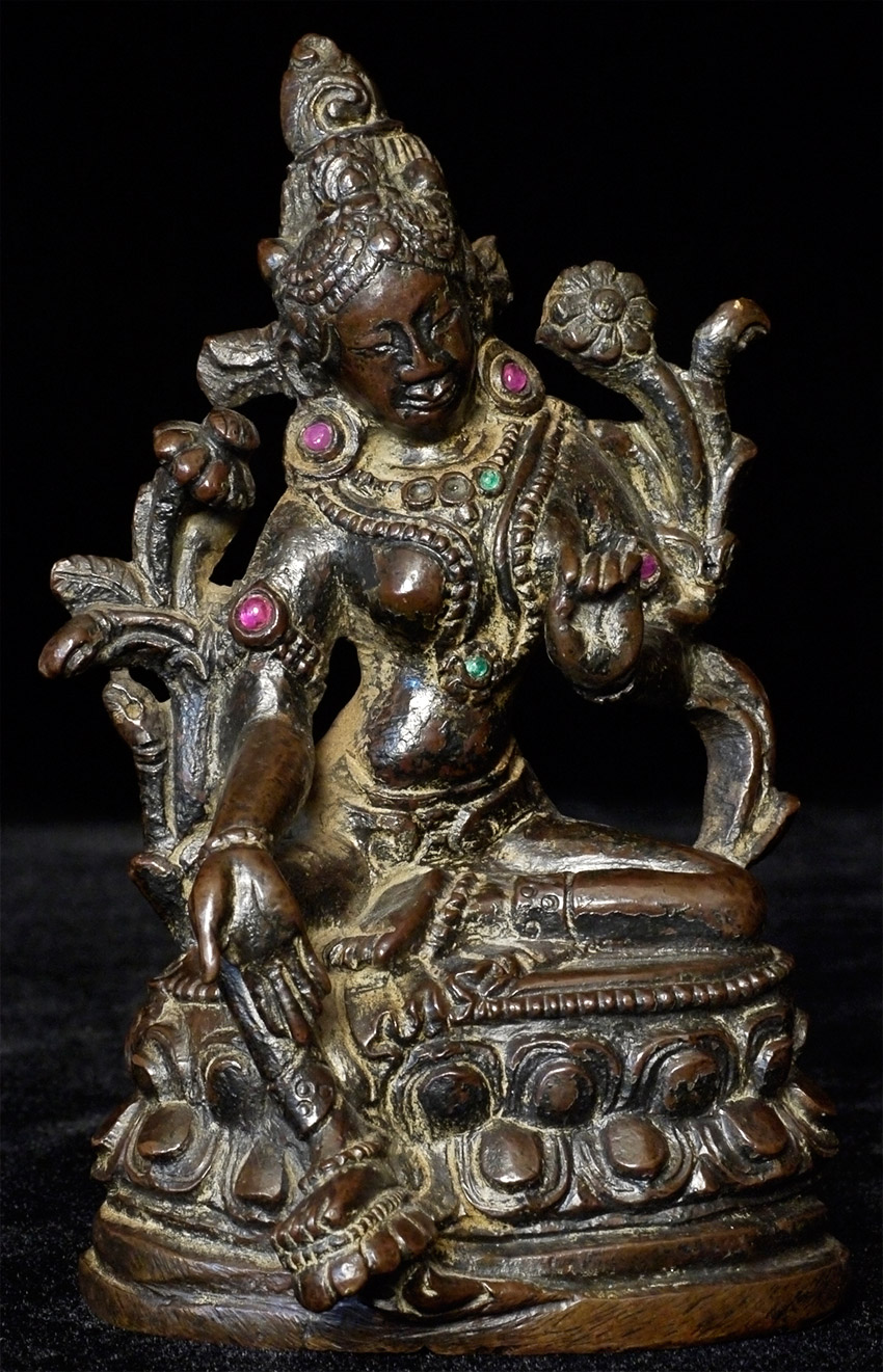 Wonderfully expressive chocolate brown antique female Bodhisattva. Likely Mongolian or Tibetan . Looks to have had a sealed base much of its life. Some stones look to be old, some newer, some possibly semi=precious, some look to be glass. Unusual type. Sits 4.5 inches tall.