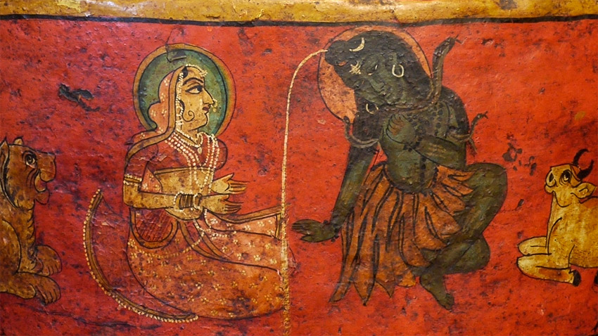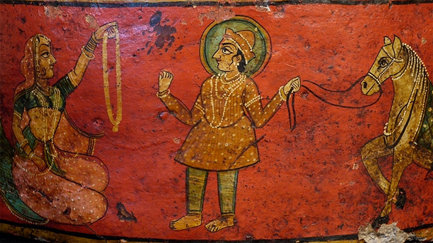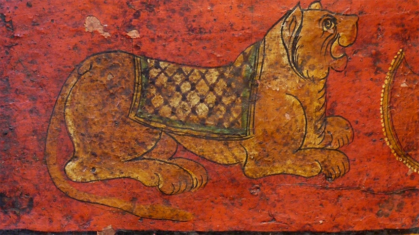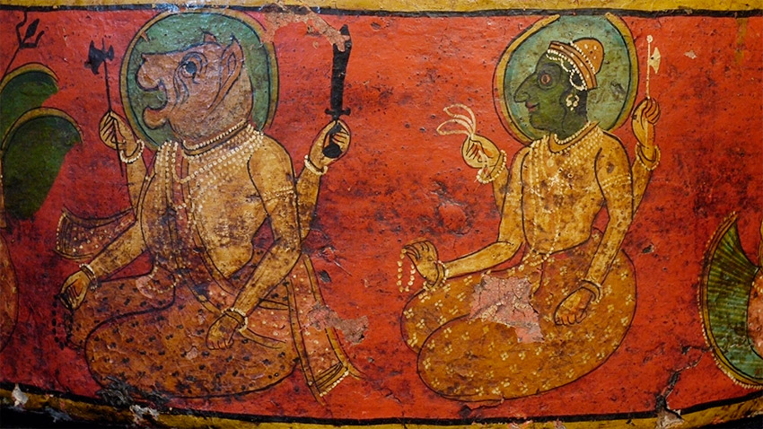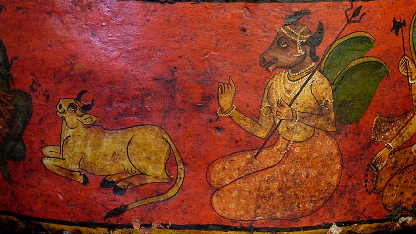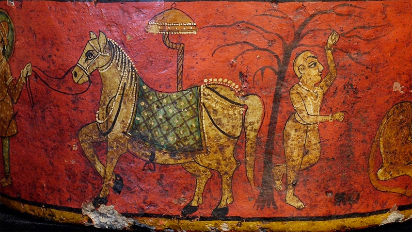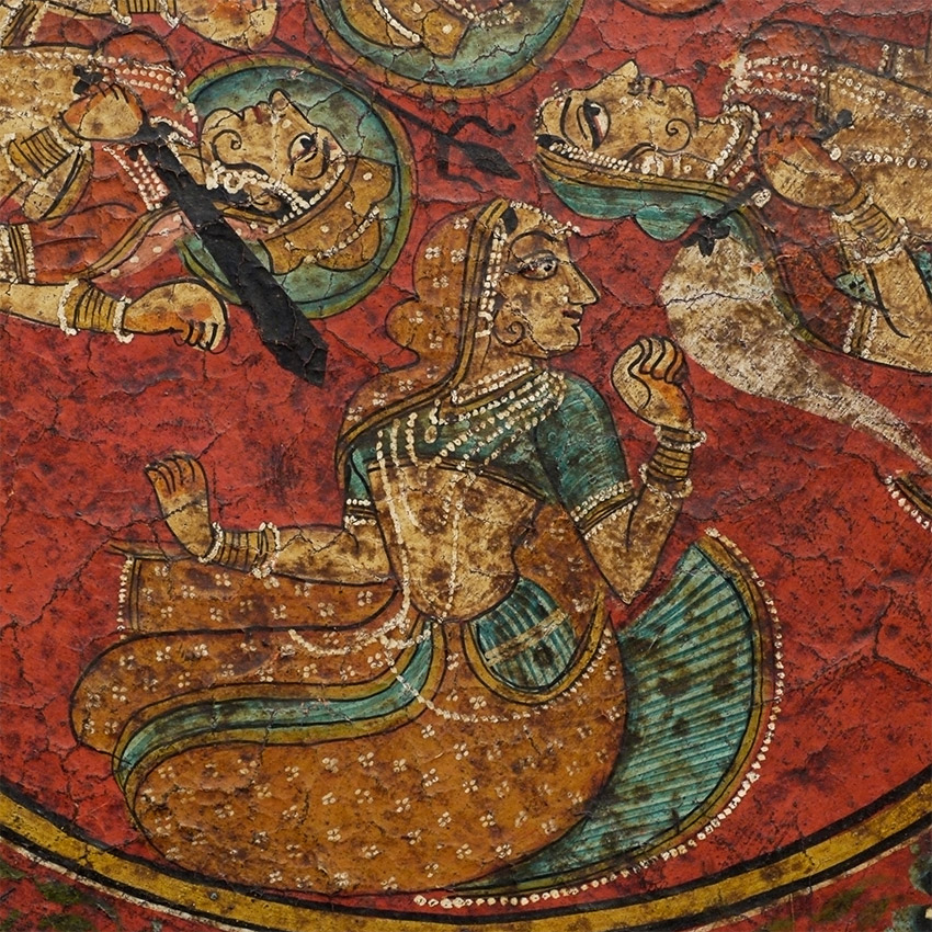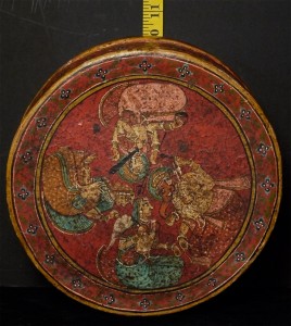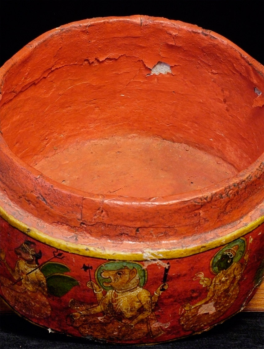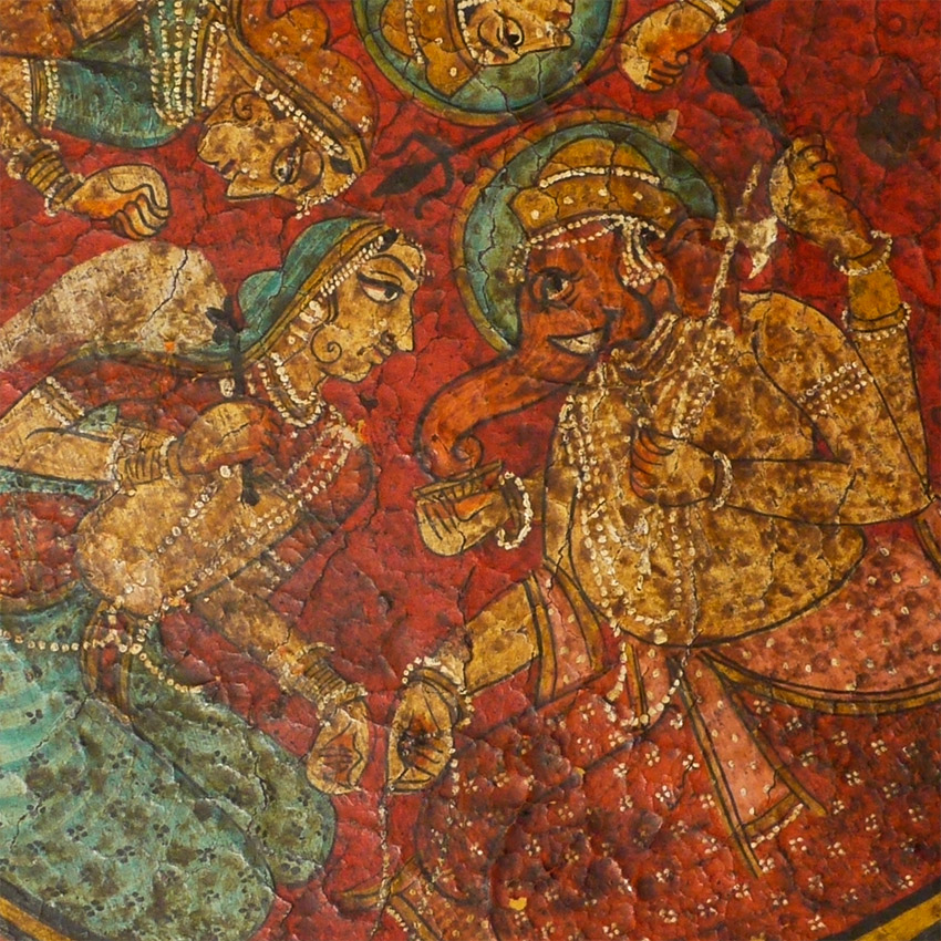 Antique Indian Box. Made of Paper Mache or other material. Looks to have good age. Beautiful painting all around. Excellent condition, especially considering how delicate the materials are. Appears to have never been used, which is the only reason it is still intact in such beautiful condition. Size is 10 inch diameter, 6 inches tall.