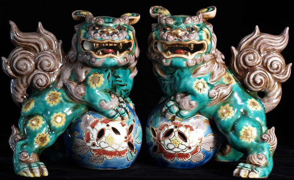 Fabulous pair of antique Foo dogs from a wealthy Canadian estate- They are some of the most expressive and finely sculpted and decorated of this type I have seen in a long time. Condition is superb, with no loss or damage I can see. I do not know the meaning of the numbers on the bottom of the feet. The are 7.25 inches tall by 6 inches long by 5 inches wide. Animated, high quality- far above the usual.