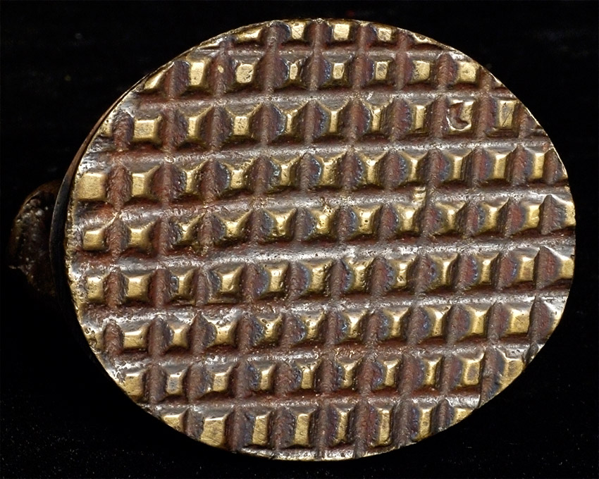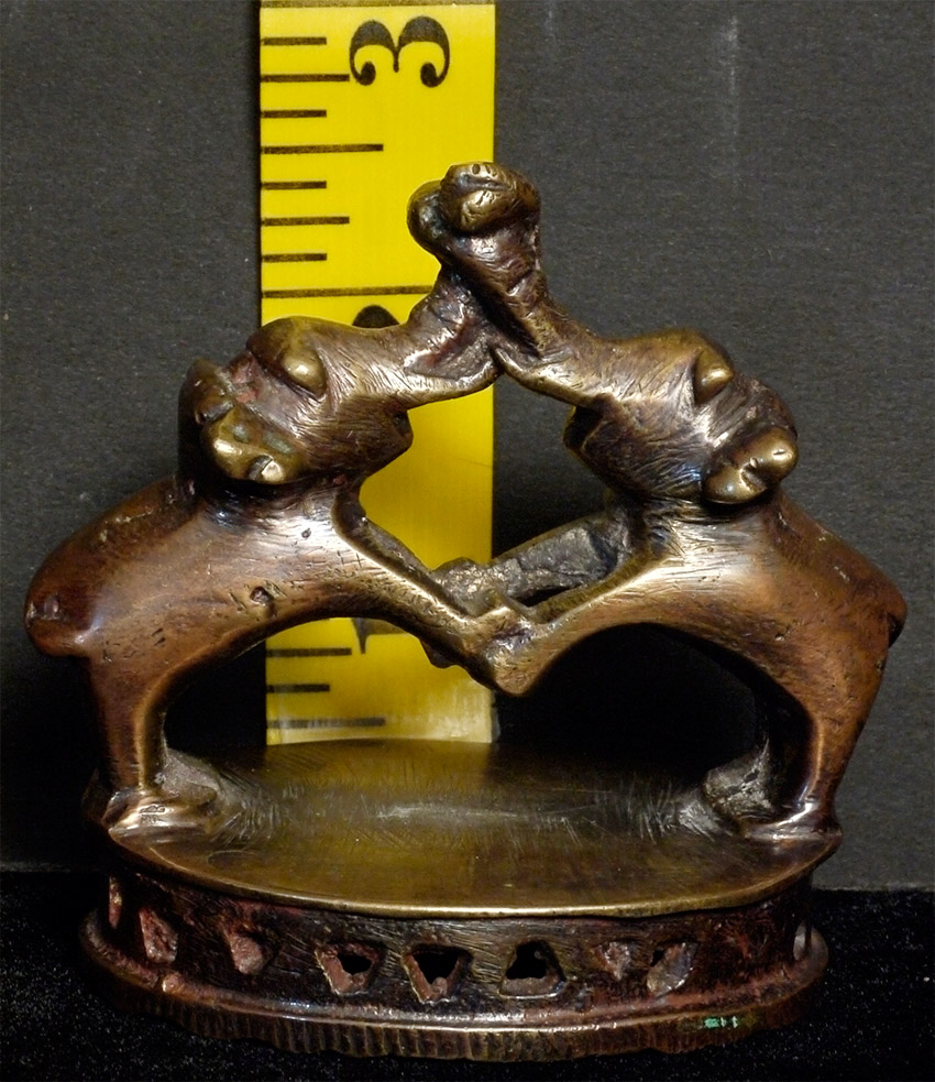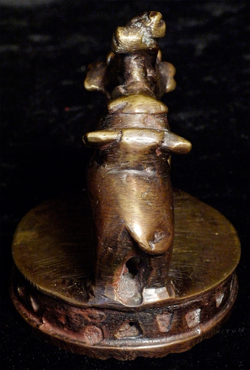 Antique Indian bronze design stamp of entwined elephants with rattle inside. Size is 2-5/8 inches tall, bottom measures approximately 2 x 2.5 inches.
