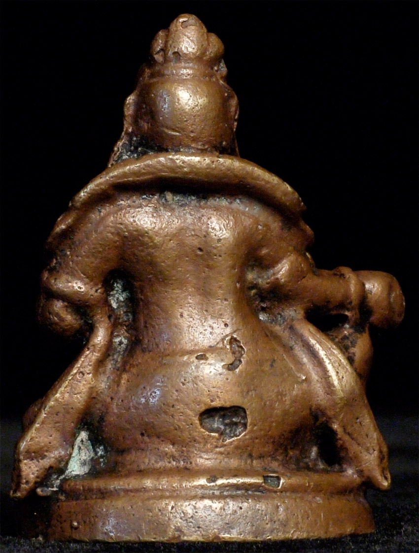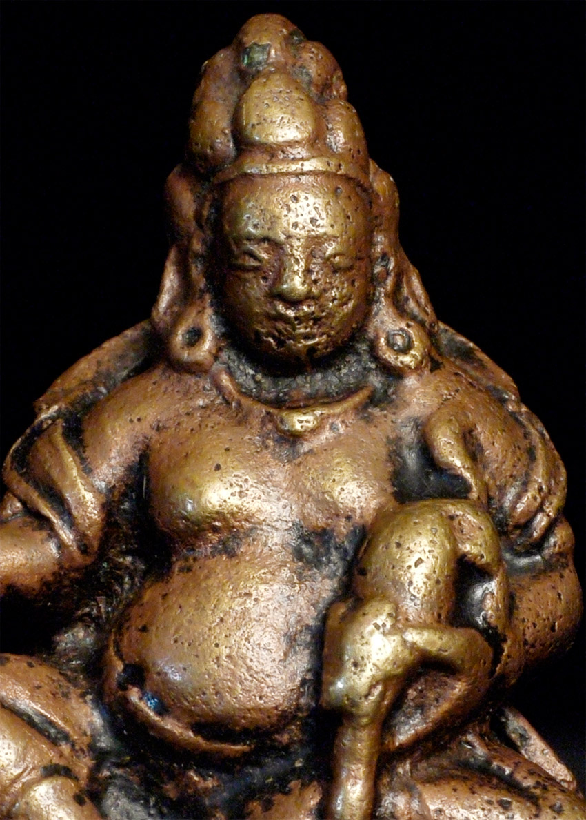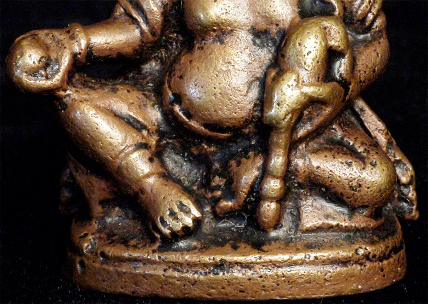 Very early Jambala with his pet mongoose, who spits wish granting coins. Small at 1.75 inches tall. Extensive wear as seen in the photos, though an echo of the face shows clearly in the shadows. Powerful and serene figure.