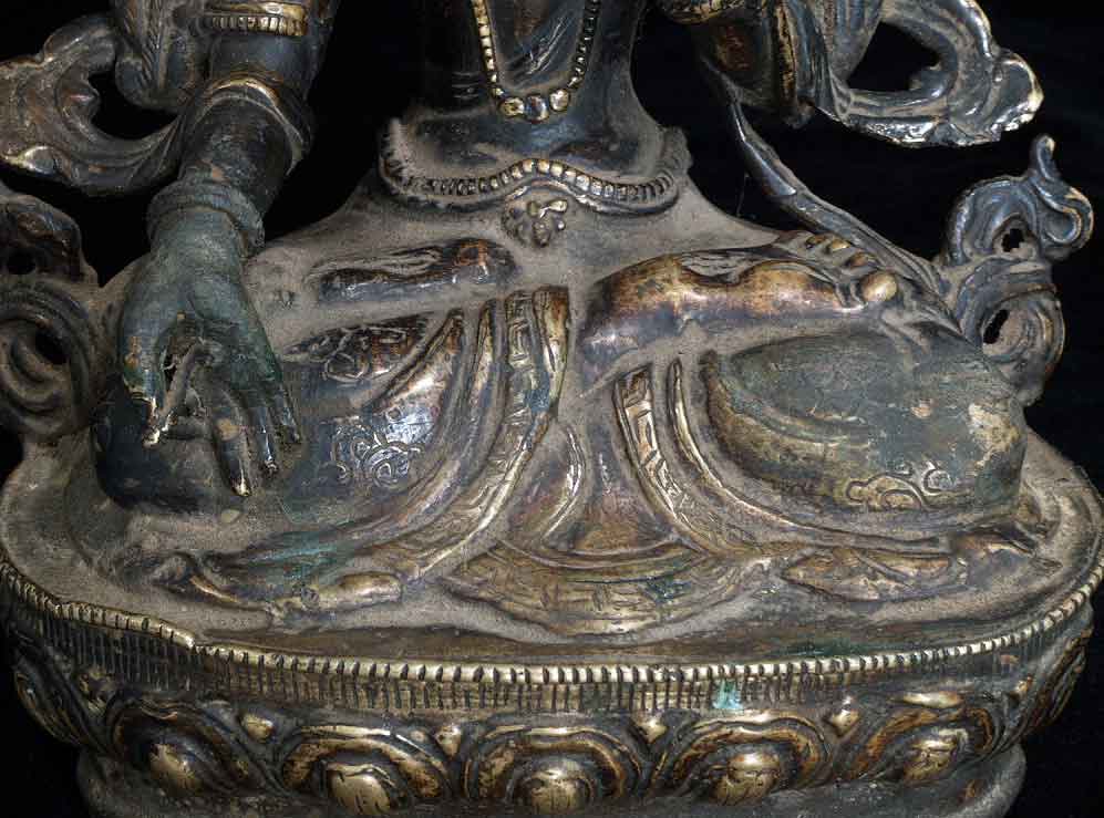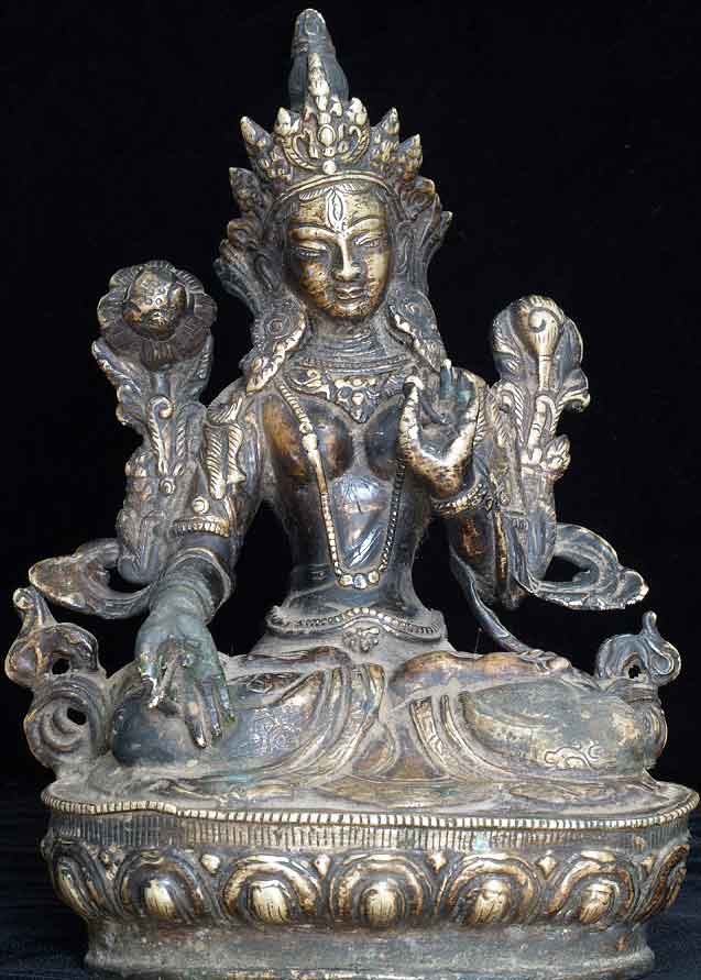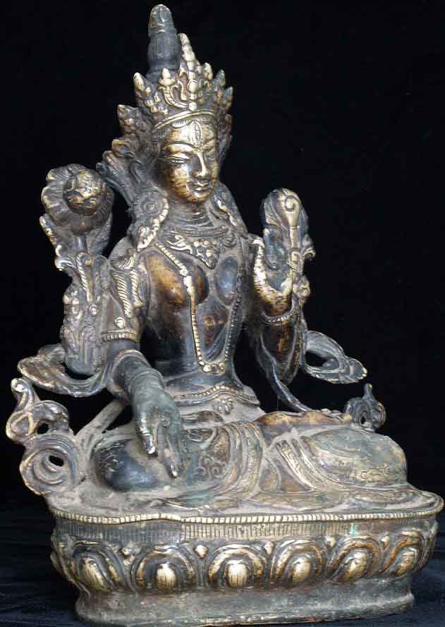 Nice sized 18/19thC Nepalese Tara. She shows evidence of generations of devotion. She was re-consecrated long ago in Nepal, with a piece of wood used to seal the contents in to the bottom rather than the traditional copper plate. She sits 0ver 8 inches tall by 6 inches at the widest, and is extremely heavy.