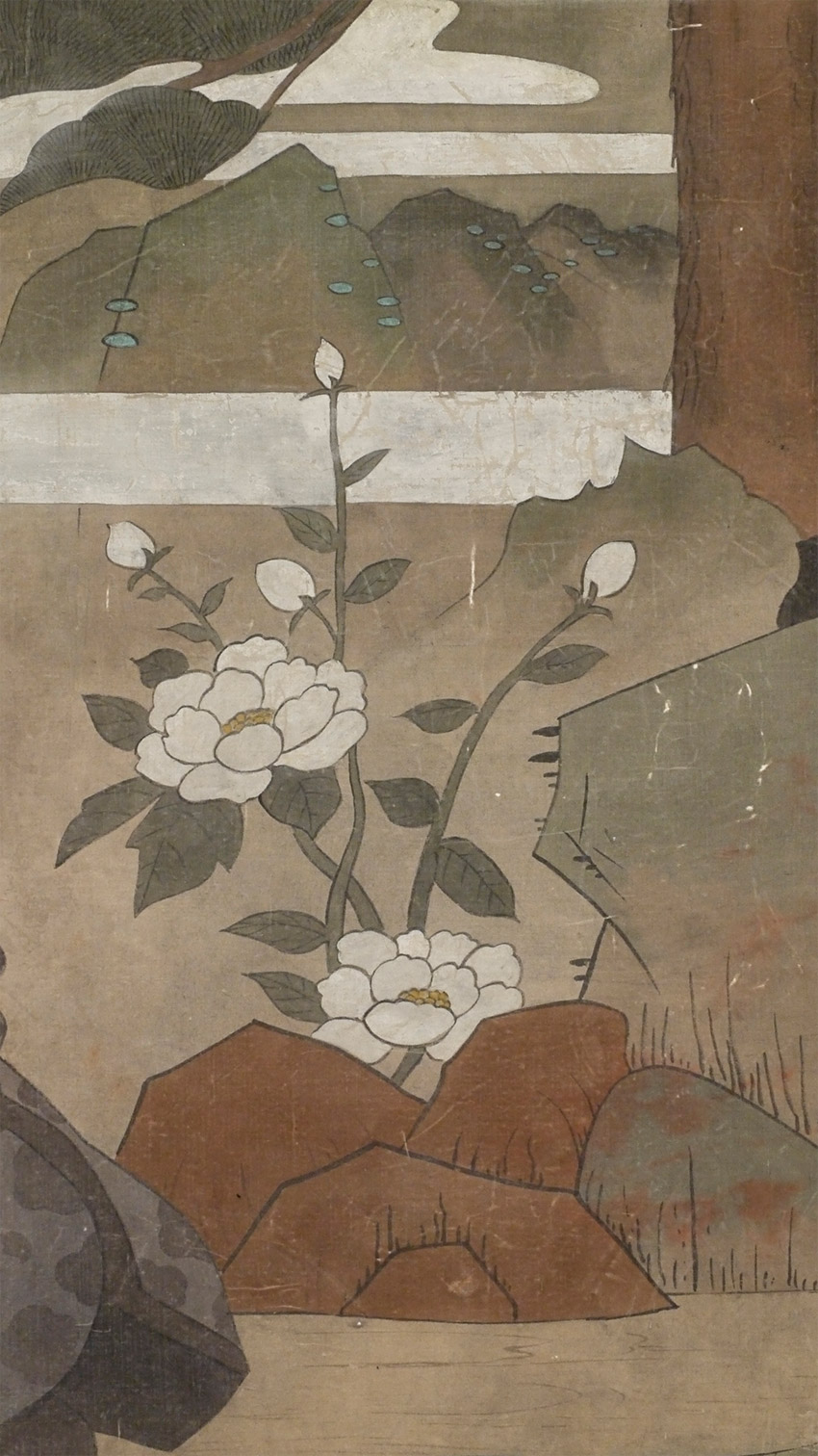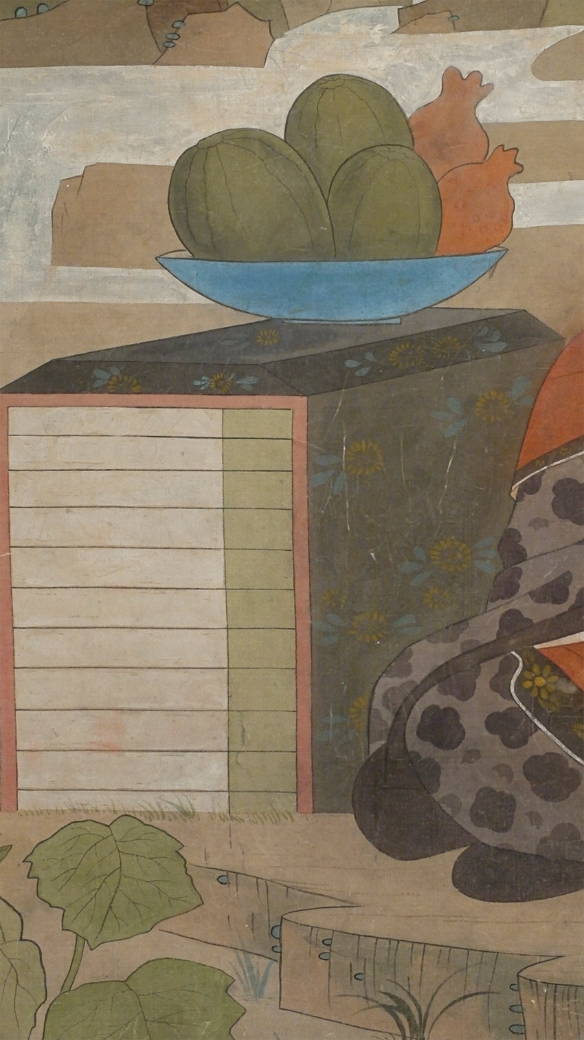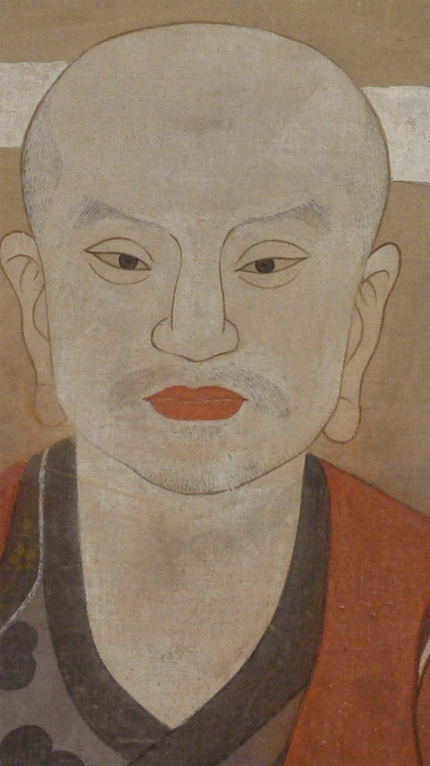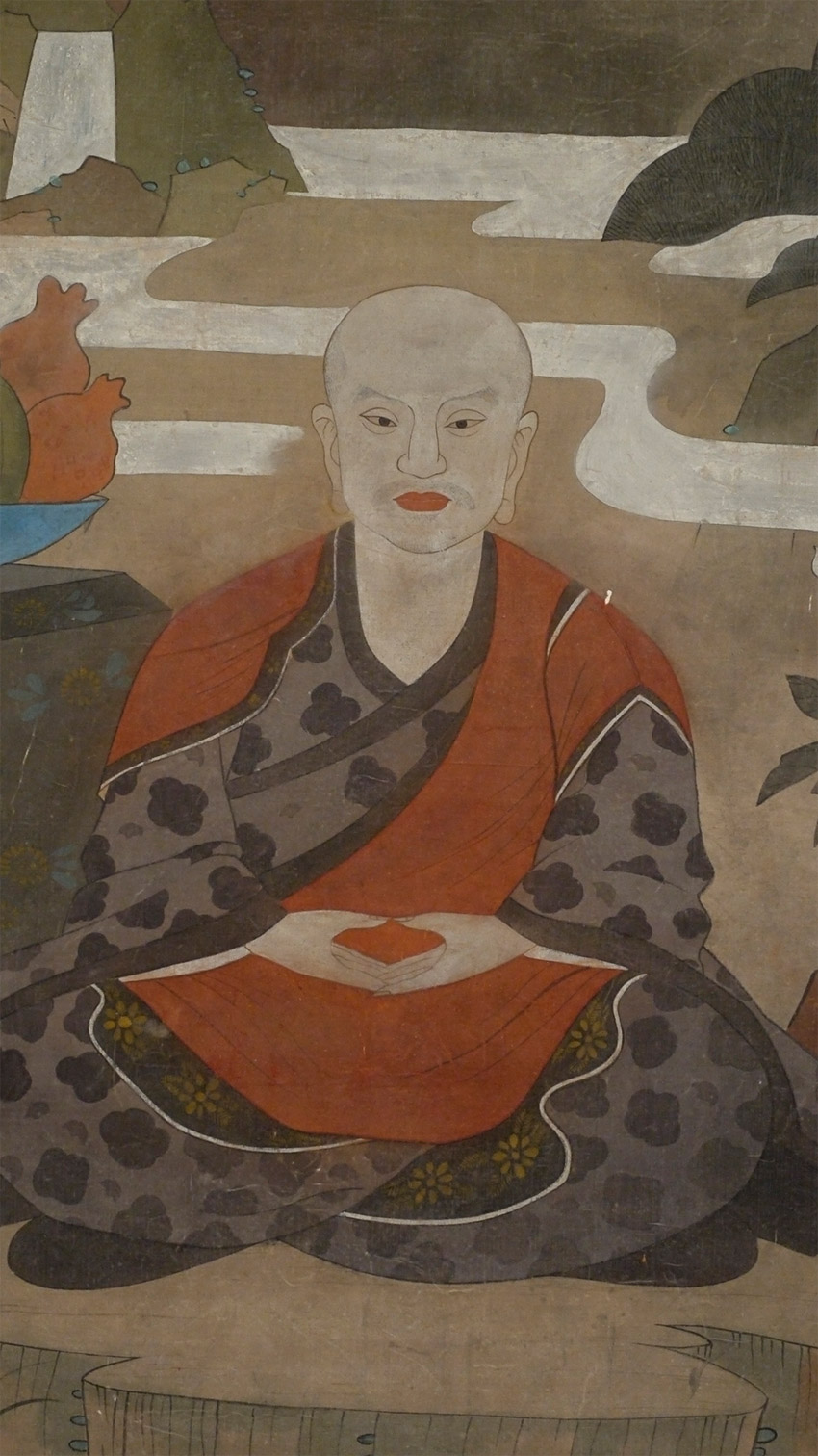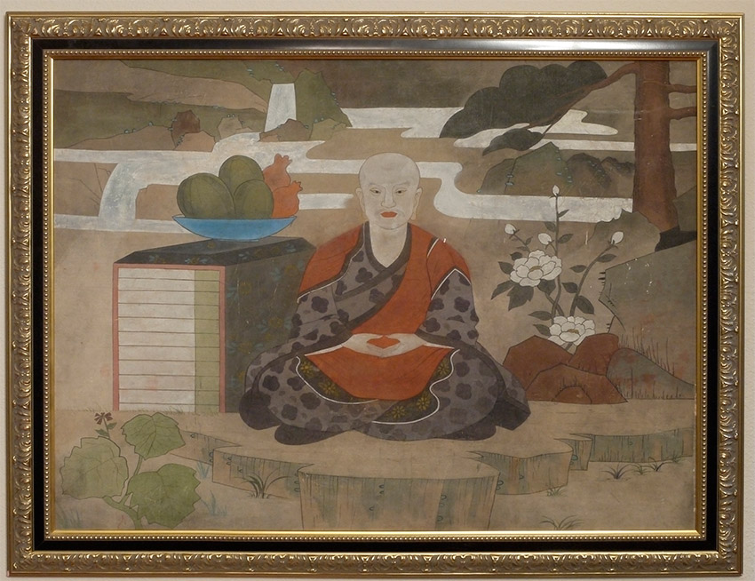Serene Korean Monk Painting. Some loss/dings/condition issues as seen in the photos, and a miss-matched frame, but this large original painting (32.75 x 42 x 1.25 inches) is very beautiful.