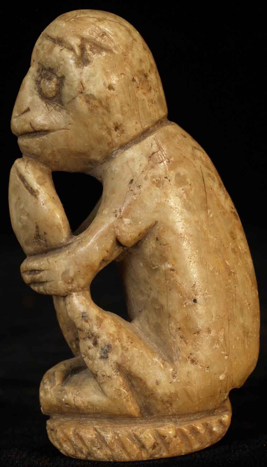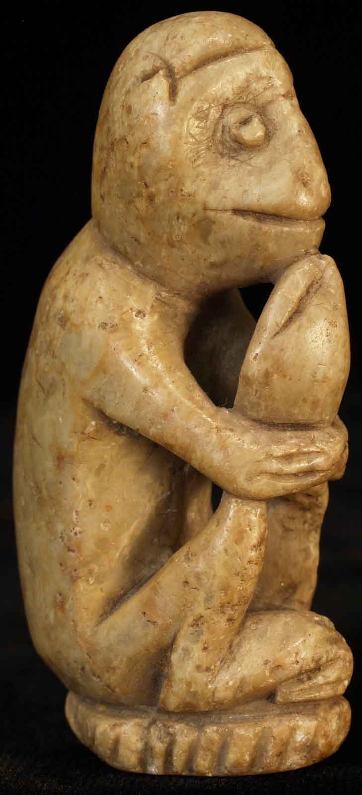 Wonderful old carved stone monkey with lotus- estate item- not a modern repro- looks to have been buried. 2 and 5/8ths inches tall. 18/19thC or earlier