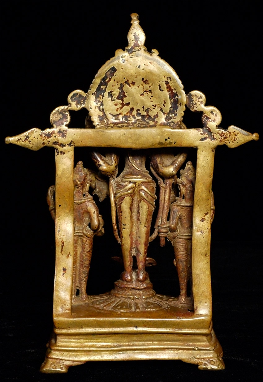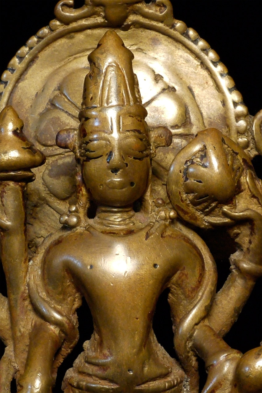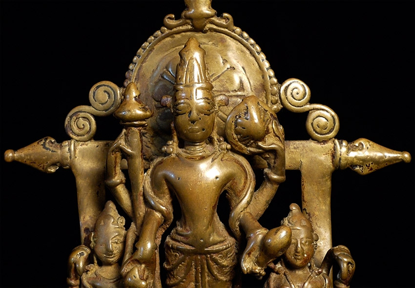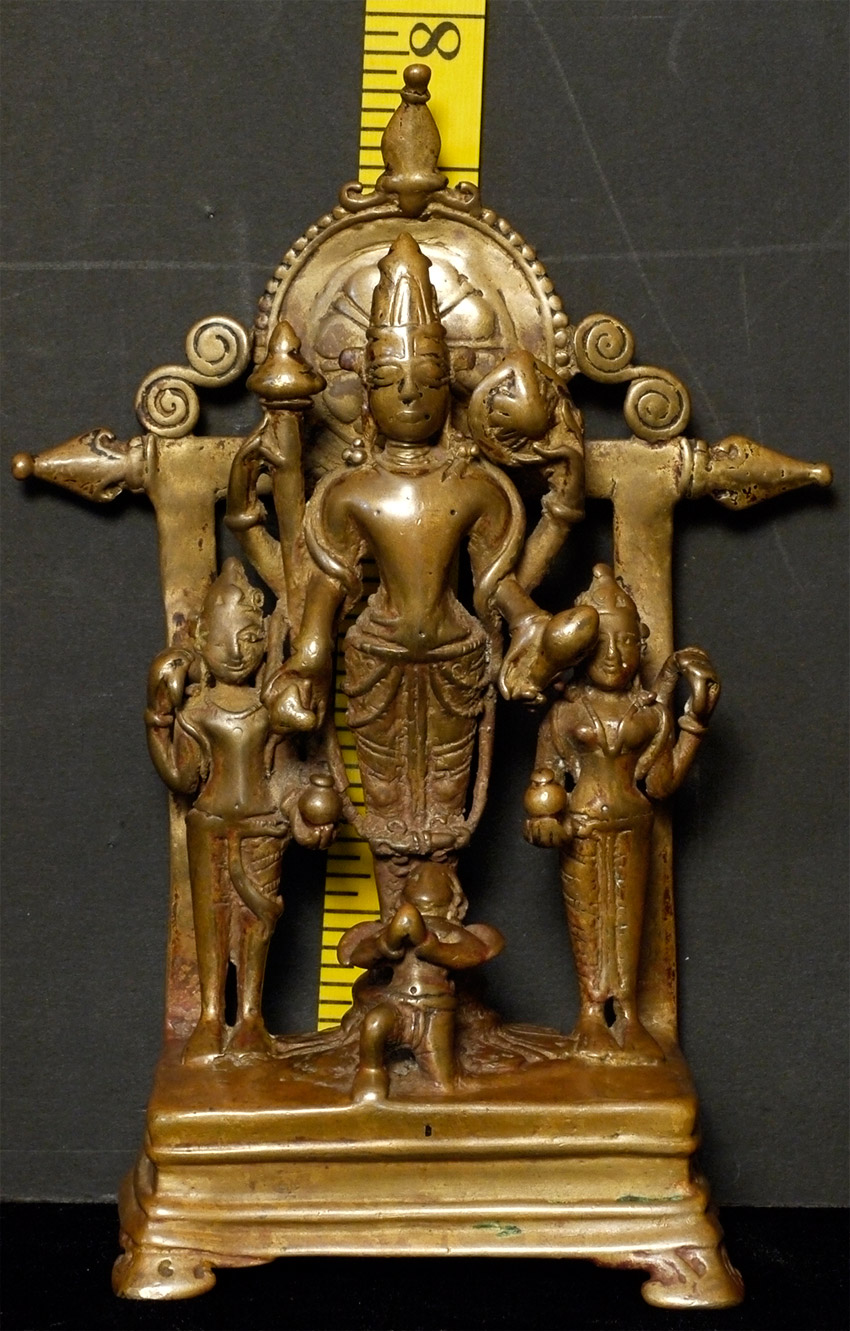 EARLY Hindu Shrine of Vishnu and Attendants. Figures are solid cast, though they (and the back-plate) are incredibly thin (hard to see inside the back)- they appear to have been made at an early time when metal was scarce. Stands a full 7.75 inches tall. Has Los Angeles County Museum of Art loan collection label affixed to the underside. Typical ritual wear, though the deeply serene expressions on the faces still shine brightly. Powerful spiritual art.