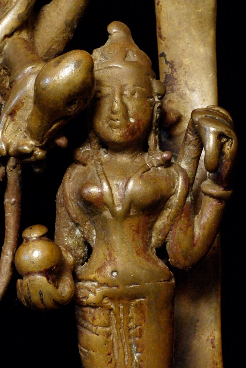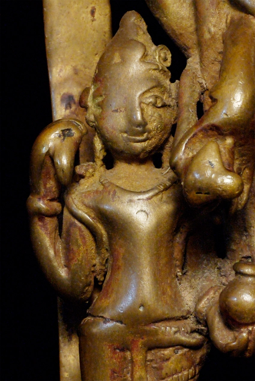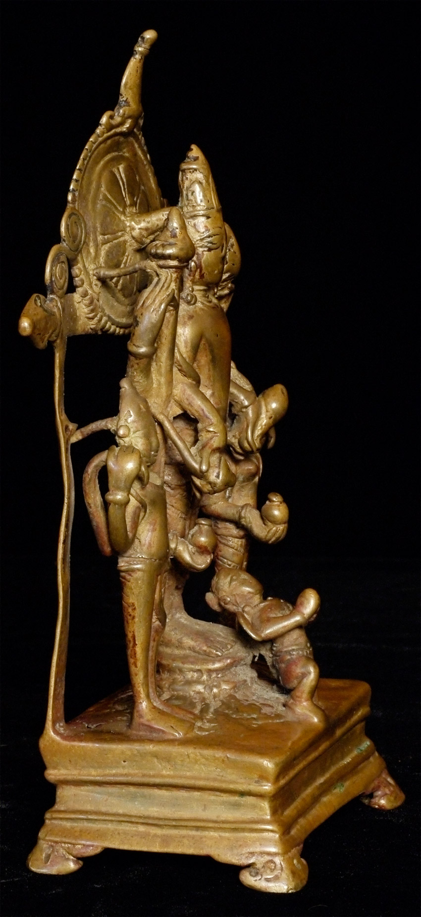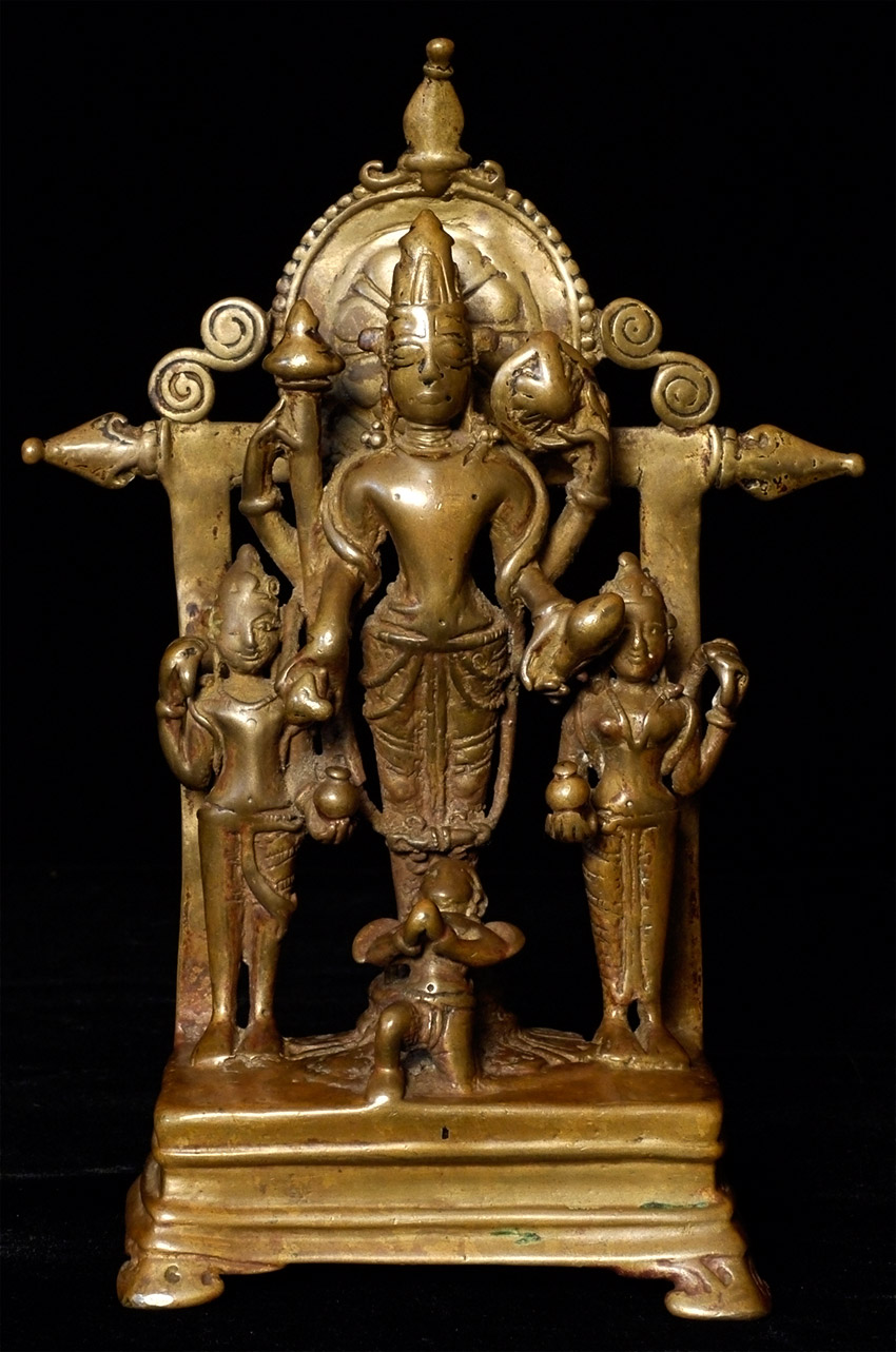 EARLY Hindu Shrine of Vishnu and Attendants. Figures are solid cast, though they (and the back-plate) are incredibly thin (hard to see inside the back)- they appear to have been made at an early time when metal was scarce. Stands a full 7.75 inches tall. Has Los Angeles County Museum of Art loan collection label affixed to the underside. Typical ritual wear, though the deeply serene expressions on the faces still shine brightly. Powerful spiritual art.