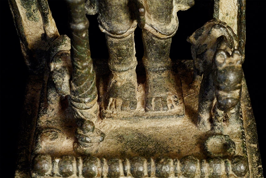 Superb 16th-18thC Vishnu shrine, with an exquisite jade green patina not usually found on Indian bronzes. Stands 7 inches tall, with Los Angeles County Museum of Art loan collection label on the underside. Far more complex and uncommon than the vast percentage of Hindu shrines.