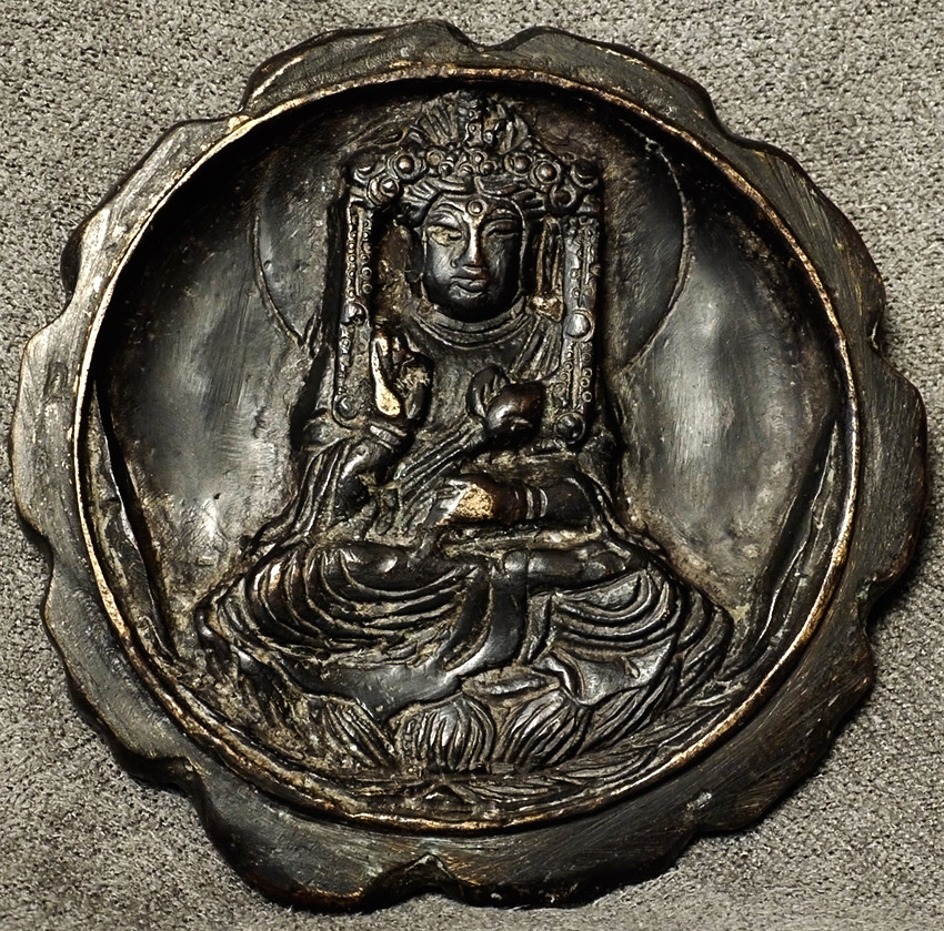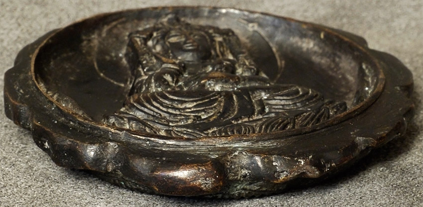 Edo period bronze Japanese pocket shrine. Unusual to find this type in bronze. Size is 2 and 1/8 inches diameter.