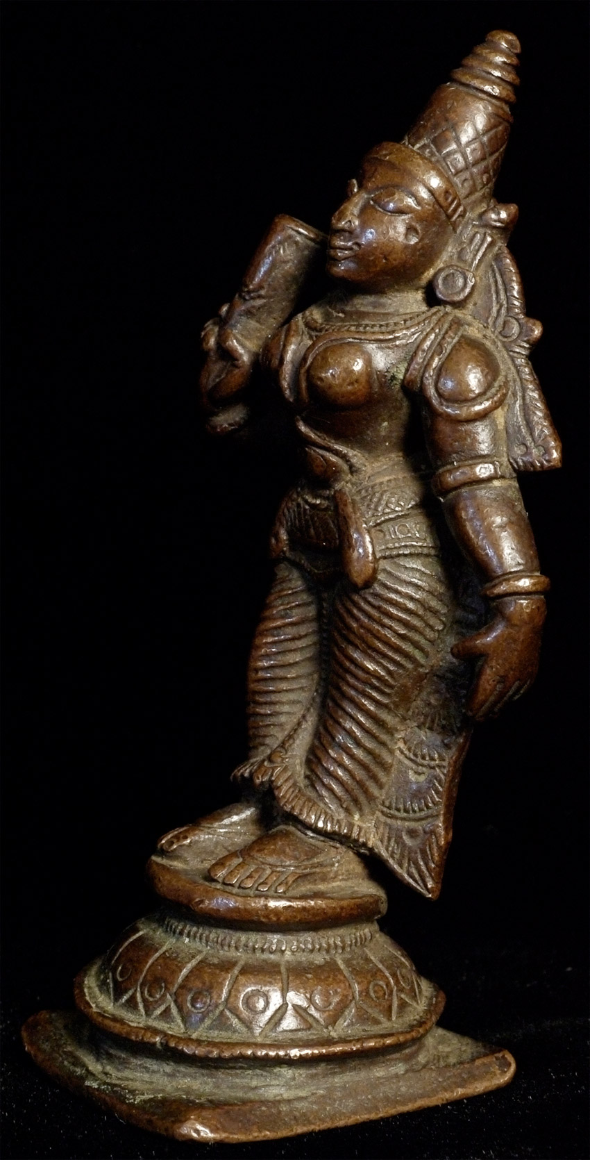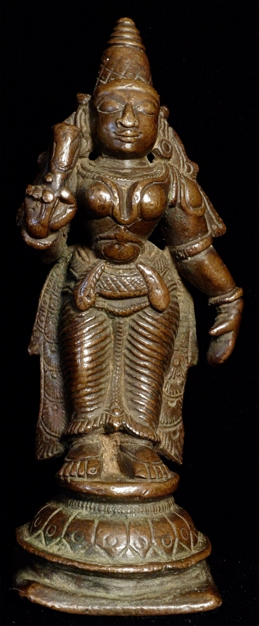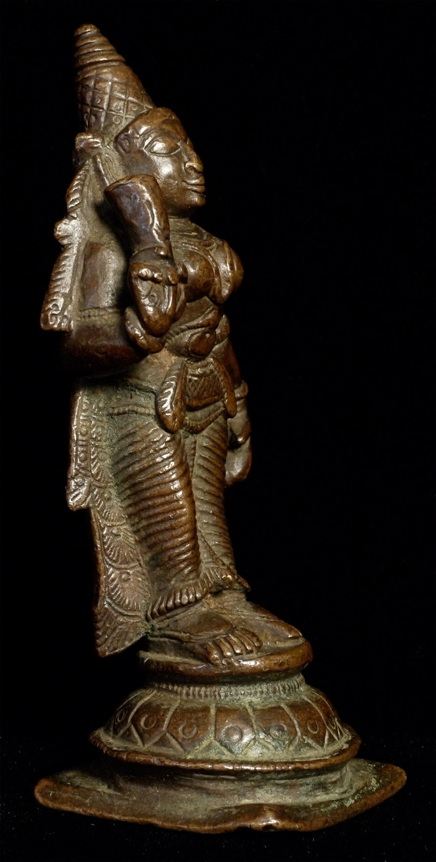 Lovely antique bronze Hindu figure. Just shy of 3 inches tall. Deeply serene and joyful expression. Far nicer than usual.