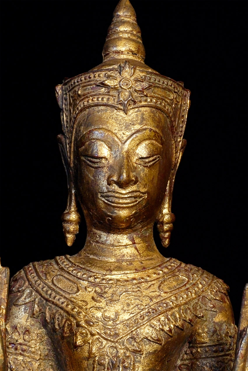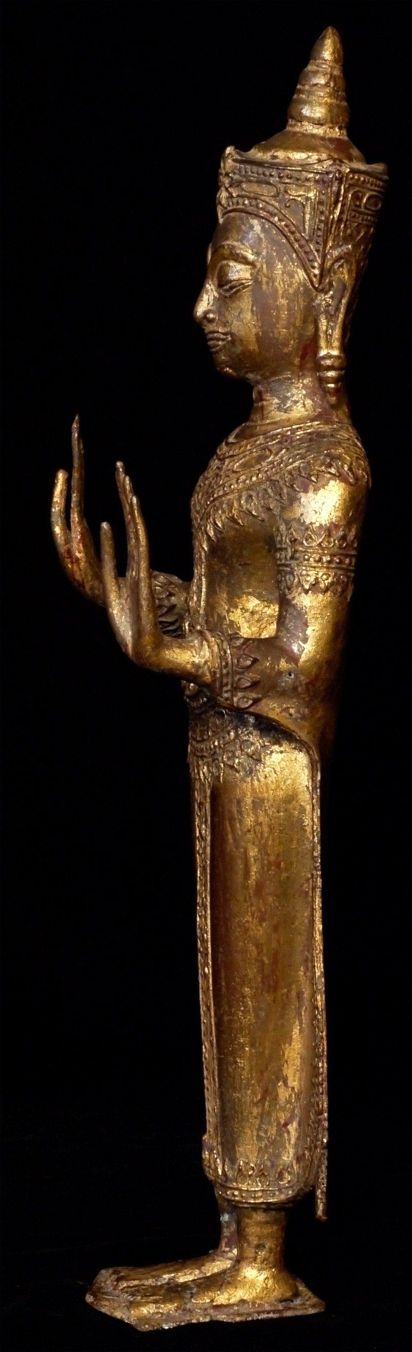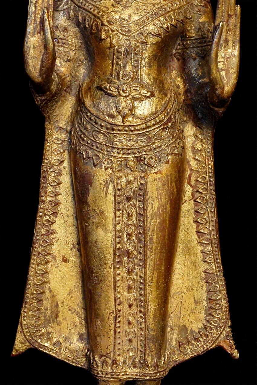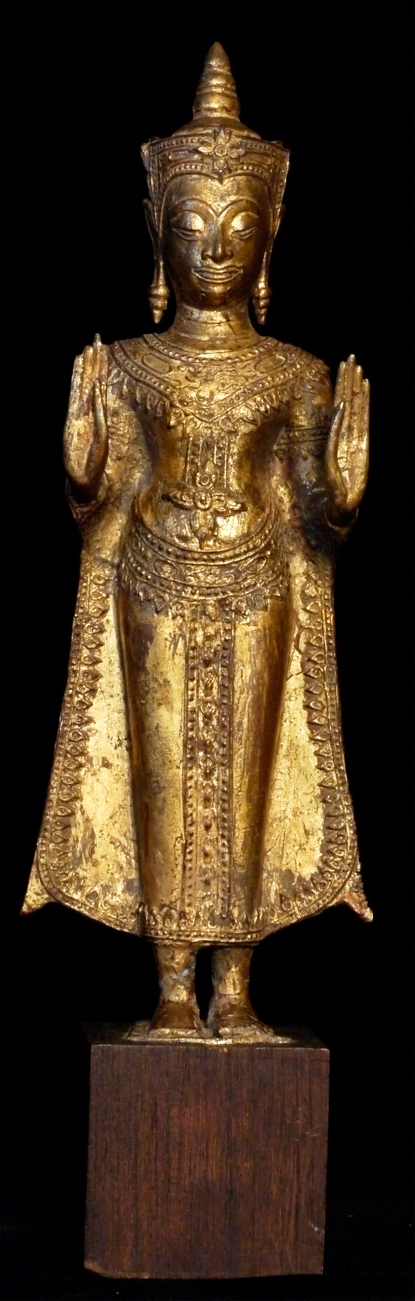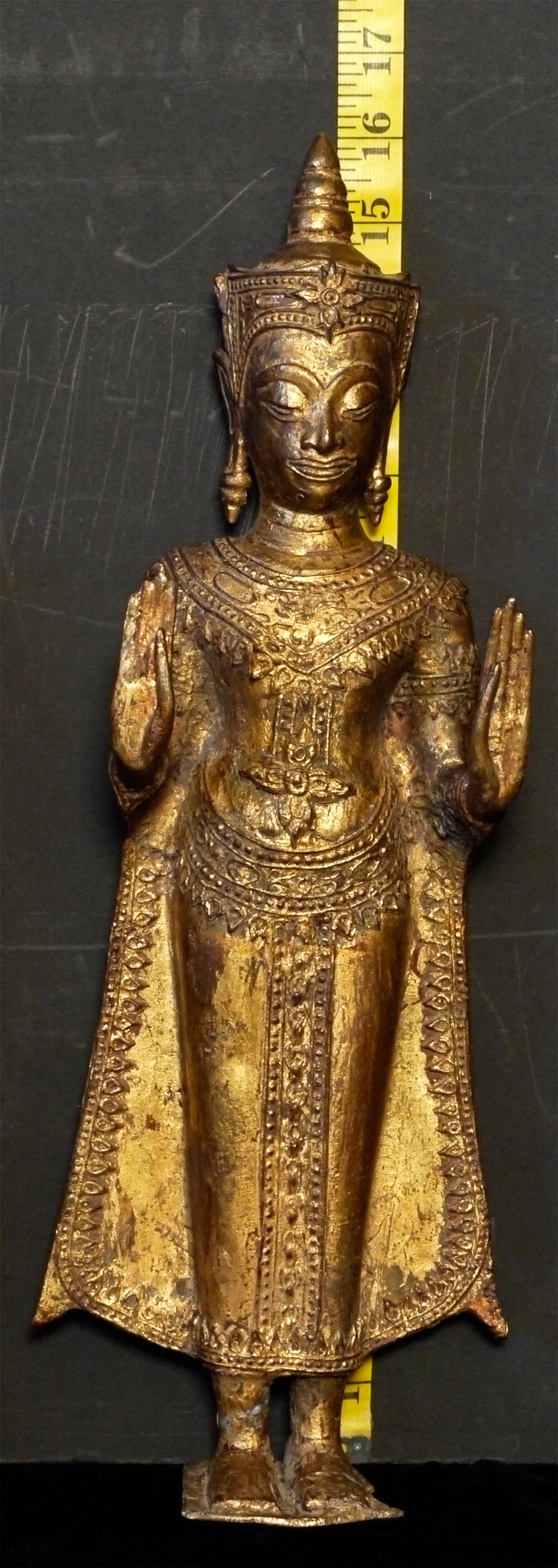 Just over 16 inches tall. Thai Standing bronze Ayuthaya style Buddha. Twentieth example in a 17th/18thC style. Crack in foot, but appears stable. Needs to be reconnected to stand (tiny nails or other method to be decided by new owner). Priced to sell.