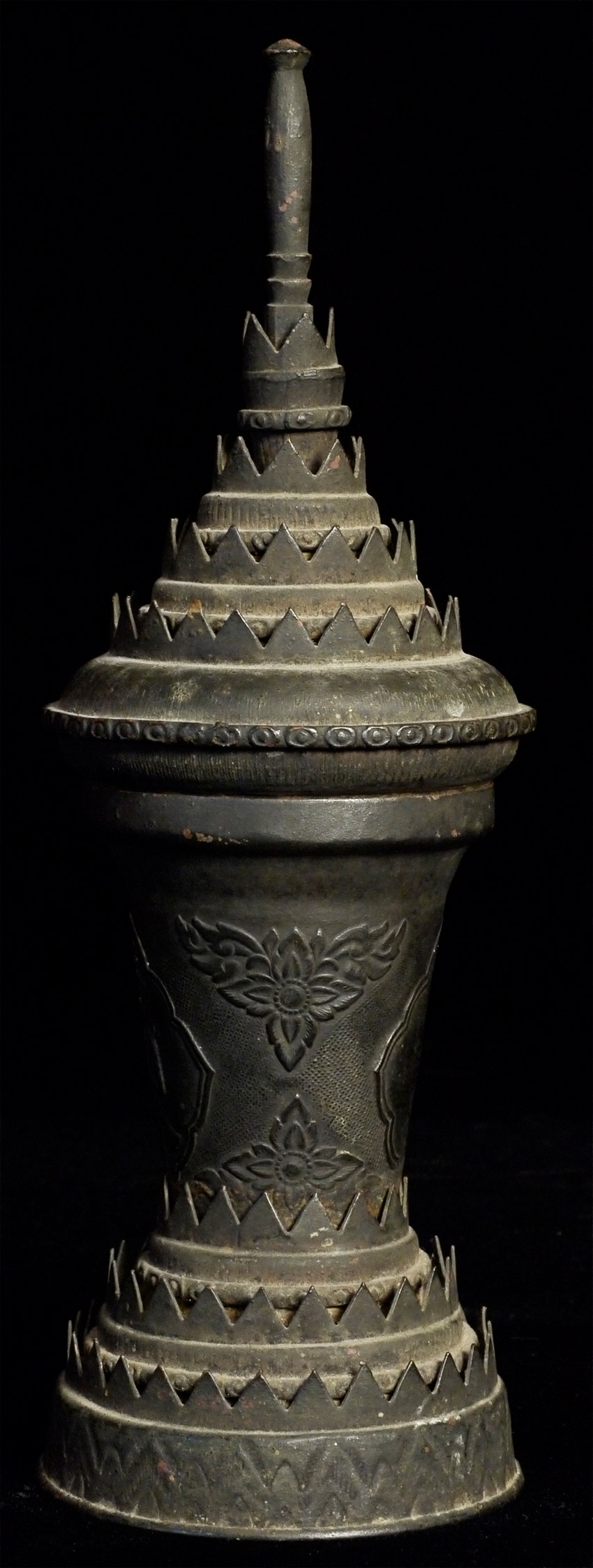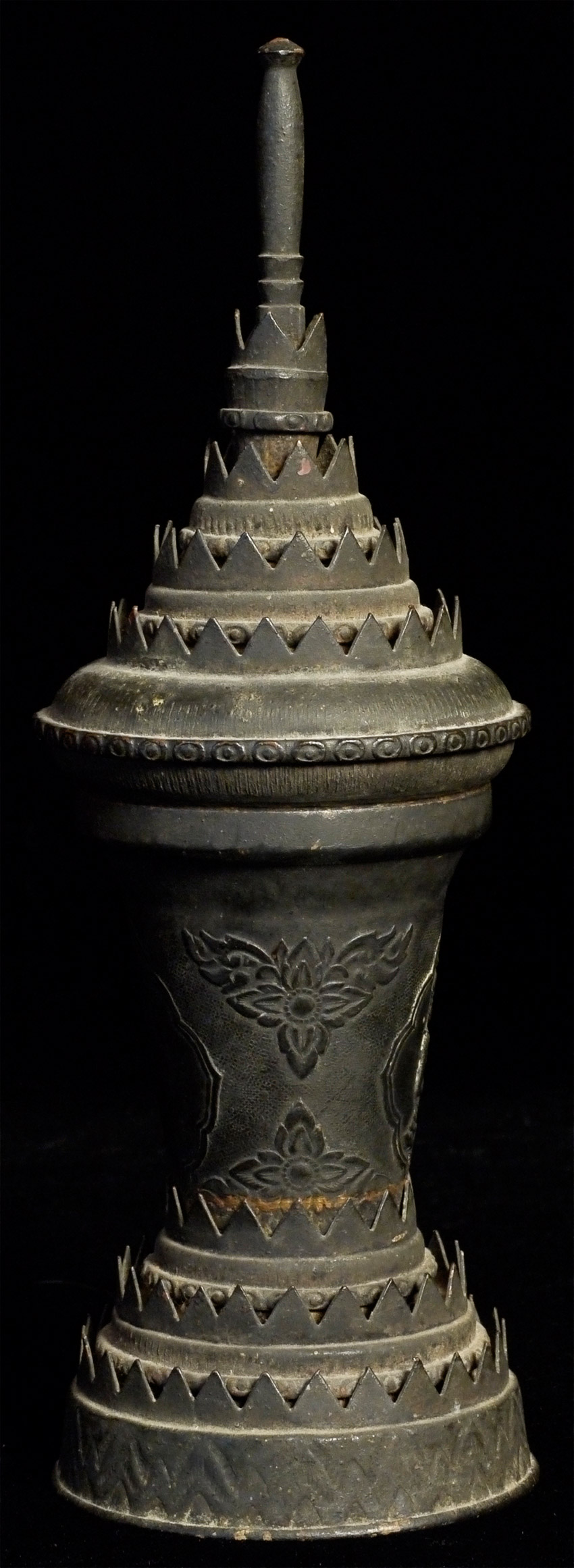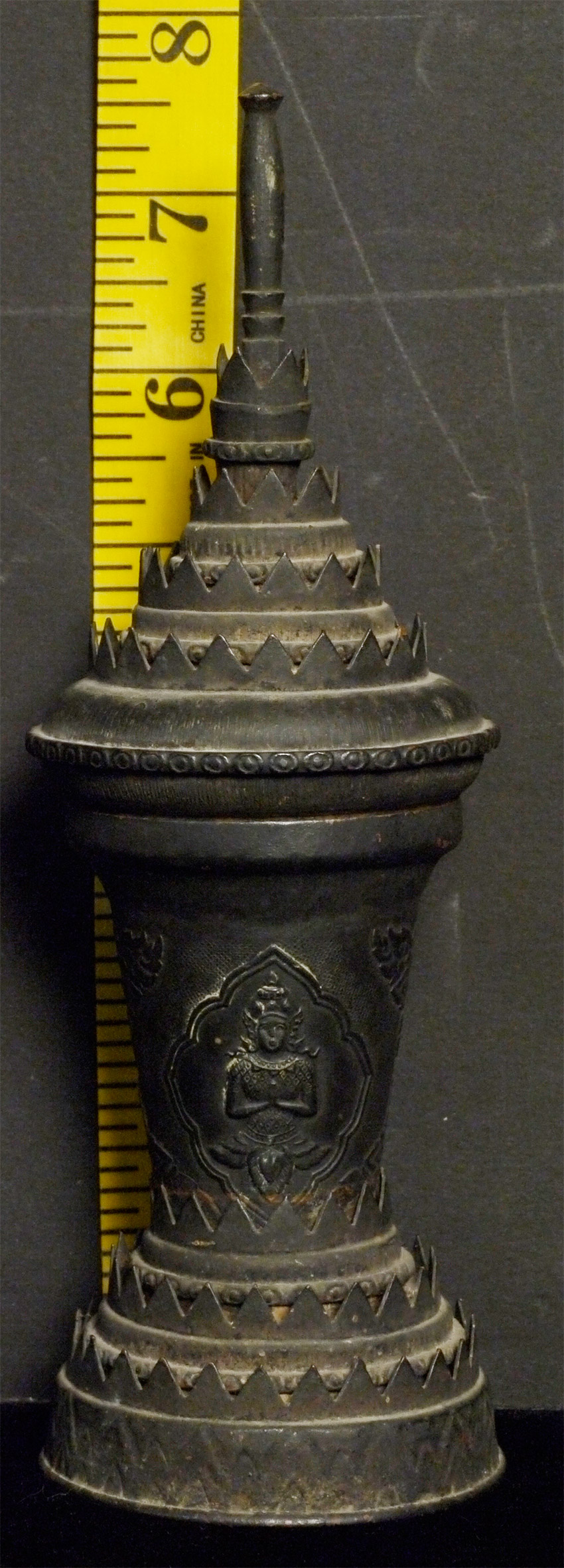 Old 72% silver Thai Buddhist reliquary. Intricate, and made of many parts, it is in complete and unused condition. Even the nuts are solid silver. 6-5/8 inches tall.