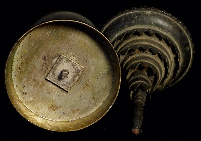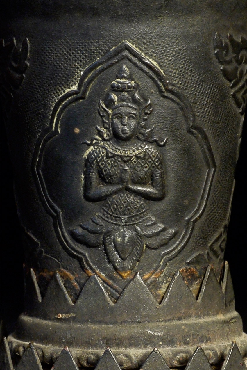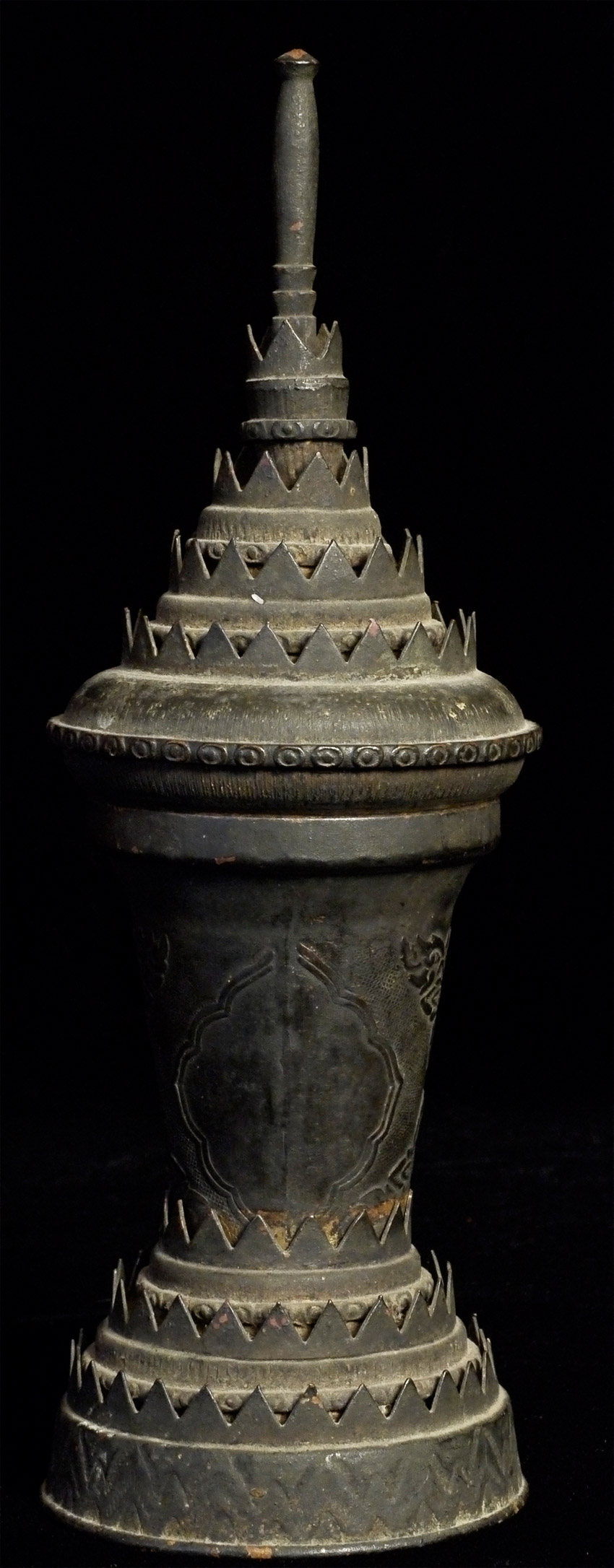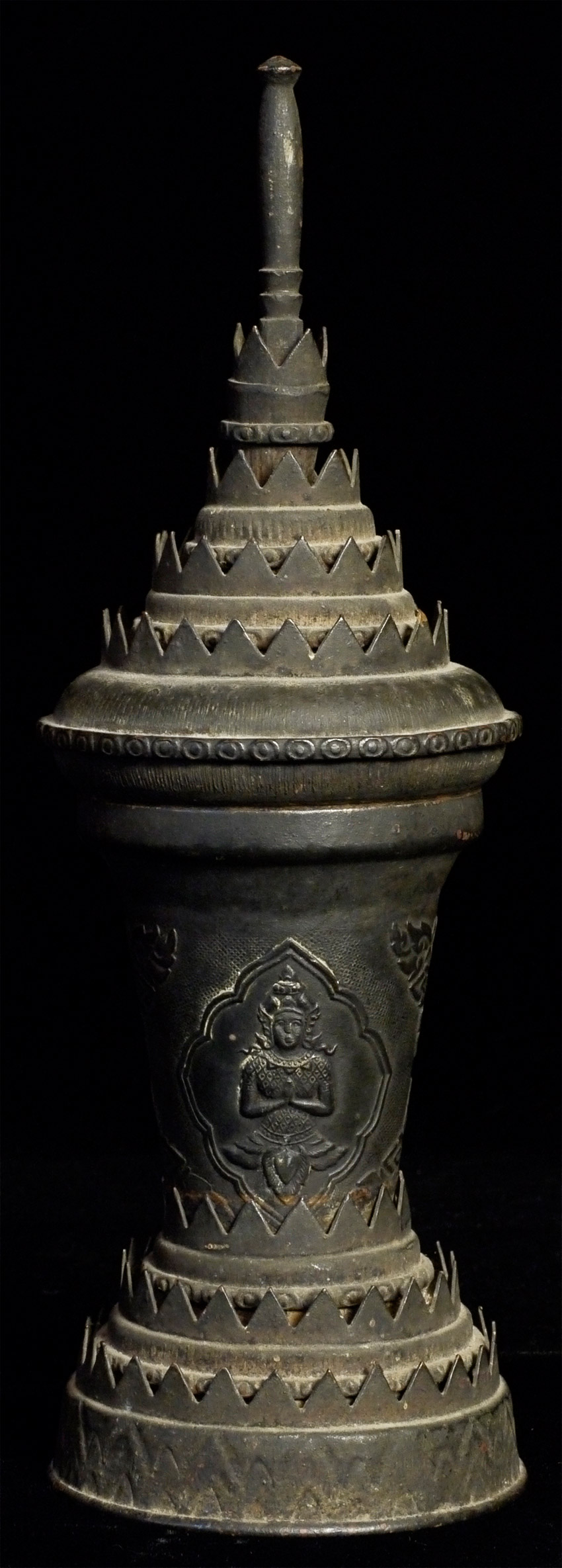 Old 72% silver Thai Buddhist reliquary. Intricate, and made of many parts, it is in complete and unused condition. Even the nuts are solid silver. 6-5/8 inches tall.