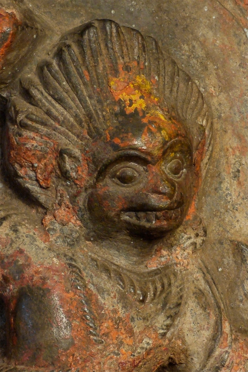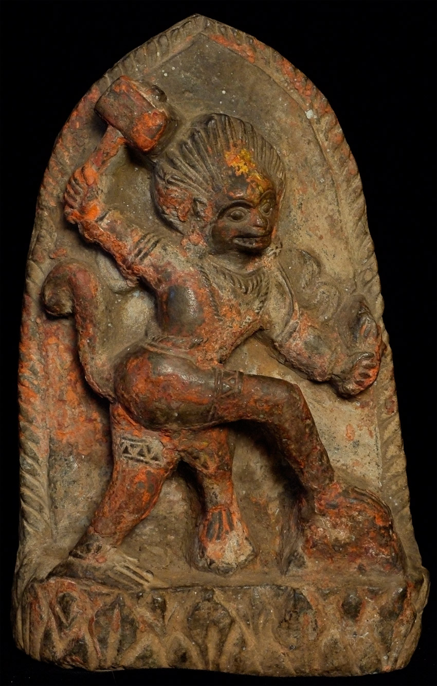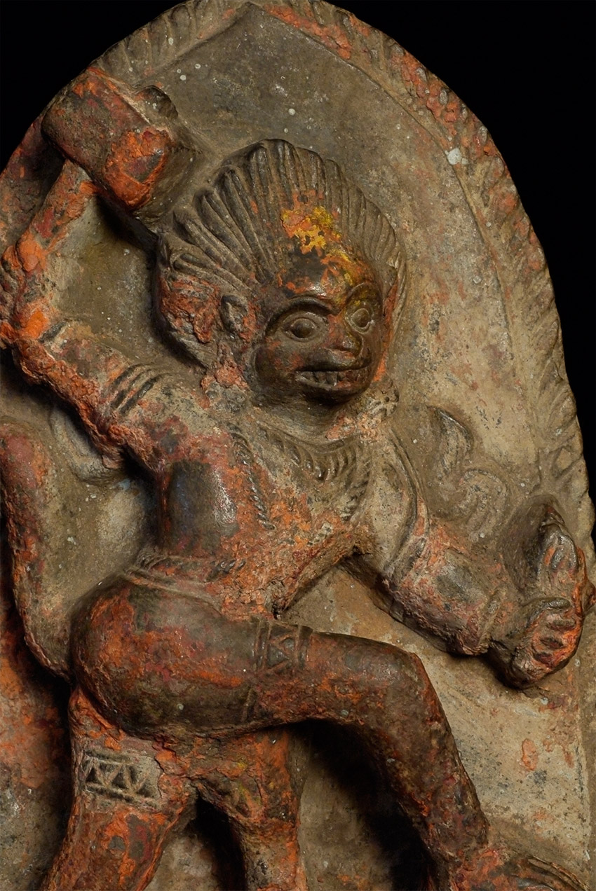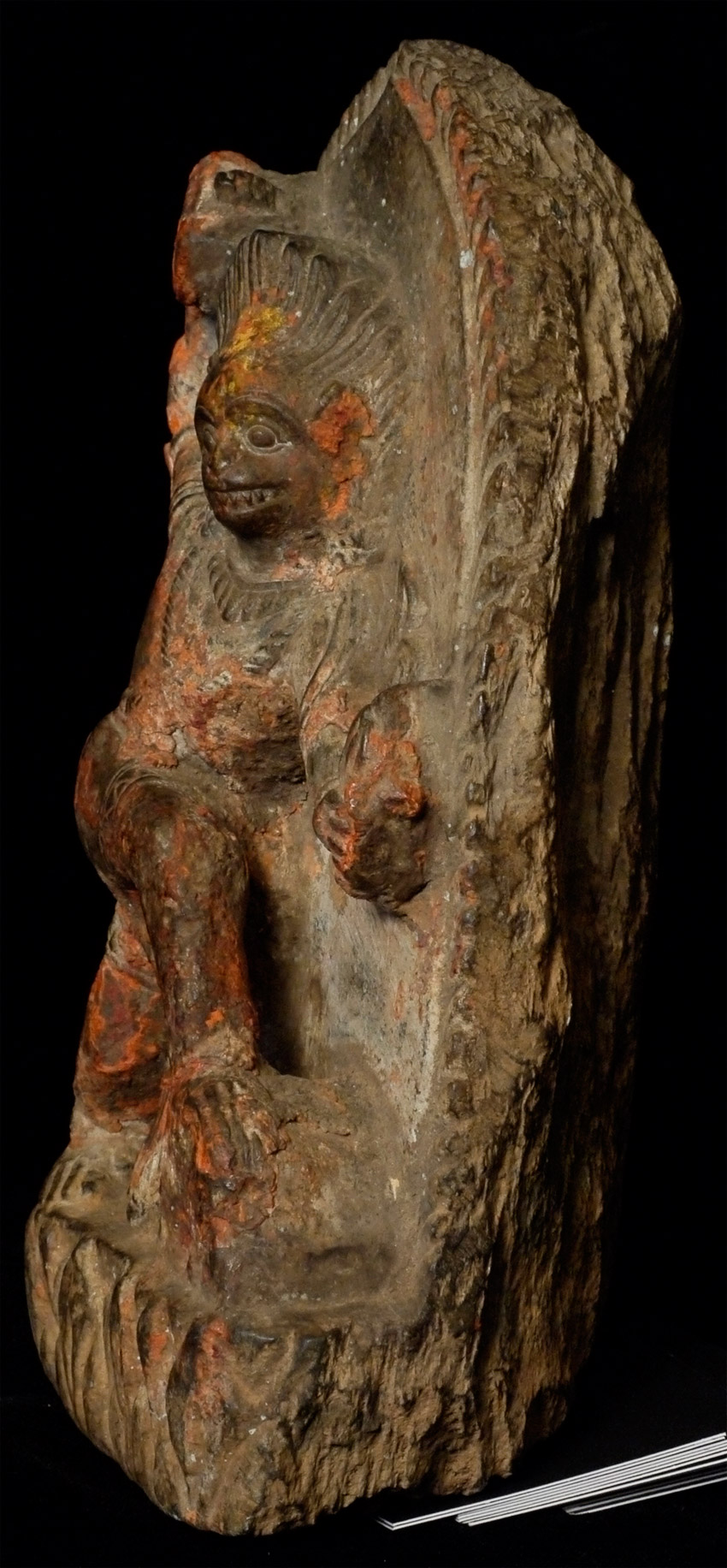 Fierce and lively Nepalese 17/18thC stone Hanuman- beautifully carved (wear, traces of puja powder). 8 1/4in high 5.5 inches wide. Needs to lean against something in order to remain upright. Very compelling figure.
