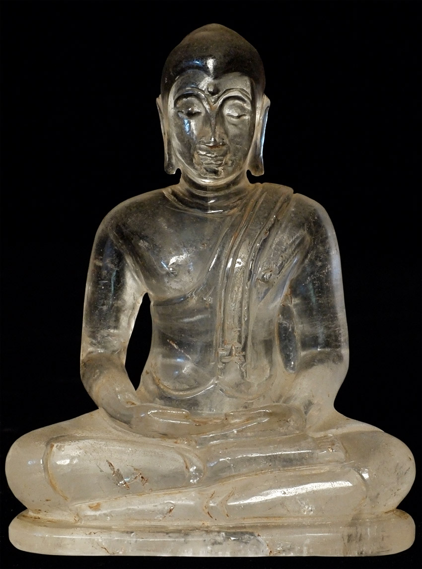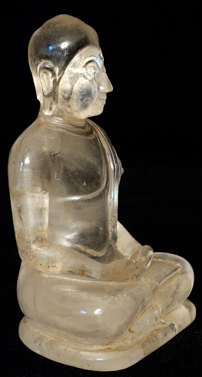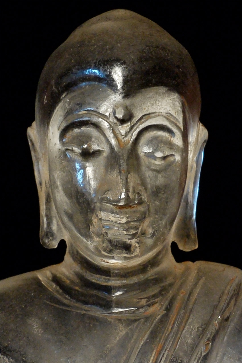 Finest Sukhothai crystal Buddha. Purchased in 1999 during the financial downturn in SE Asia from a high end collector in Thailand, this was one of hi best in a 3 generation collection of early crystal and glass SE Asian Buddha. Most of the othe Thai crystal Buddhas I've owned are Northern Thai- this is one of the very few Sukhothai examples, and it has a face finer than any other. Just over 3 inches tall, 4.75 on custom stand. From my original personal collection