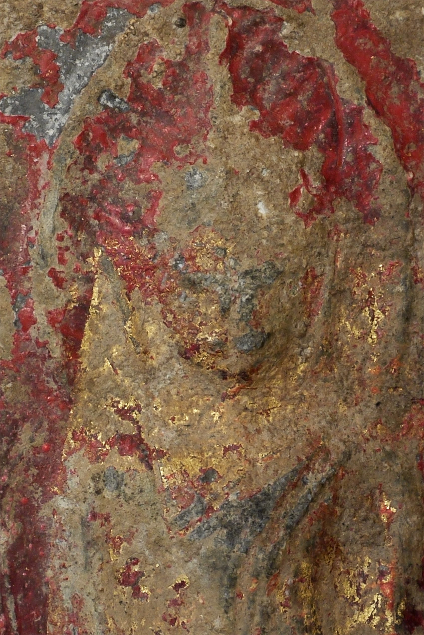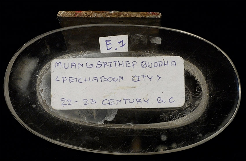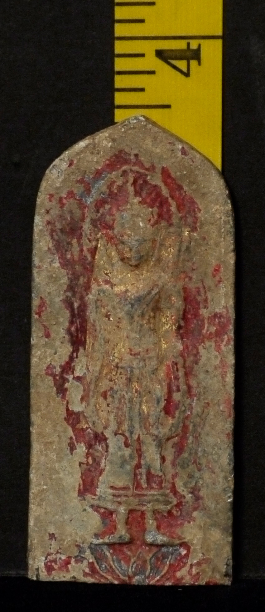 Large Ancient Thai Silver/Lead Amulet on a custom Lucite stand. This piece is 300 to 400 years old. From the ancient area of Petchaboon in Thailand. Purchased with several other recently excavated pieces in the same collection, this piece retains much of it's original gilding and red lacquer or other red covering. From the same cache as item 3864. Actual amulet is just shy of 3.5 inches tall. Height on included stand is 4.5 inches. This one is much more vivid than 3864 as the burial dirt has been cleaned away. Very beautiful!