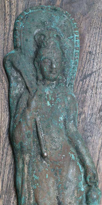 Estate piece- old Chinese bronze Quanyin mounted to a wooden board. The board is 1950’s/1960’s; the bronze figure looks quite old, although it is hard to date it with certainty. Based on the quality, patina, and feel, I’ll guess 19th century, although this is just an educated guess- it could be older or newer than that. It is lovely, with great expressiveness. The actual bronze plaque is 7.5 inches long, with the wooded framing it is 10 inches tall. Lovely!