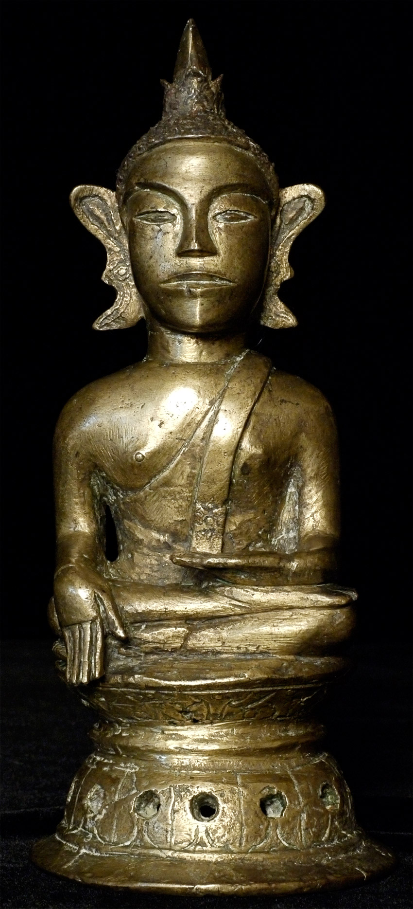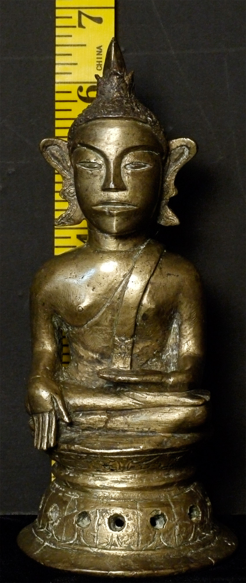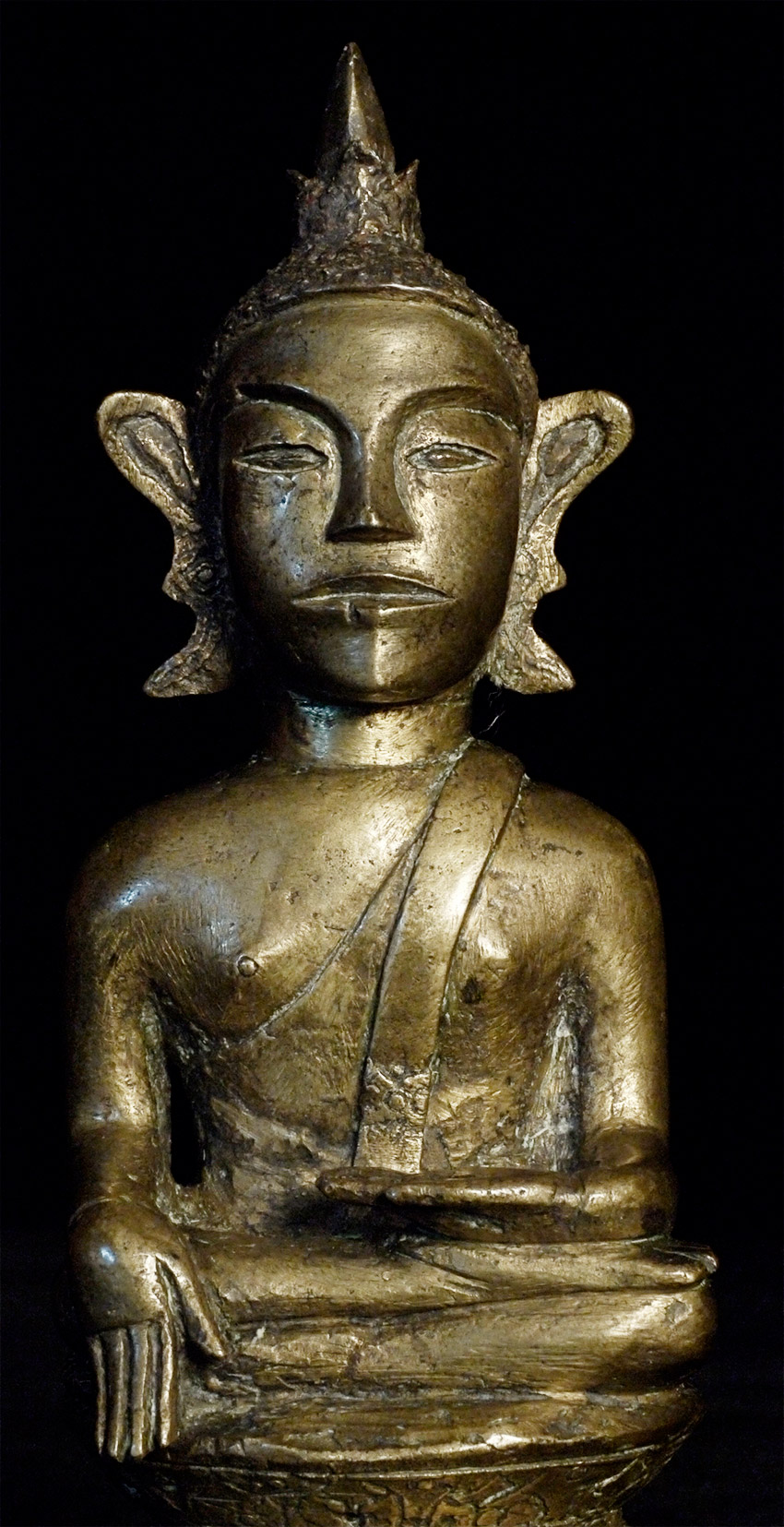 Deep gaze to this Cambodian/Laos near solid-cast bronze Buddha. Purchased from a French estate, this is one powerful Buddha. Hard to date- likely made some time between the 16th and 18th centuries-possibly earlier. Pierced holes in base and full bat ears are unusual features for a provincial bronze of this type. Great folk art as well as great spiritual art. Just under 7 inches tall, and quite heavy for his size.