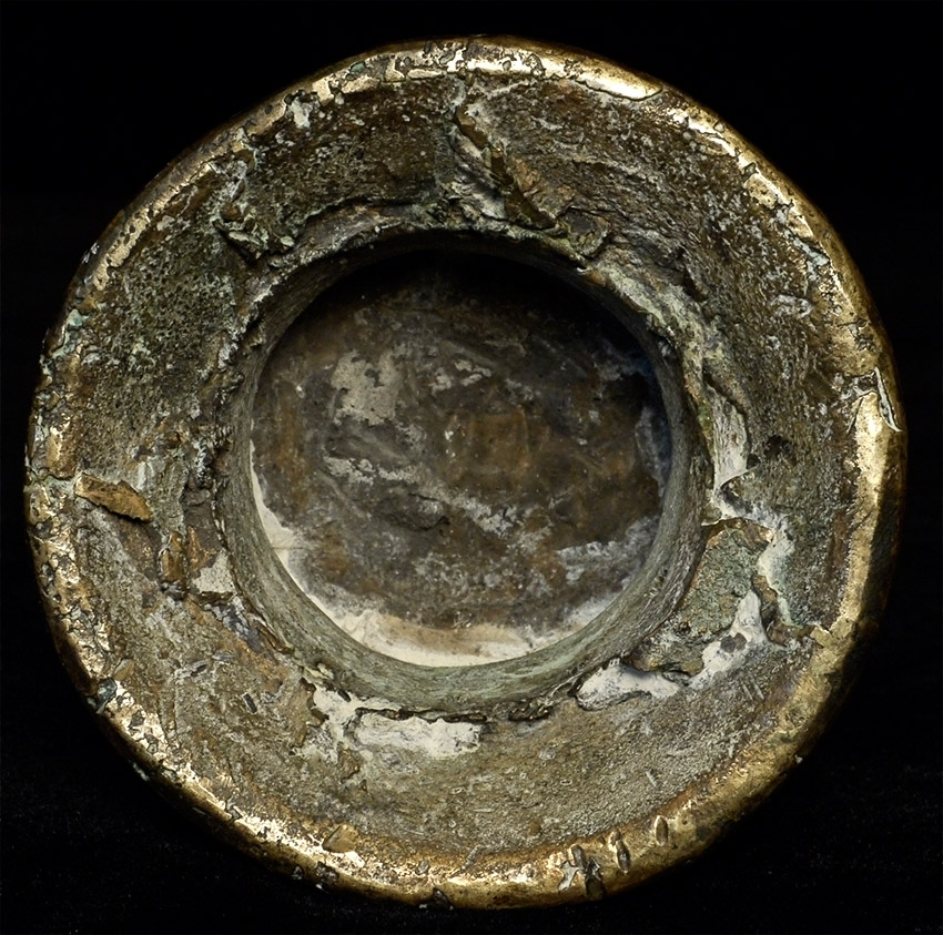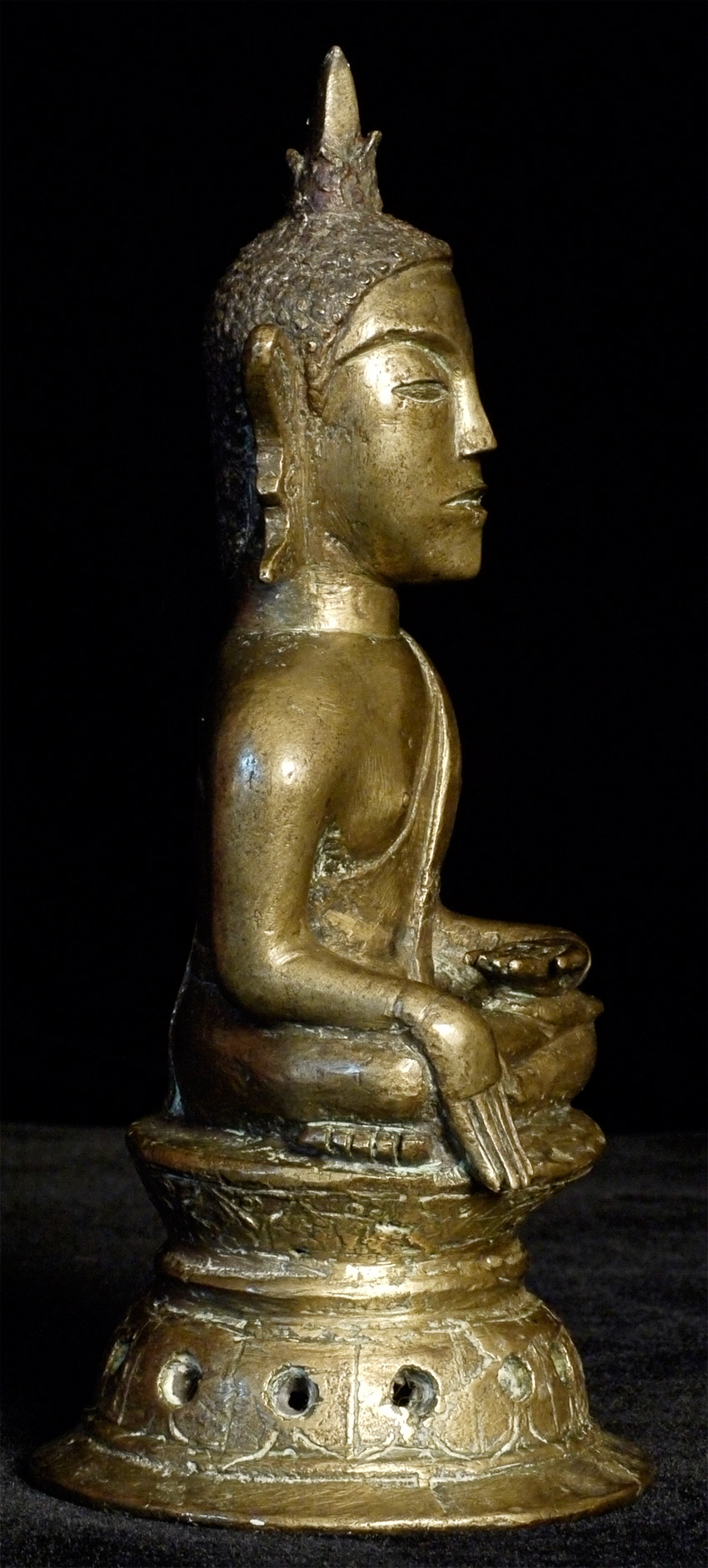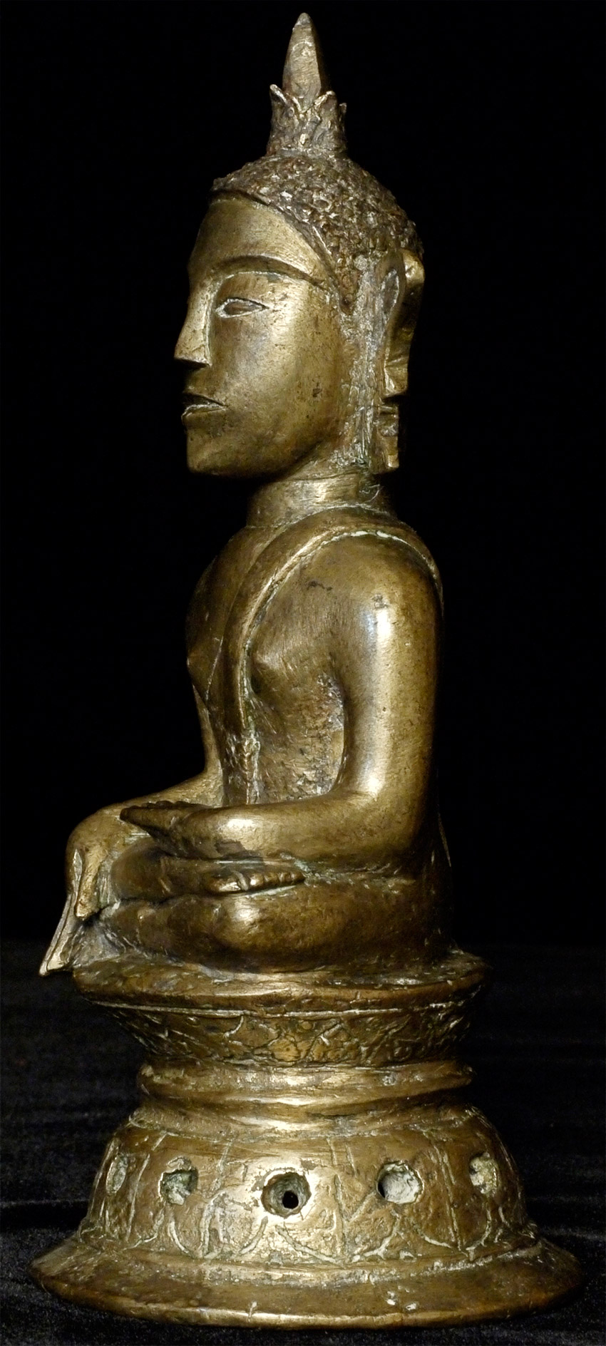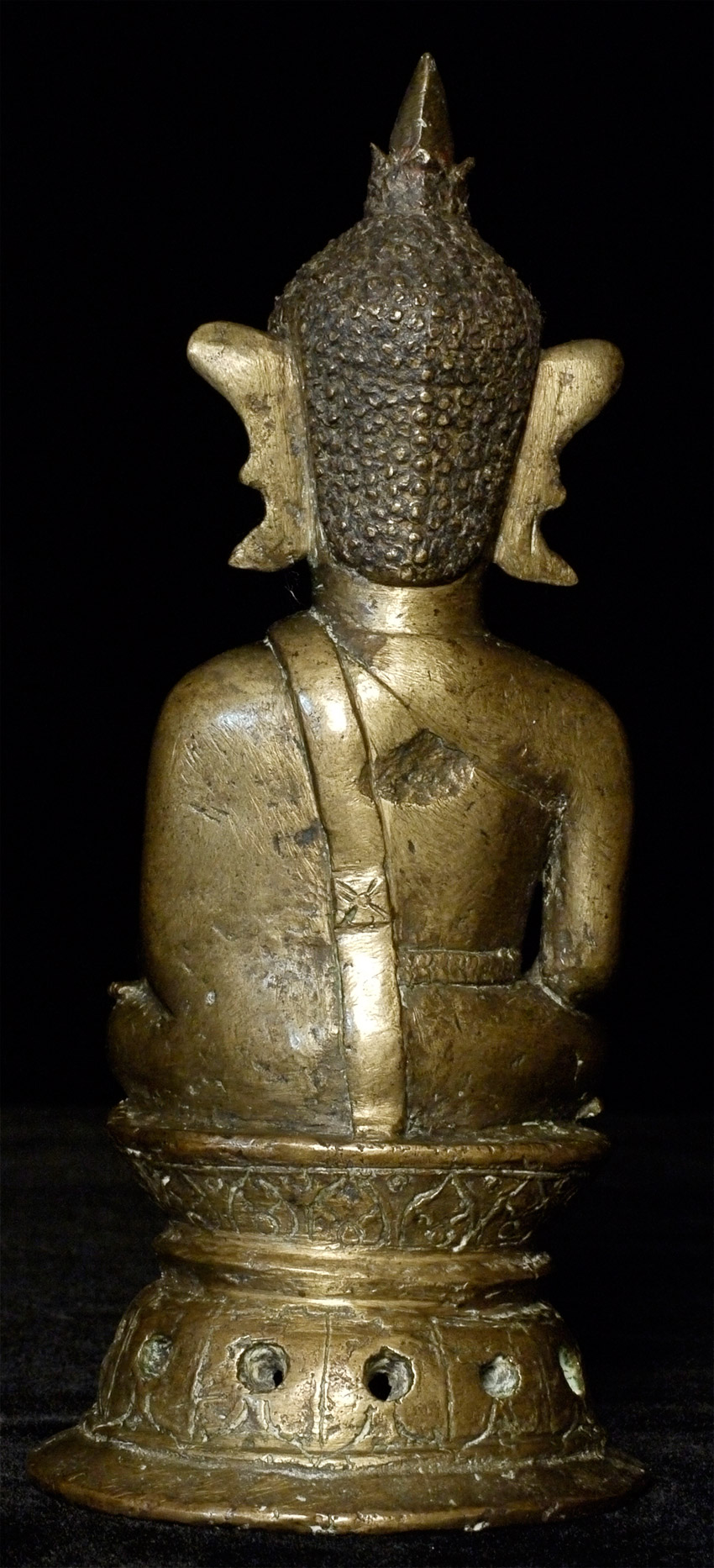 Deep gaze to this Cambodian/Laos near solid-cast bronze Buddha. Purchased from a French estate, this is one powerful Buddha. Hard to date- likely made some time between the 16th and 18th centuries-possibly earlier. Pierced holes in base and full bat ears are unusual features for a provincial bronze of this type. Great folk art as well as great spiritual art. Just under 7 inches tall, and quite heavy for his size.