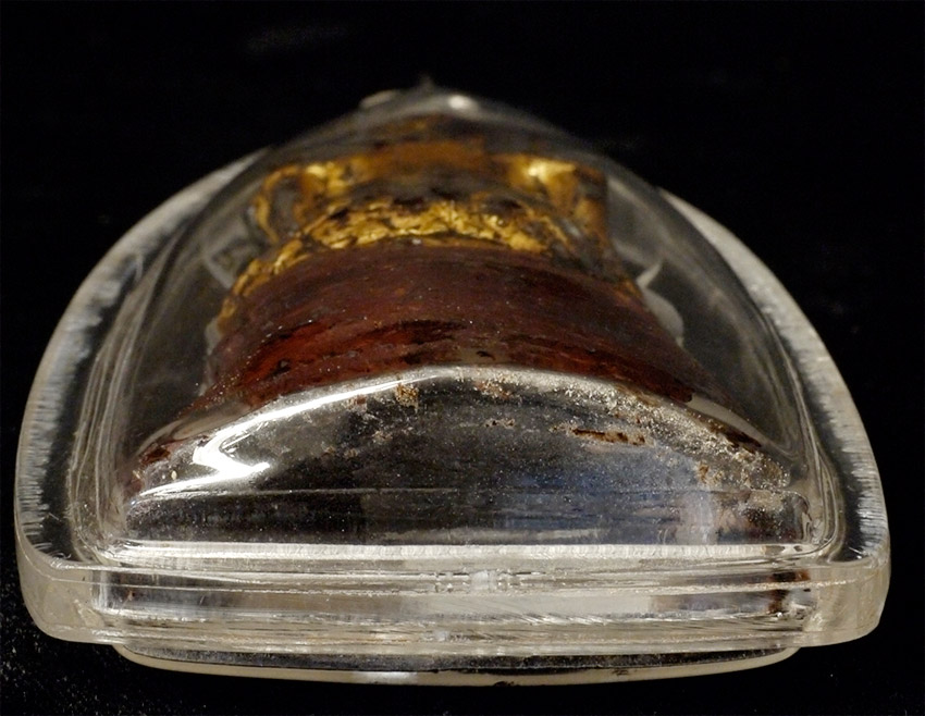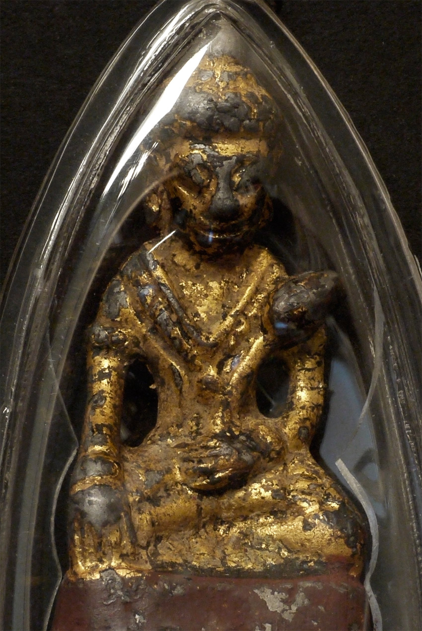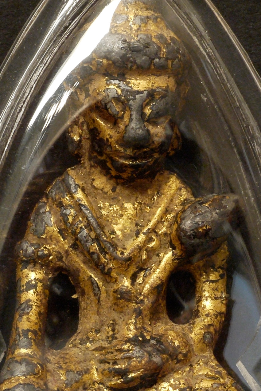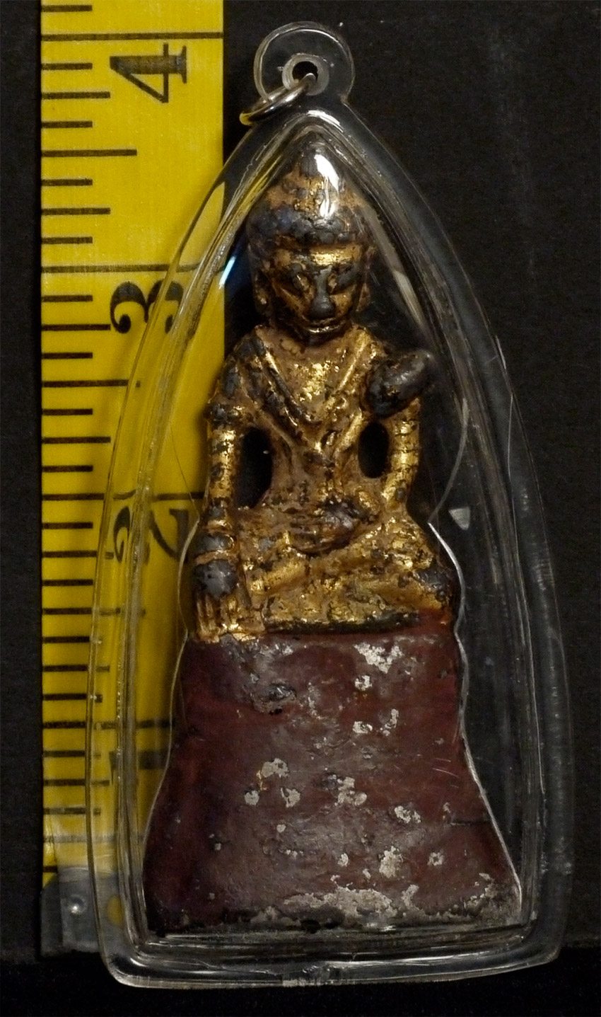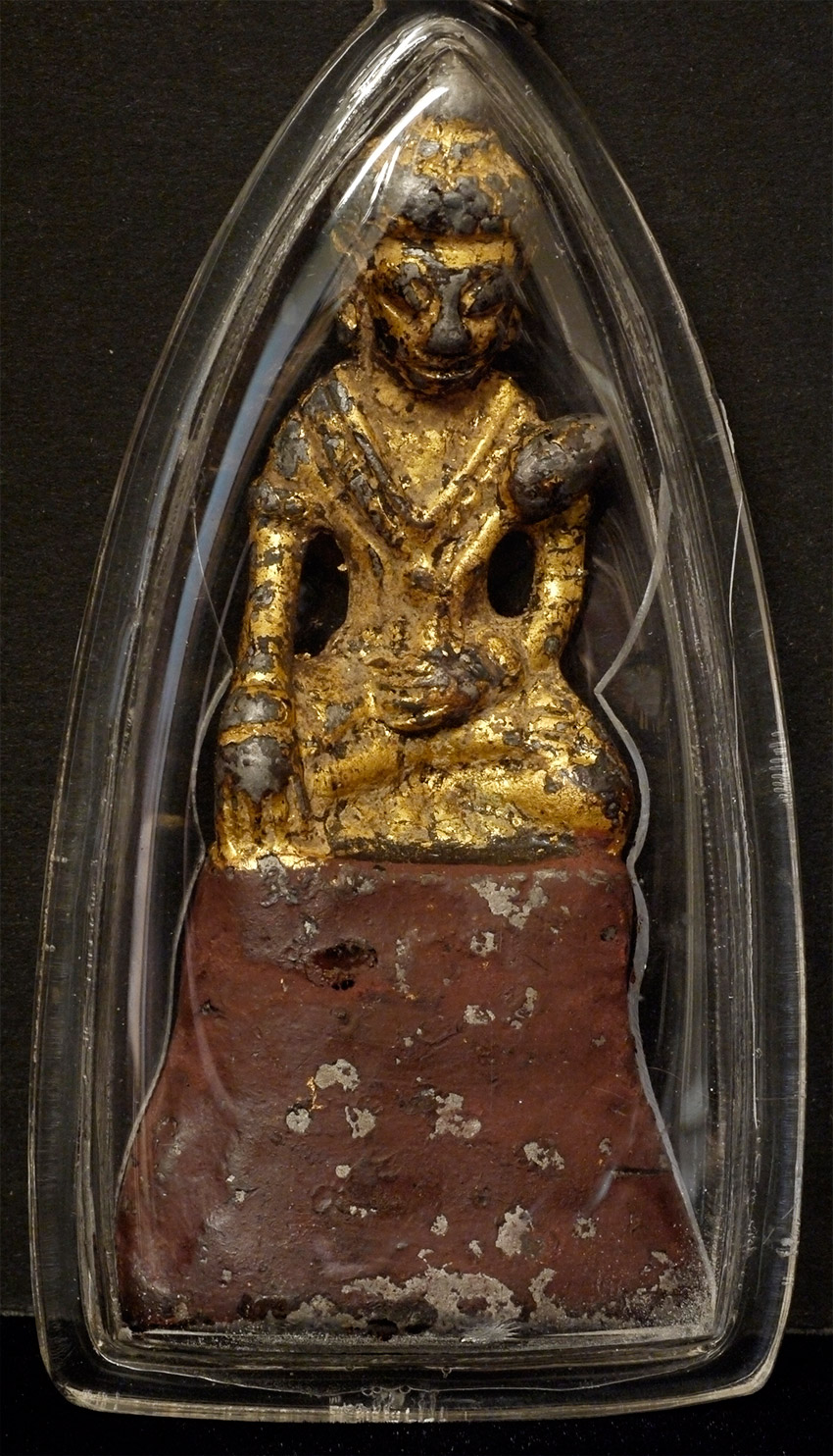 Antique Thai or Lao Buddha with lotus. In an amulet case, though too large to wear. Most of the original gilding remains. Many copies of this type- this is an authentic old one- probably from the Rattanakosin period. Buddha is 3 3/8 inches tall, amulet height is 4 inches. Domestic shipping is included. International shipping will be $35, including packing, shipping and insurance