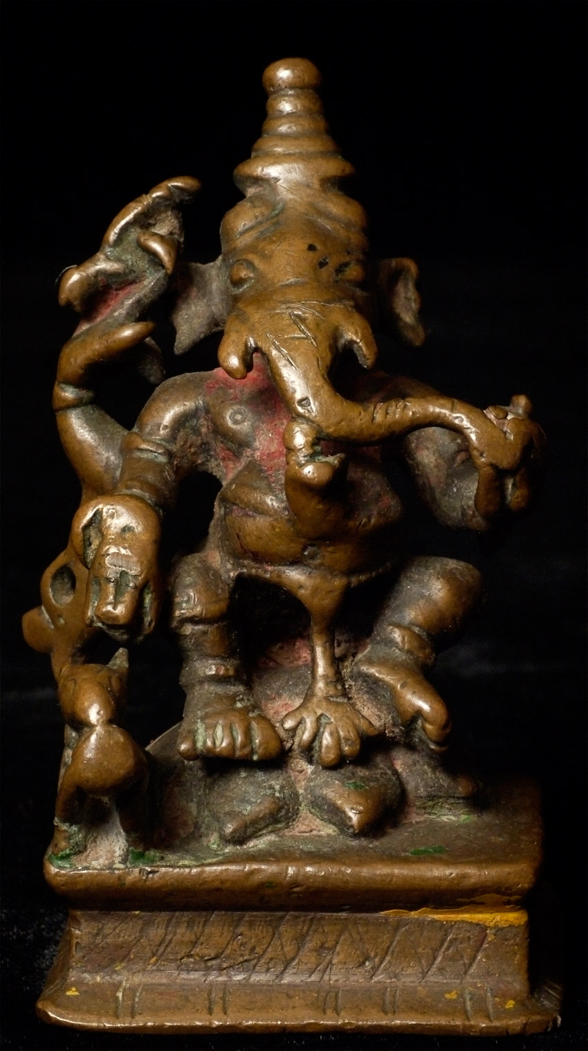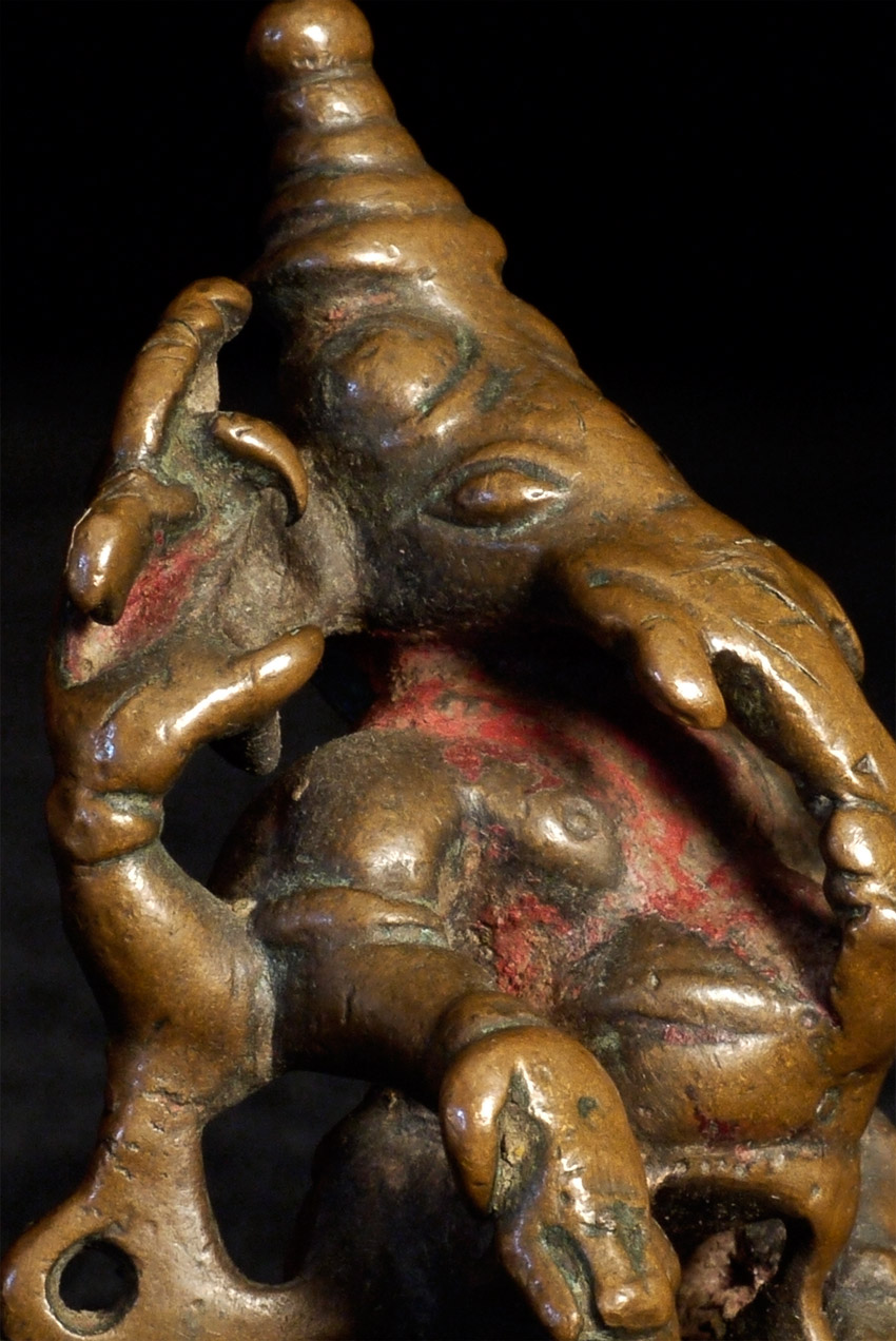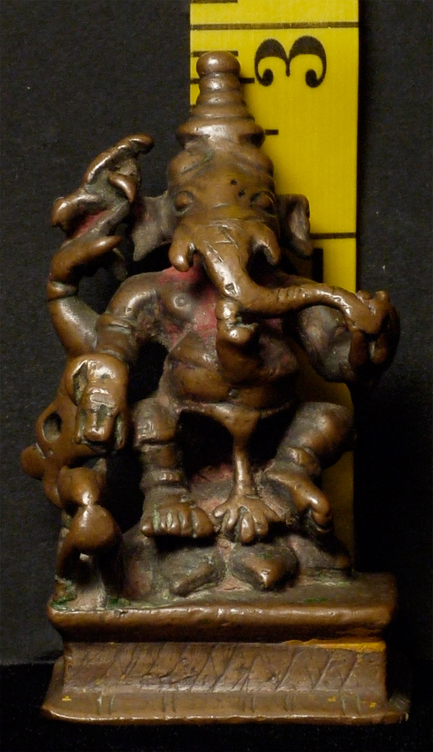 Antique Ganesh. Missing one of his 4 arms. Sits 2 7/8 inches tall