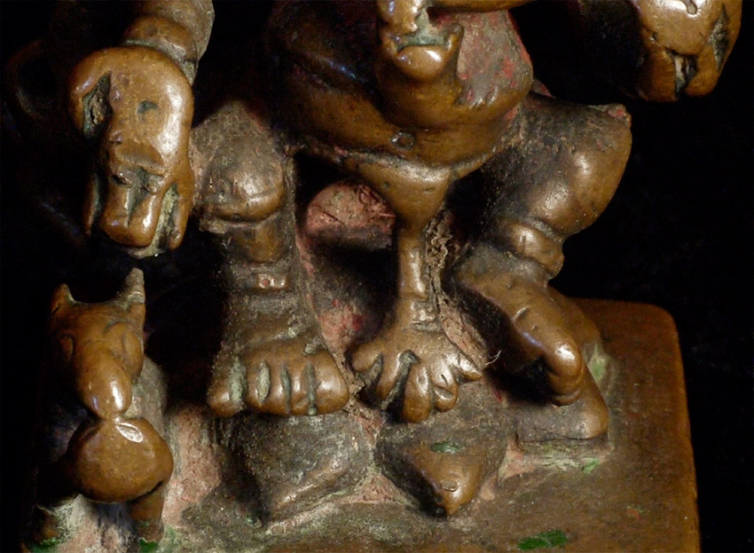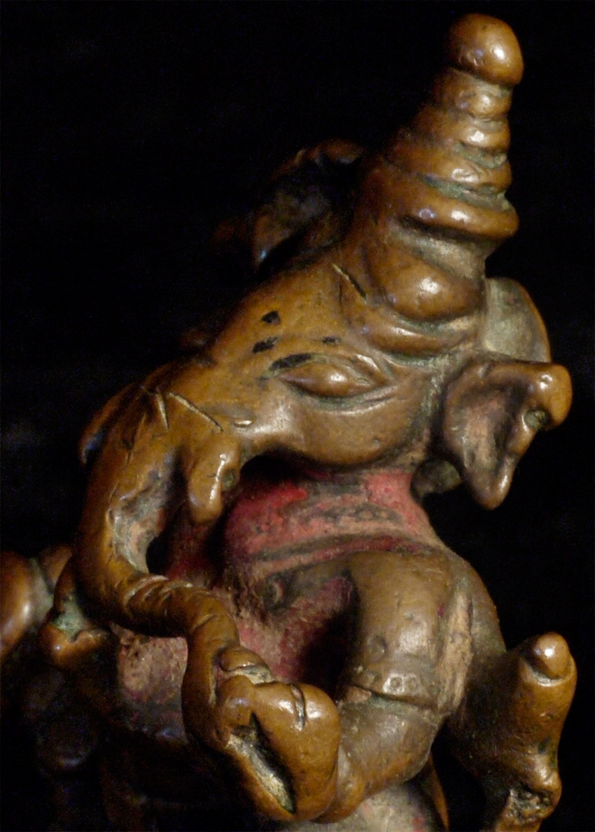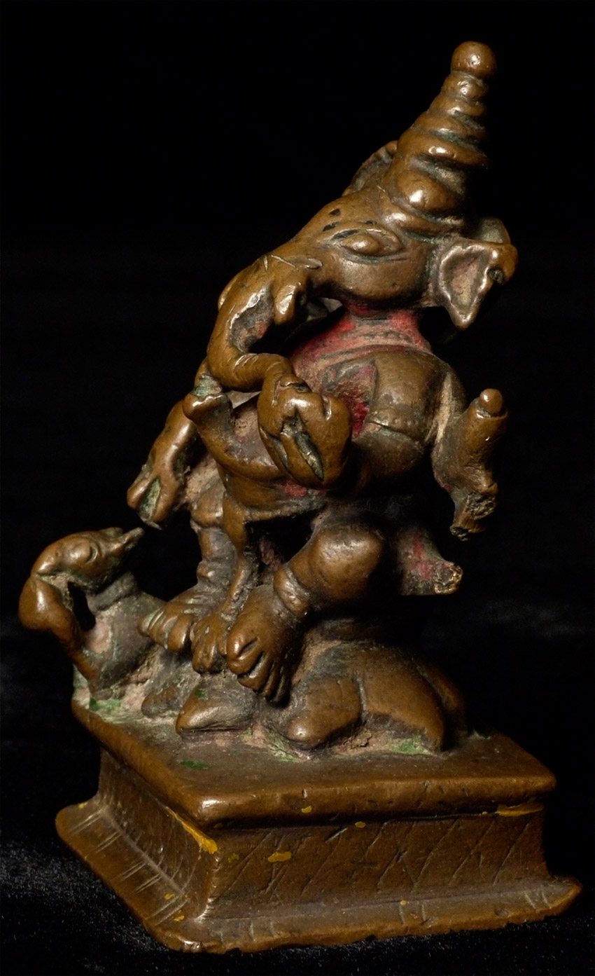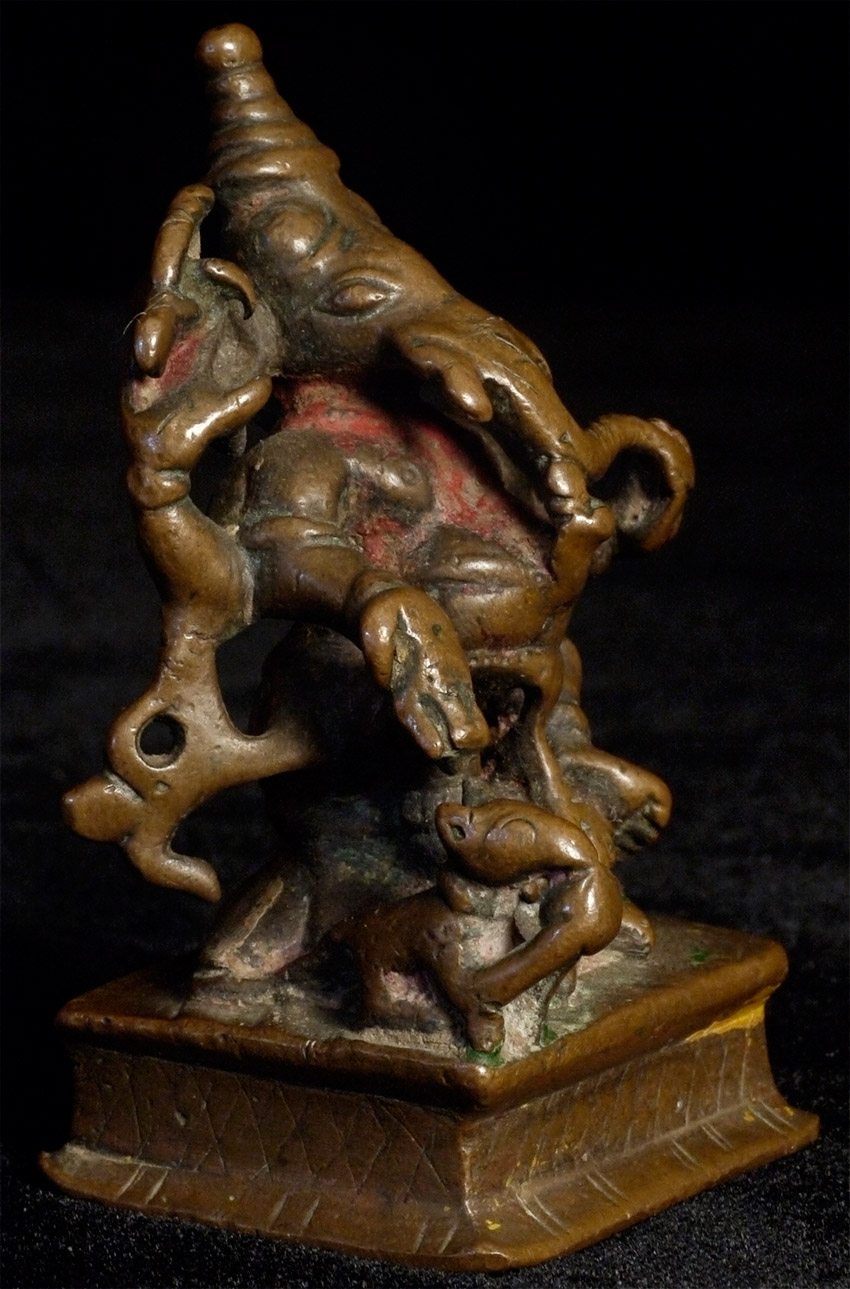 Antique Ganesh. Missing one of his 4 arms. Sits 2 7/8 inches tall