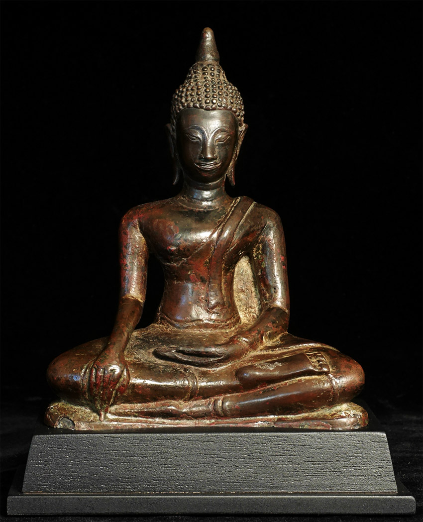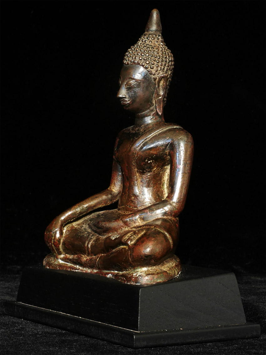 14thC high-quality Sukhothai Buddha with untouched patina Rare survivor. Possibly silver in the alloy. Sits 5.25 inches tall, and 6 inches on a custom stand. A collector's piece.