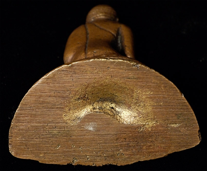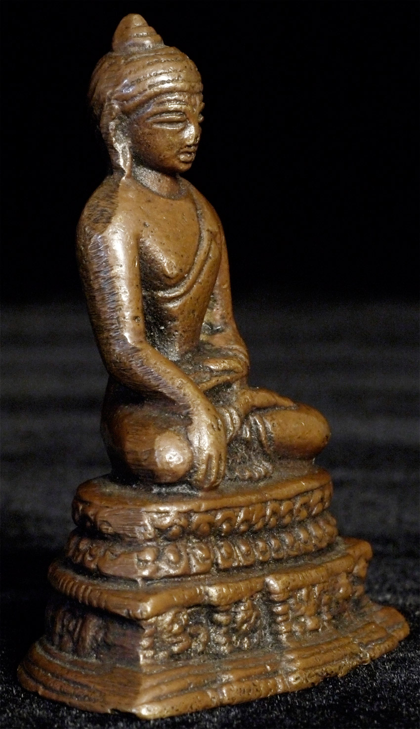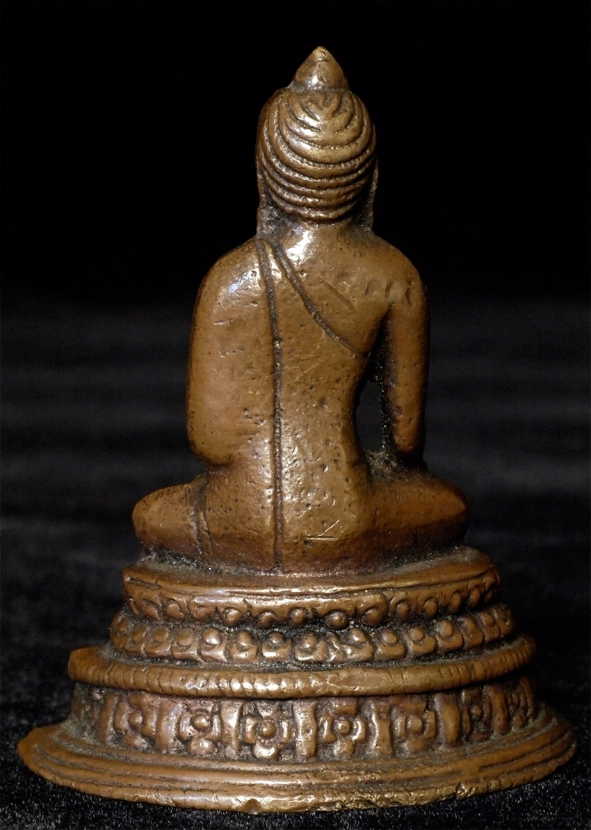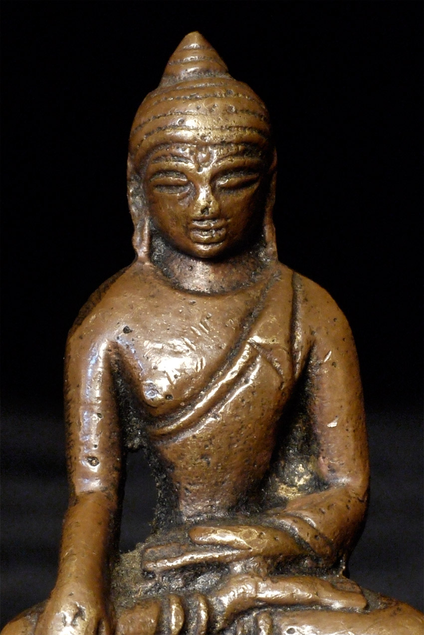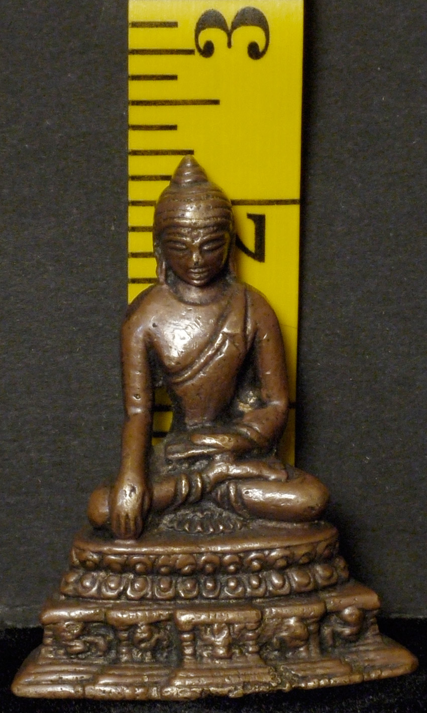 Antique solid-cast Indian bronze Buddha with an archaic style base. 19thC- possibly much earlier. Measures 2.25 inches tall. A good example of its type.
