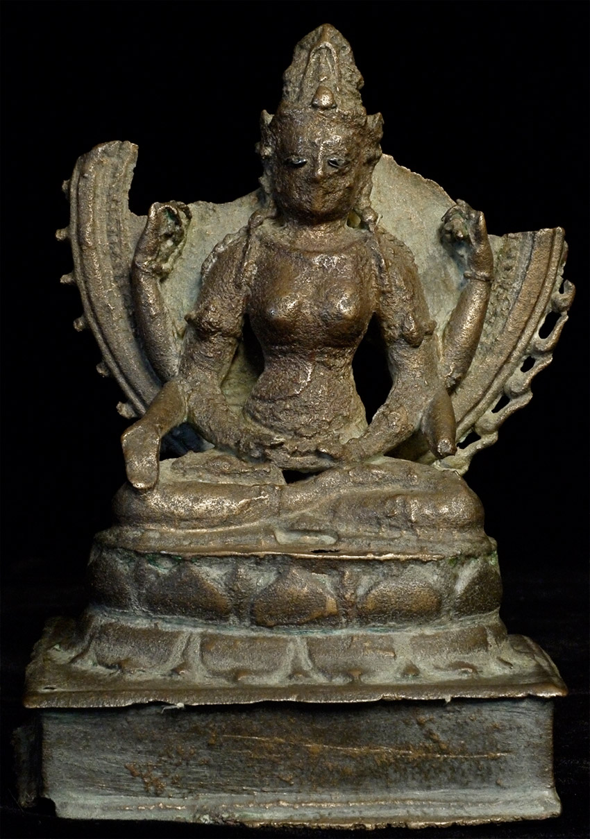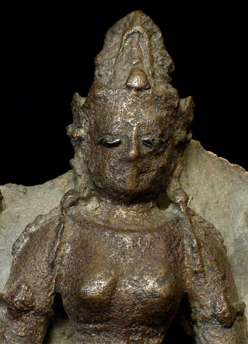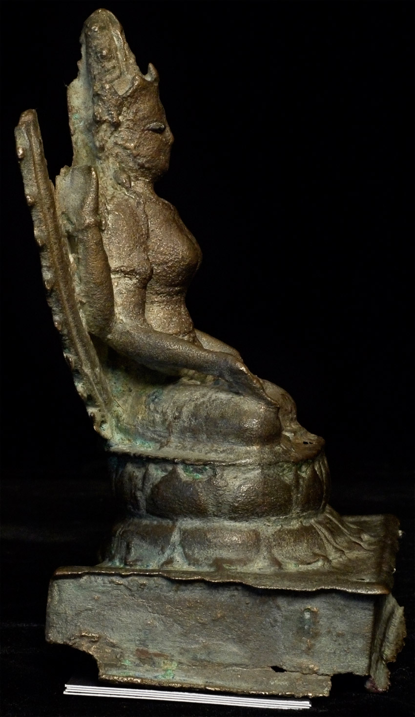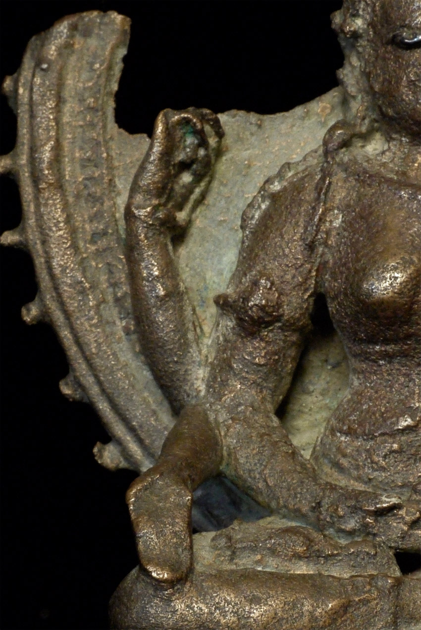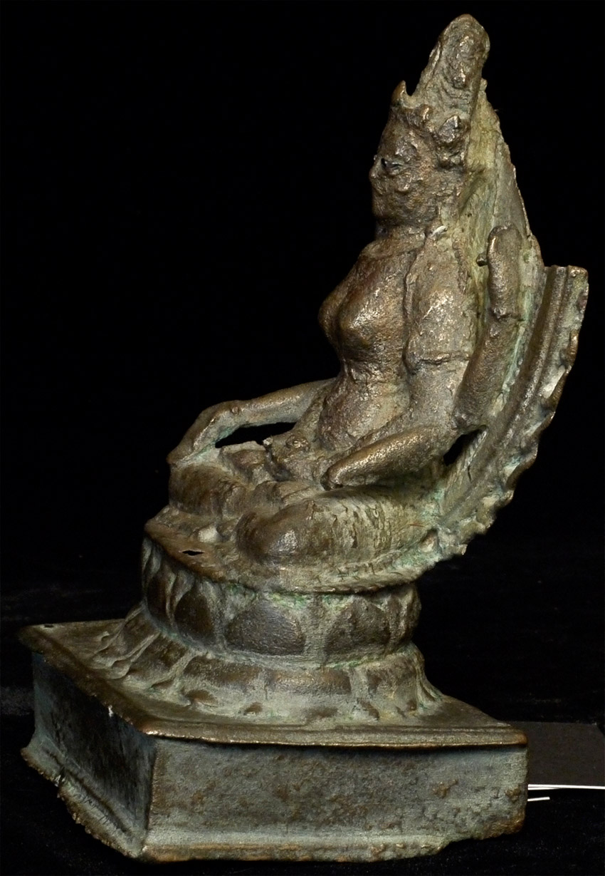 Authentic 9th century Indonesian Bodhisattva cast out of a high silver content alloy. Losses, wear, and burial patina as seen in the photos. Still, a magnificent radiant specimen. Rare. Sits 5 5/8 inches tall. Custom base elevates it another 1.25 inches.