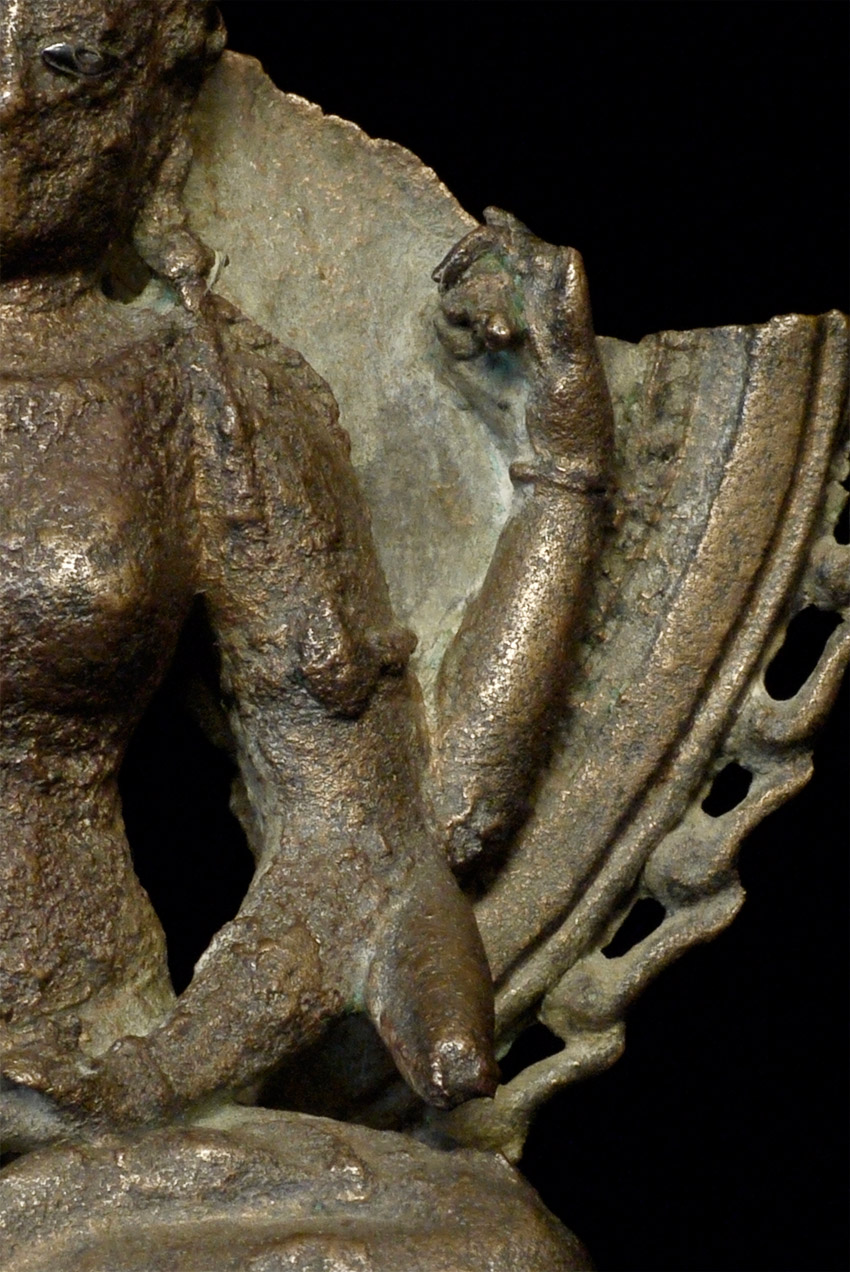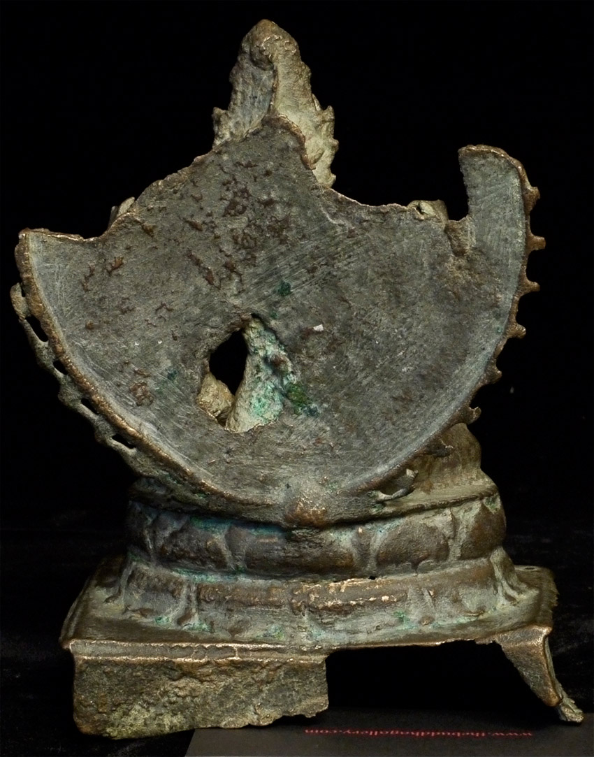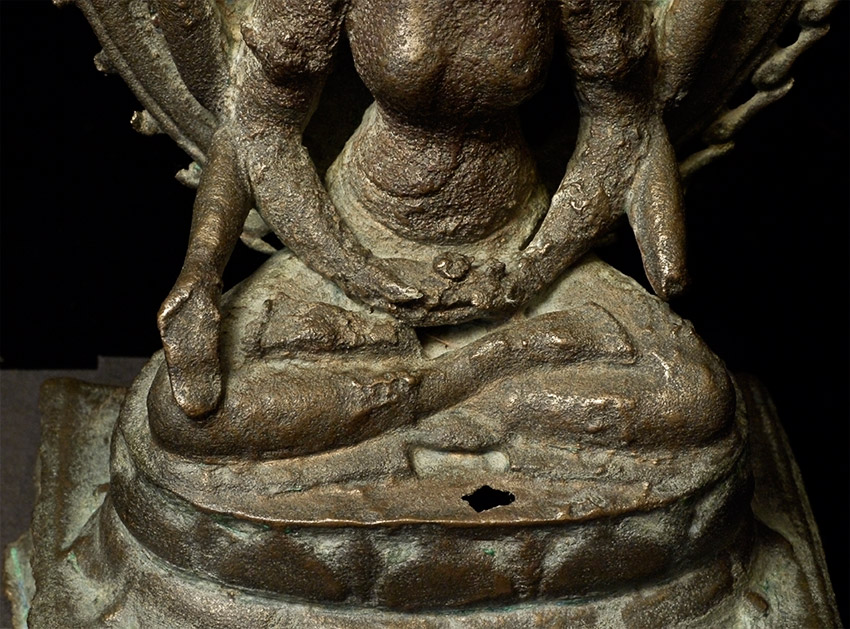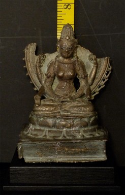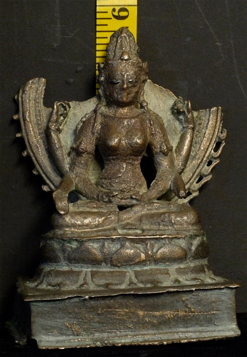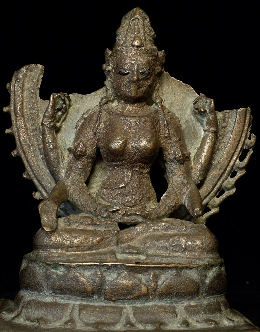Authentic 9th century Indonesian Bodhisattva cast out of a high silver content alloy. Losses, wear, and burial patina as seen in the photos. Still, a magnificent radiant specimen. Rare. Sits 5 5/8 inches tall. Custom base elevates it another 1.25 inches.