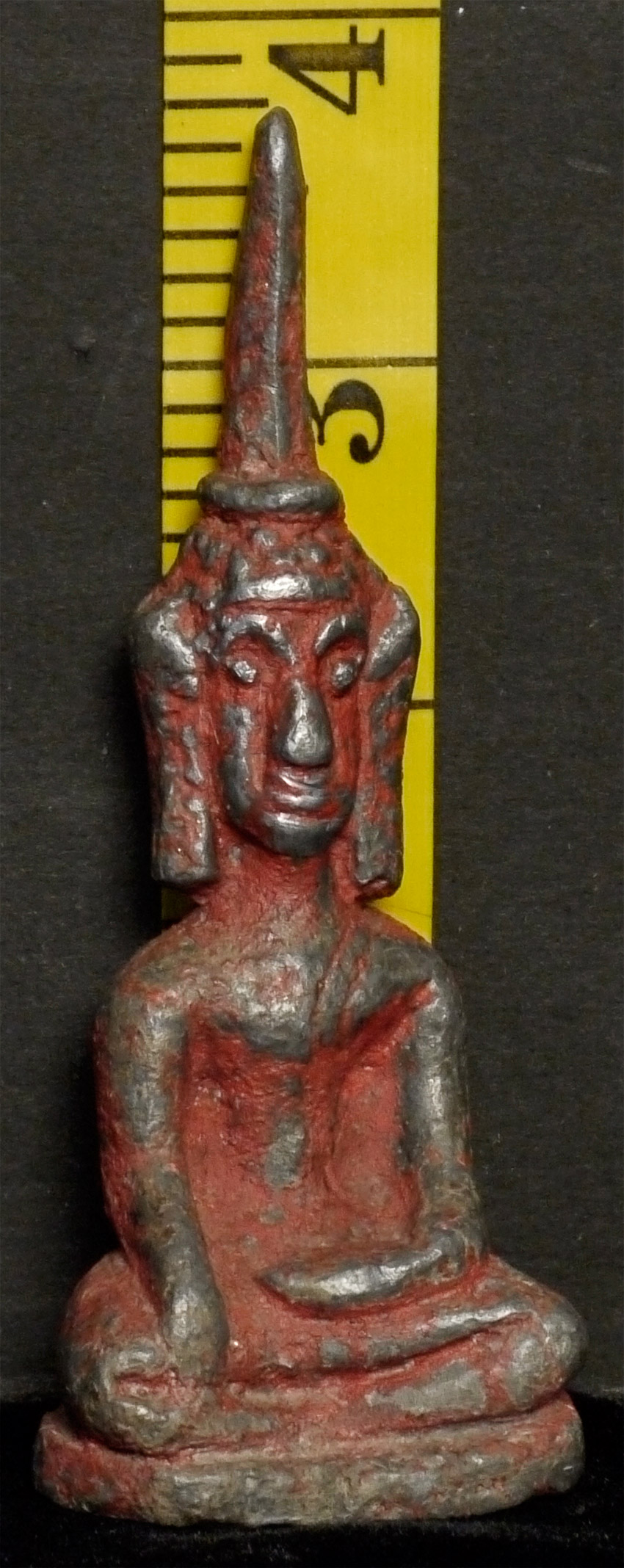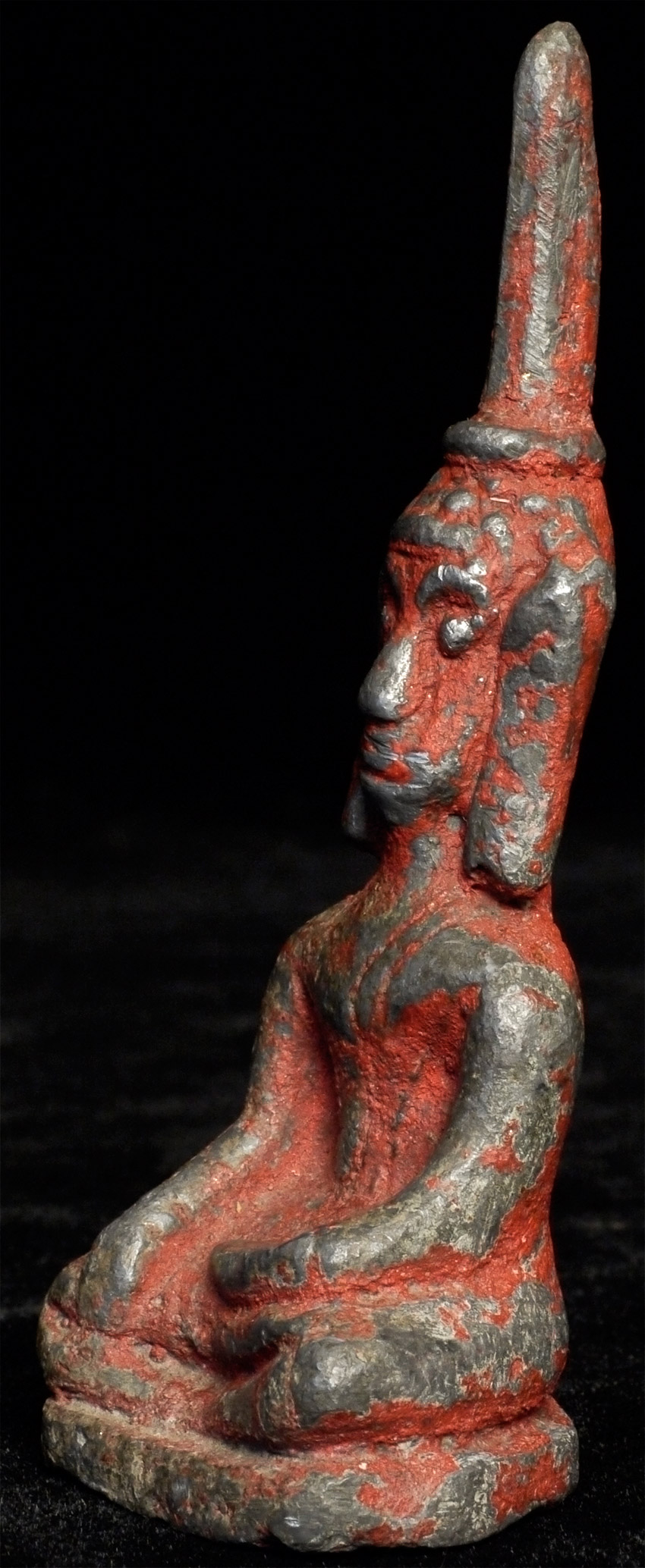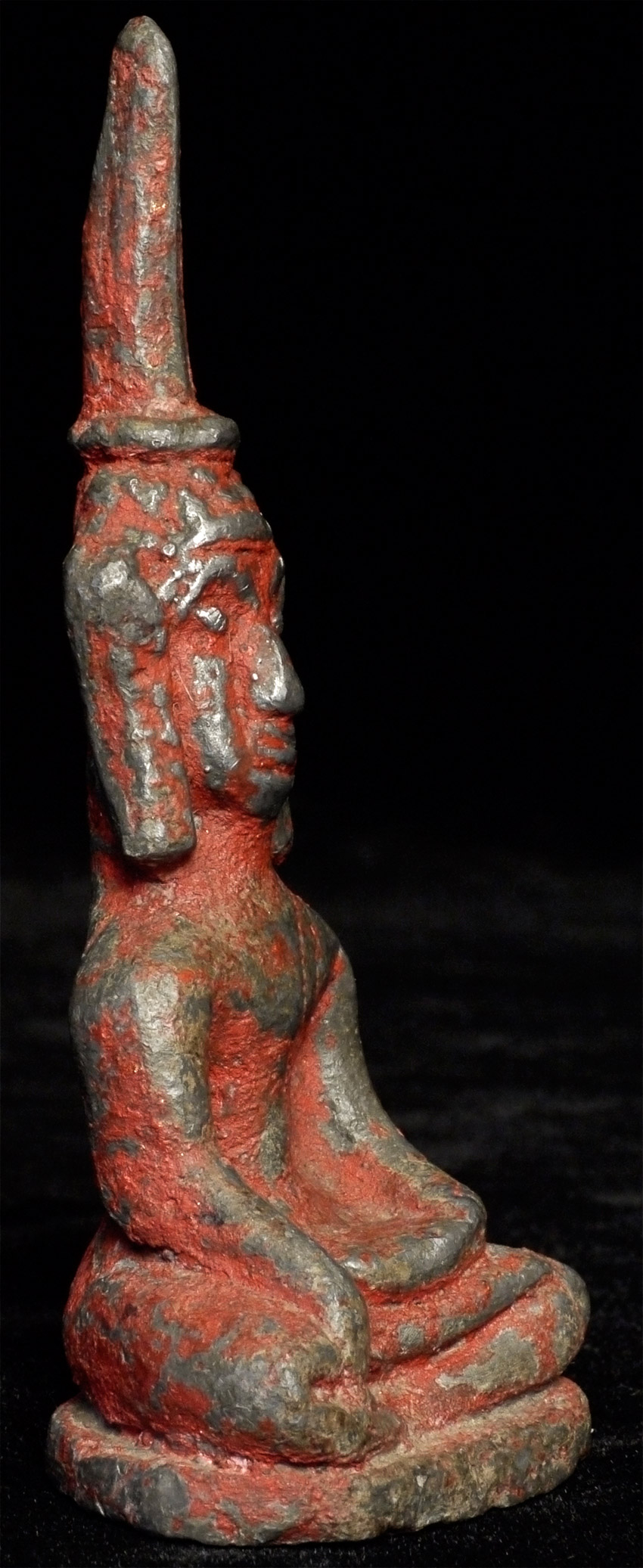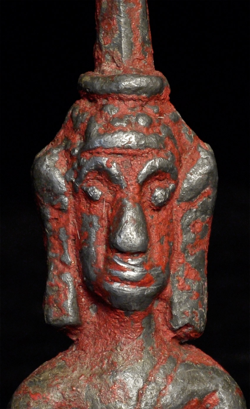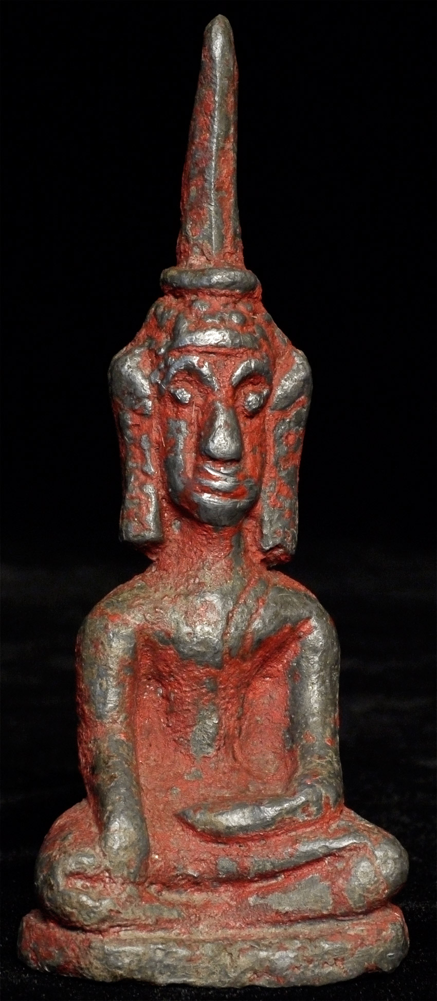 Provincial antique Laos Buddha that came out of a cave many years ago along with a group of 970 others. There were several different styles of them, and I bought all of them that were available from a Thai man who had owned them. They are quite heavy for their size. This piece is 3 7/8 inches tall.