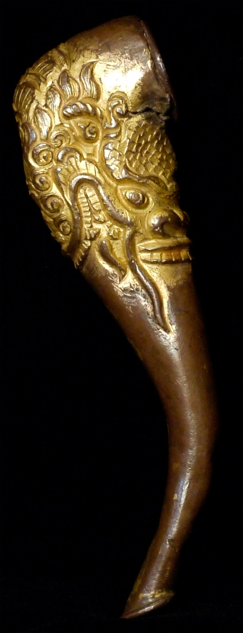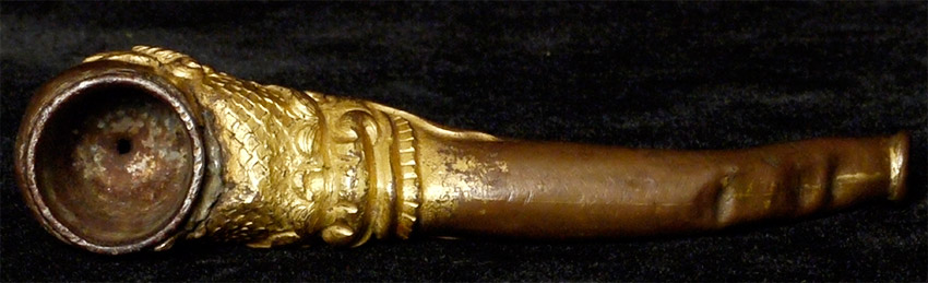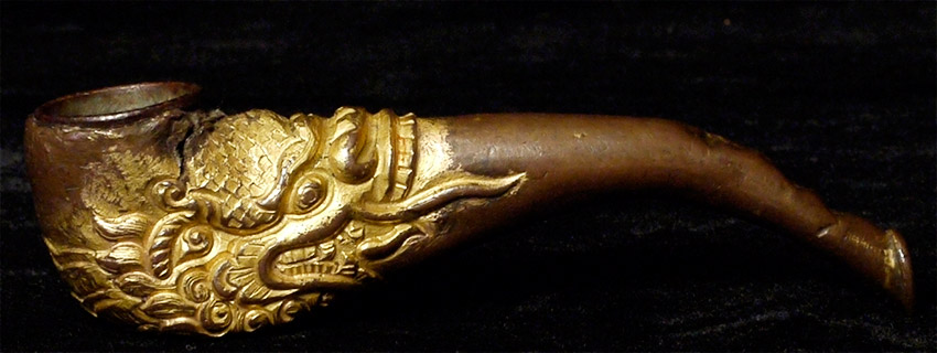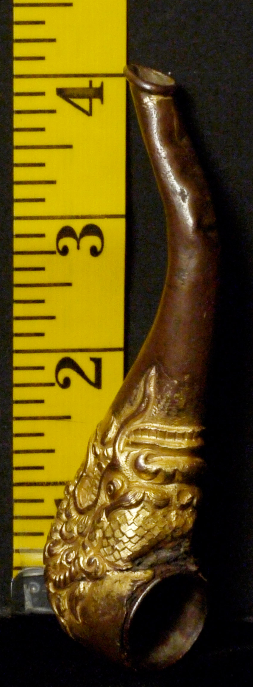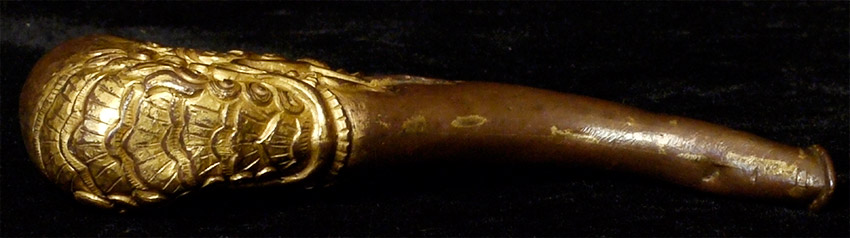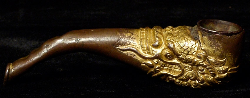 Very fine antique Tibetan gilded copper dragon pipe from an early Asian pipe collection. Looks to be 18/19thC or earlier. Length is 4 inches long. Very beautiful- probably used for ritual purposes. Never seen another.