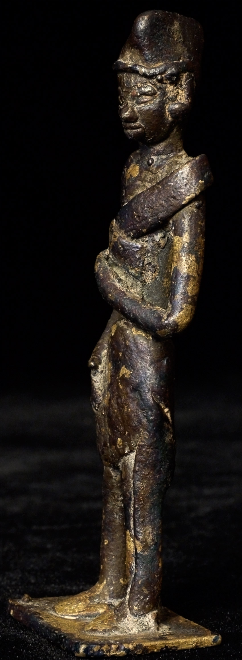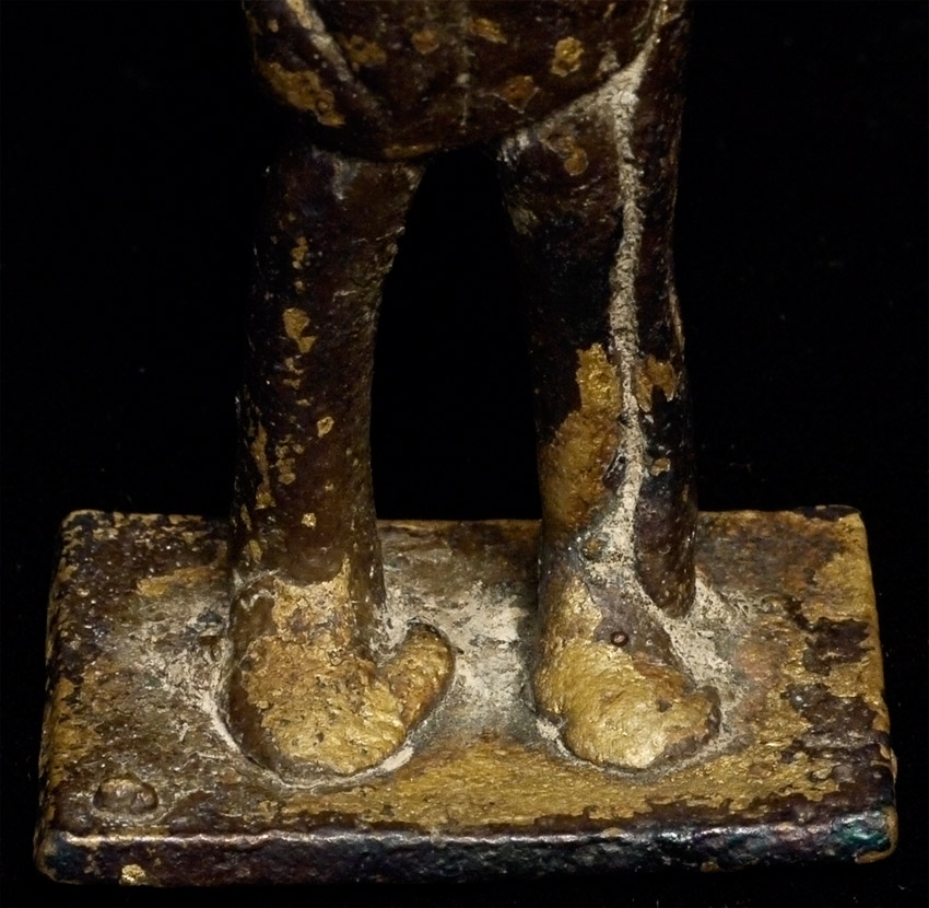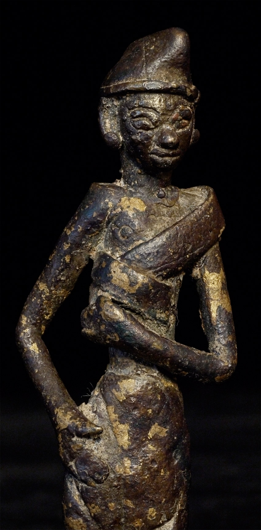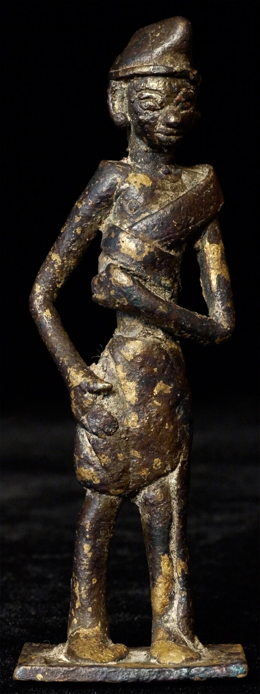 19thC, and possibly much earlier well cast Indonesian or related island bronze figure with remains of gilding. Stands 3 5/8 inches tall. NOT the common hollow cast 19/20th Indonesian type made during the colonial period.