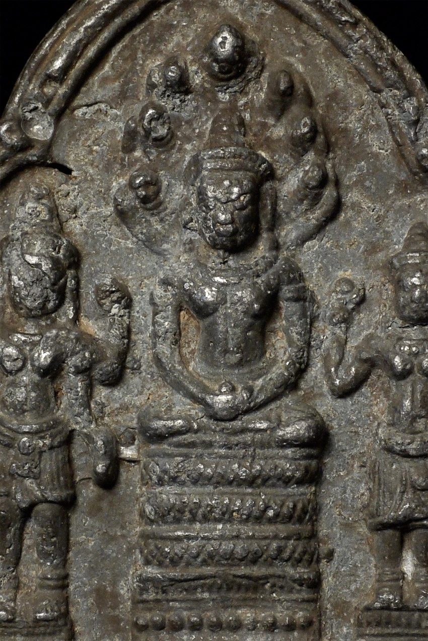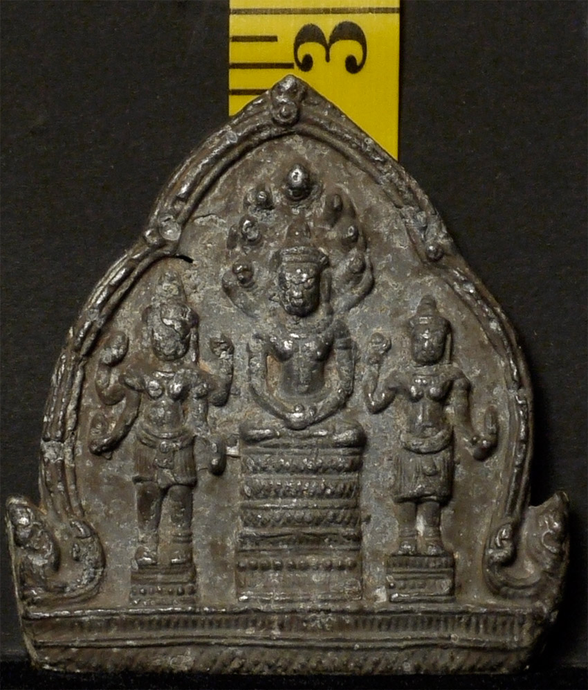 Cambodian bronze plaque or amulet Naga Buddha trilogy from an old collection of SE Asian amulets and small Buddhist objects collected in the 1970's and 80's. Probably quite early-likely period 12/13thC. Sits 2.75 inches tall