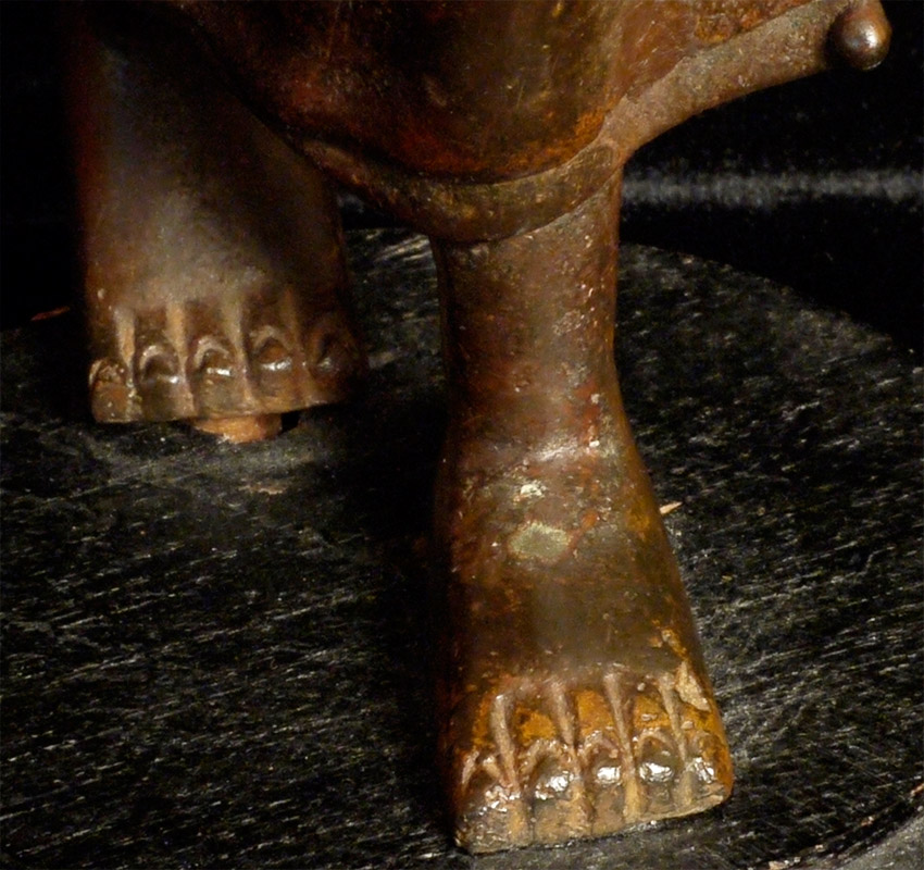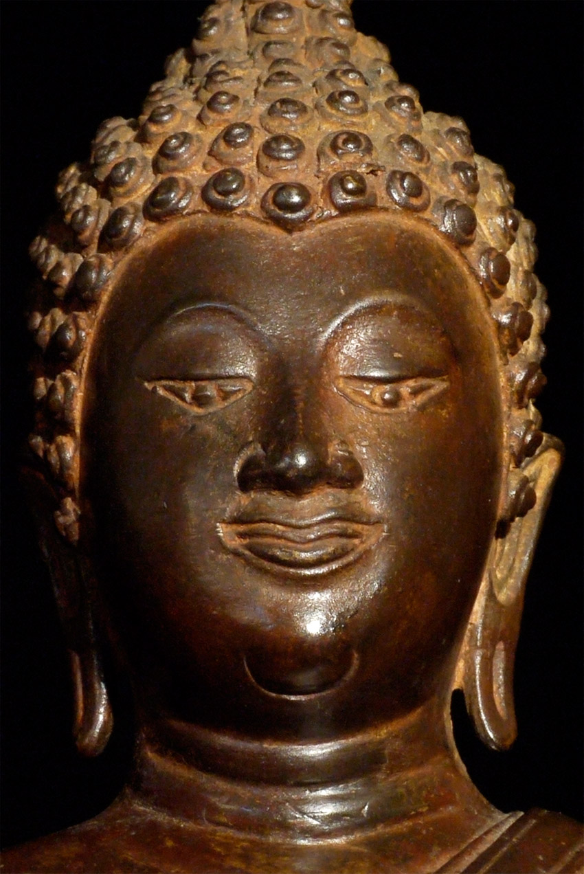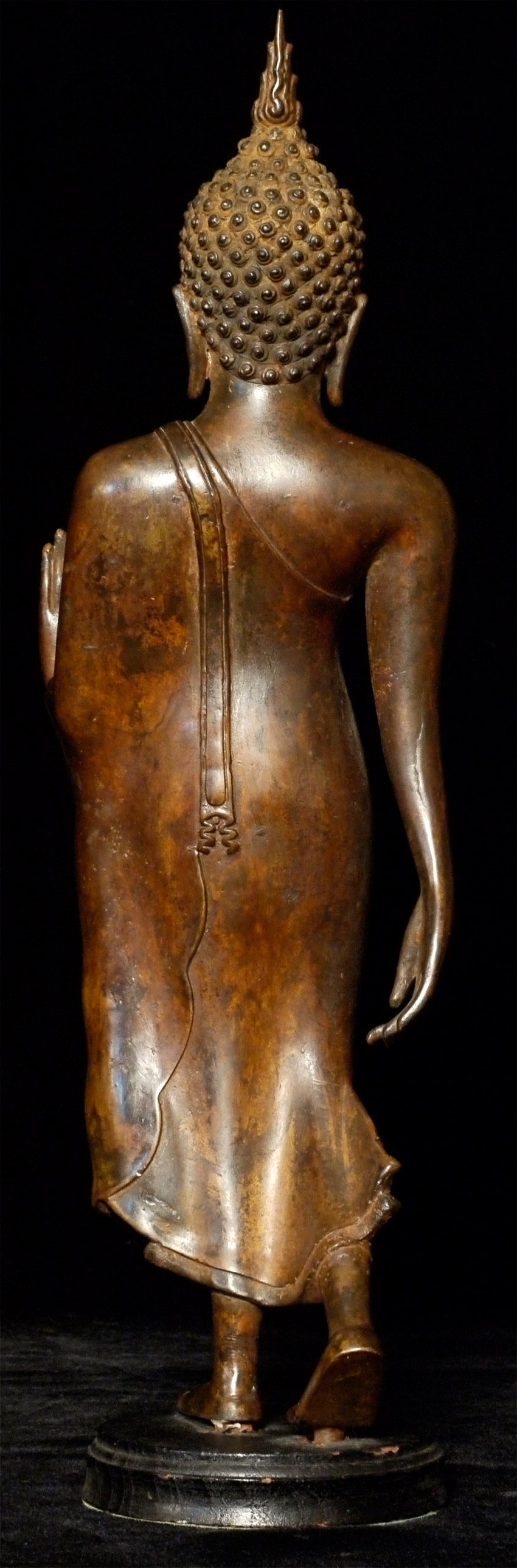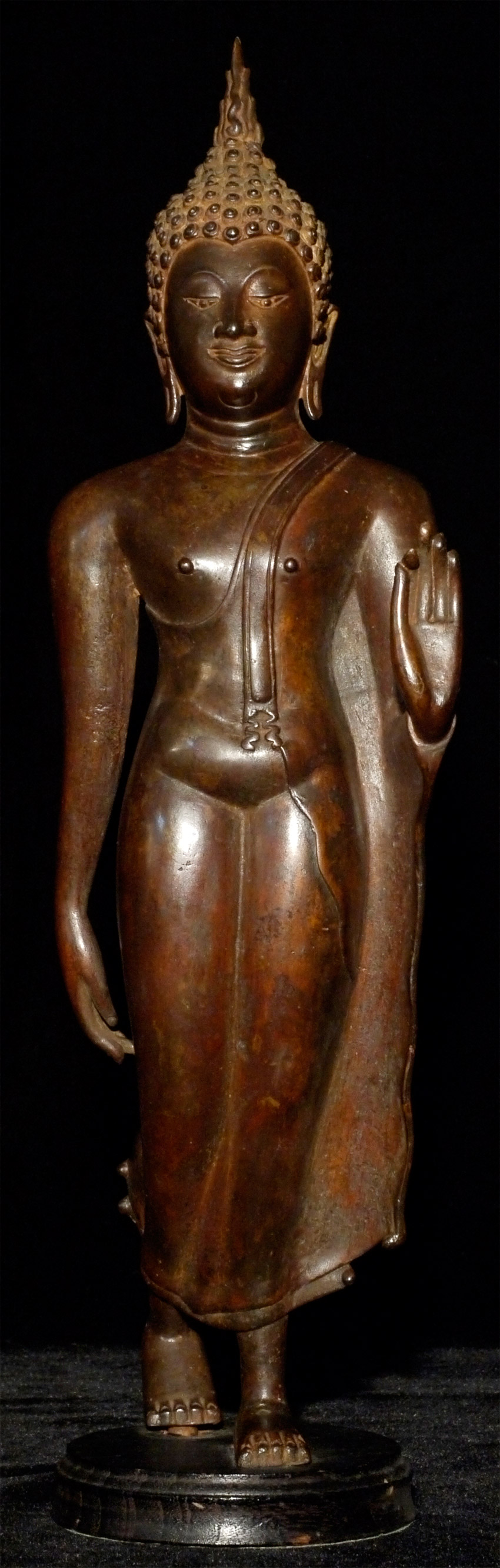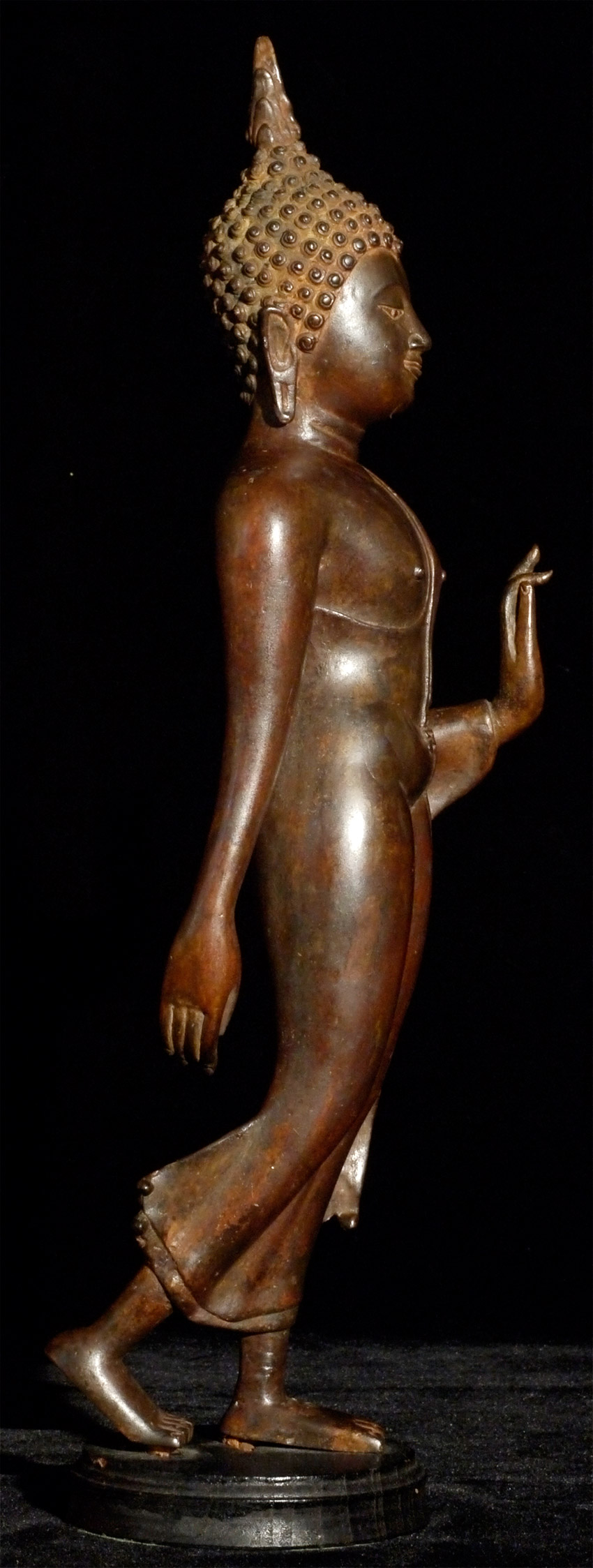 Early 20thC Thai walking Buddha. High quality example. Stands an impressive 15 inches tall, wooden base elevates it to 15 7/8 inches.