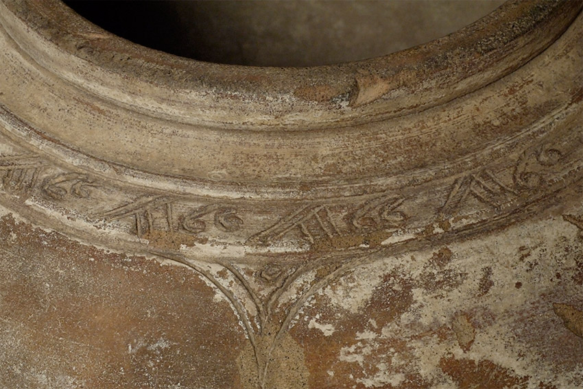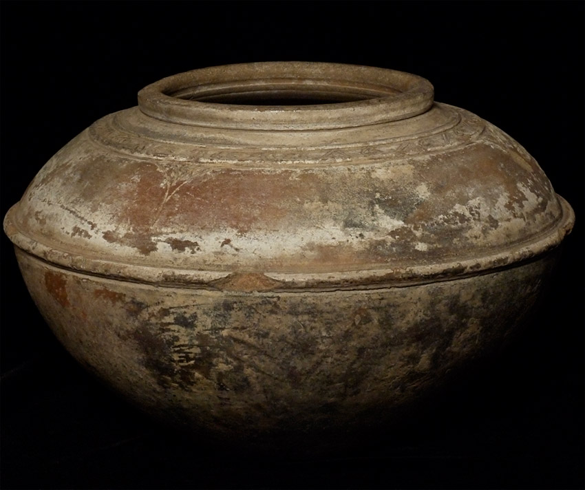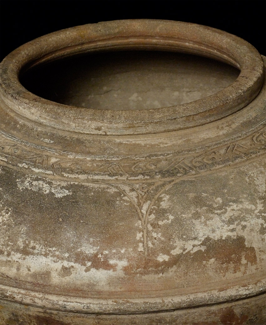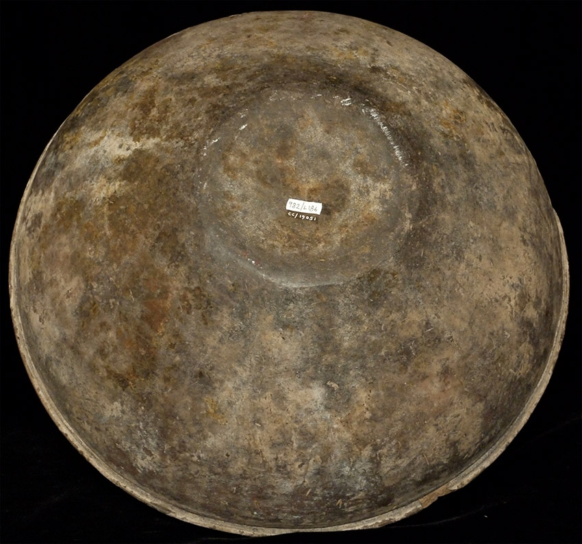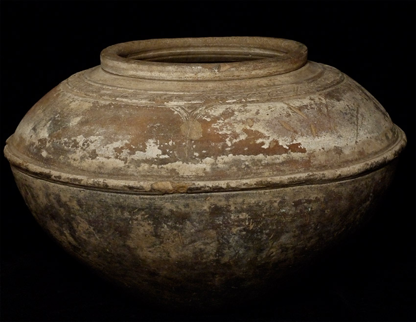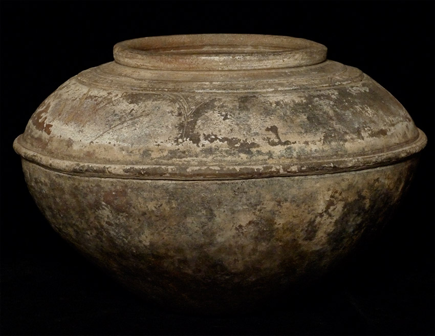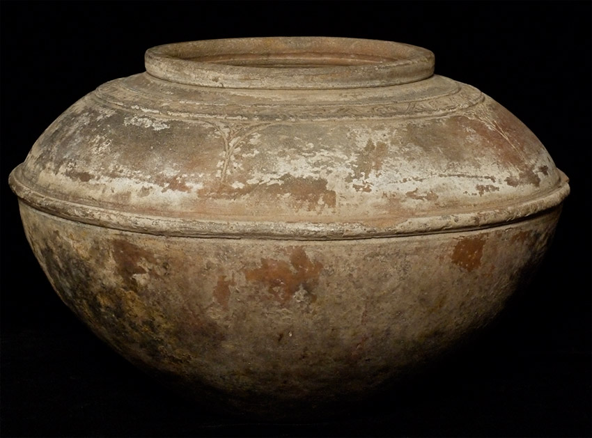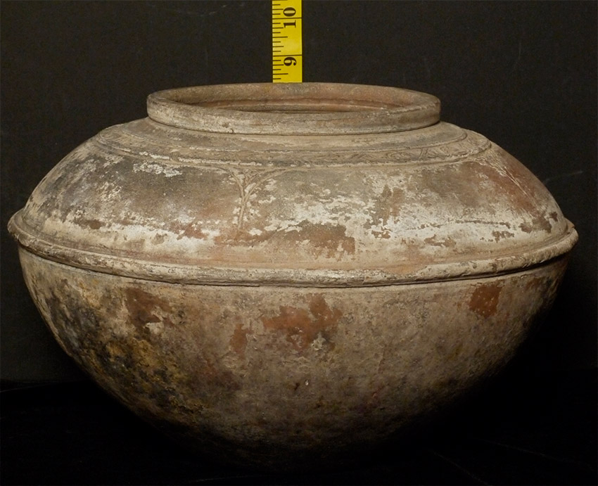 Ancient bowl with old collection numbers. Came as part of an estate collection of mostly Chinese items, though I am truly unsure about this one. This was the only pot, and it came with no documentation. Massive, beautiful, appears ancient, and in remarkable condition. Bowl is 8.25 inches high, with a top opening diameter of 6 inches. The circumference at the widest point is 43 inches.