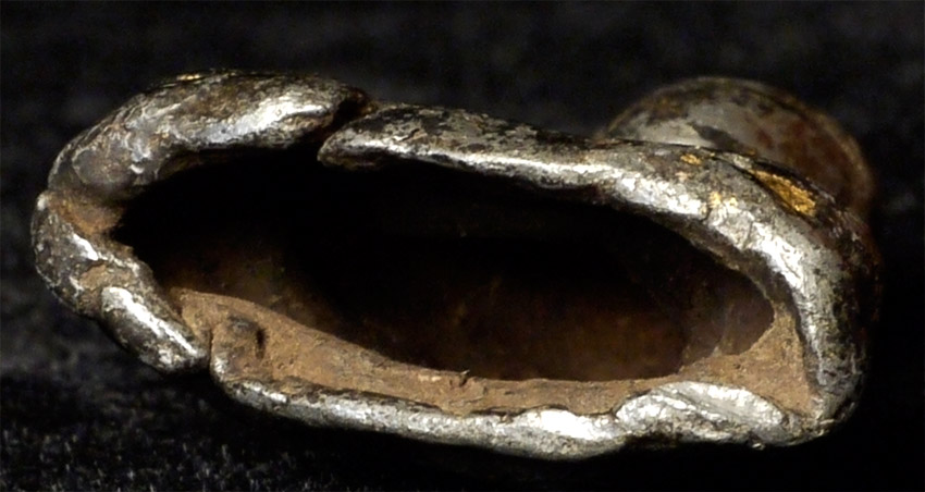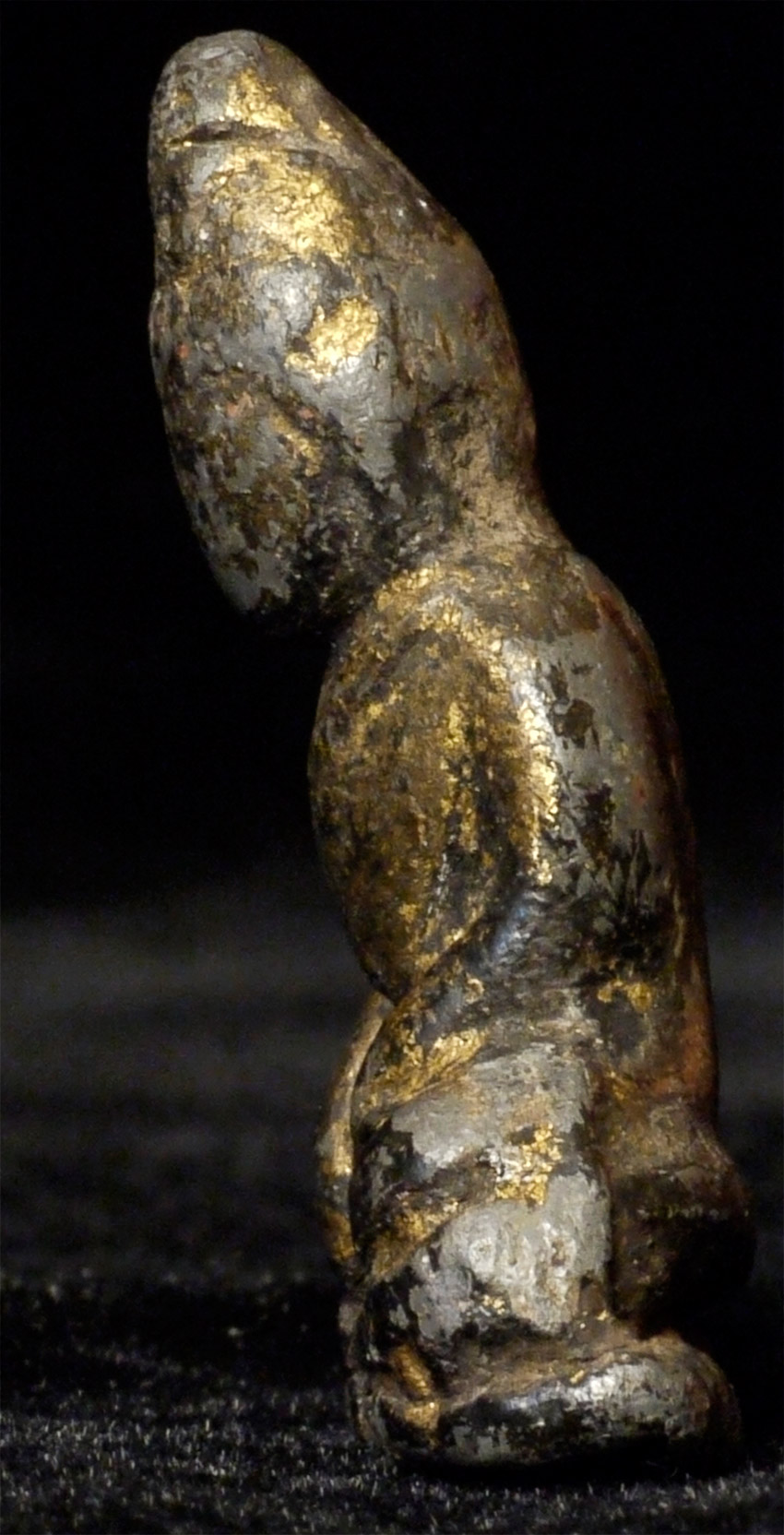 Very old Thai (?) lead alloy Buddha. Looks as if the gilding and lacquer were applied after his face and body were worn smooth with devotion. Stands 1.5 inches tall. Powerful fellow.
