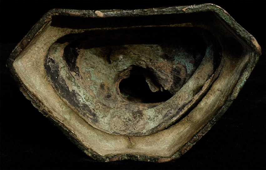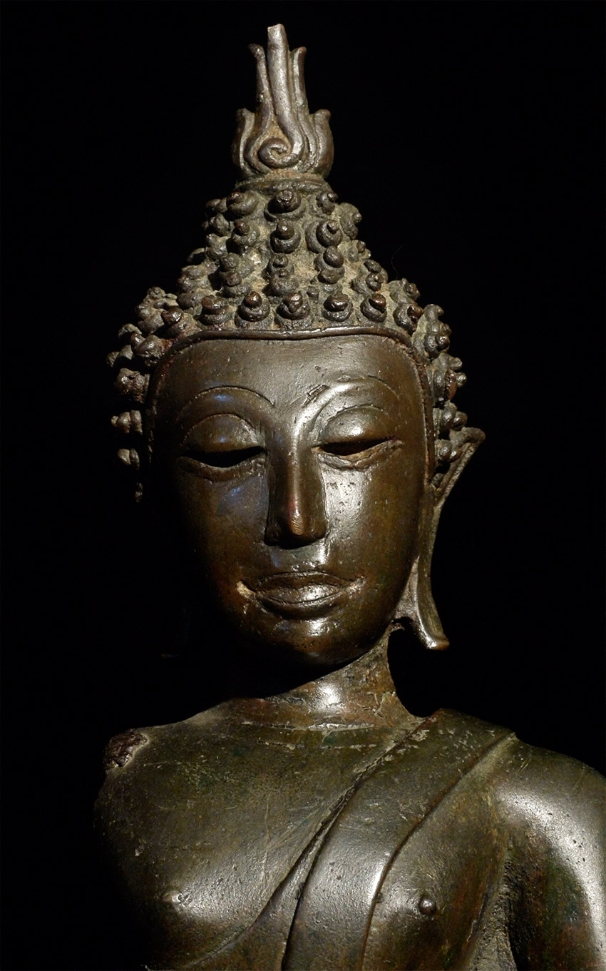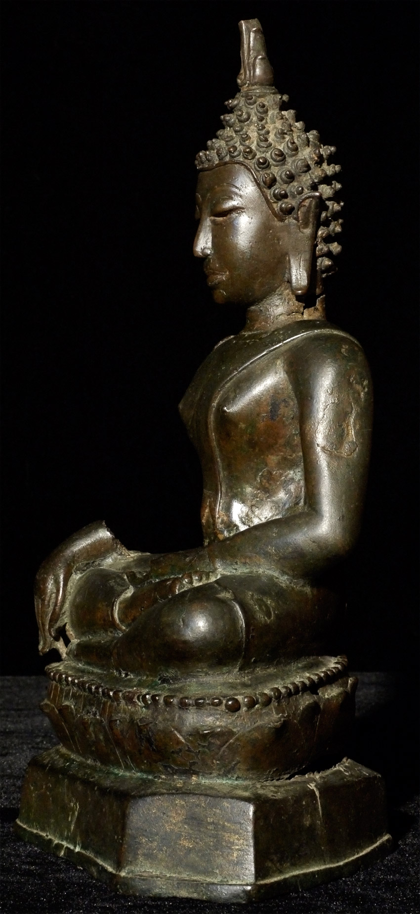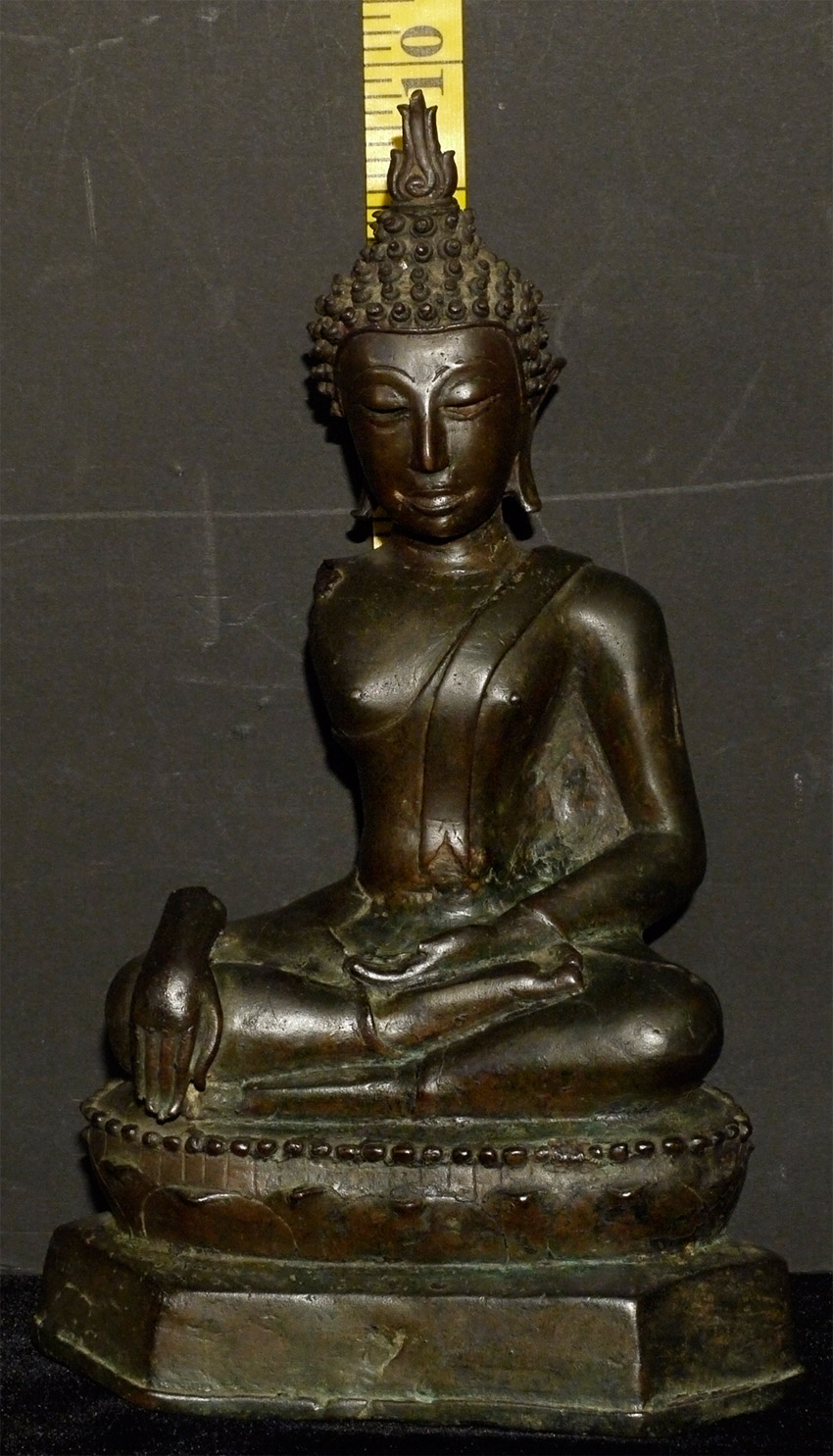 Classic 16thC Northern Thai Bronze Buddha. Looks to have gone through a fire or a war, and yet still he sits here in meditation. Missing one arm and shoulder, which provides an interesting effect, as with the right hand intact, the mind fills in the missing parts to some degree. Well cast head is slightly cocked to one side. Beautiful Northern Thai face originally had inlaid eyes. Sits a nice size at 9.75 inches tall.