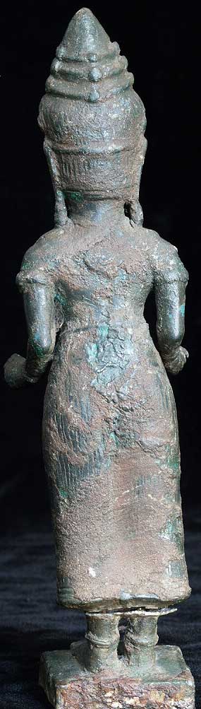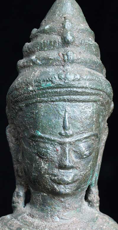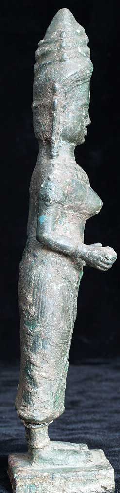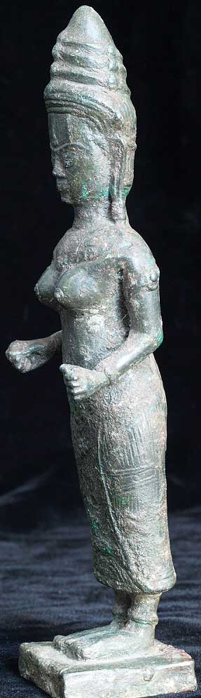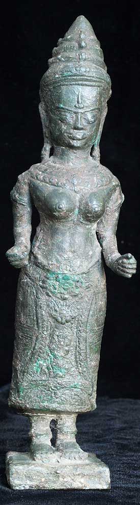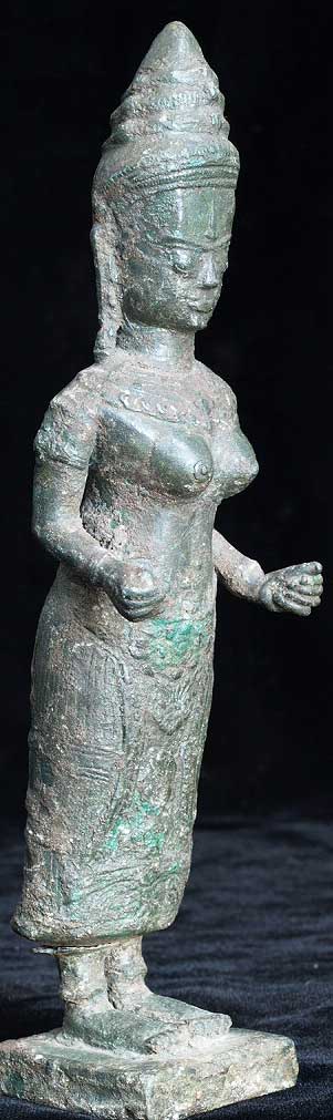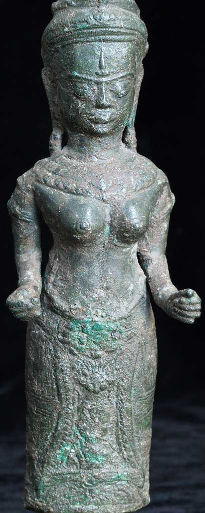 Powerful Cambodian female figure- came out of a group of items bought together at an estate many years ago. My guess is that this has age to it but that it is not a period piece- The more I see pieces like this the harder it is for me to know exactly what I am looking at. I’ve managed to accumulate a significant number of pieces which I am unsure of that I keep meaning to study further. I never seem to get to them, so I’m going to list some of them at reasonably low prices and move them out. Complete with no losses. Some cracking to where the legs meet the skirt, otherwise excellent. Stands solidly. Very good size at 7.5 inches tall.