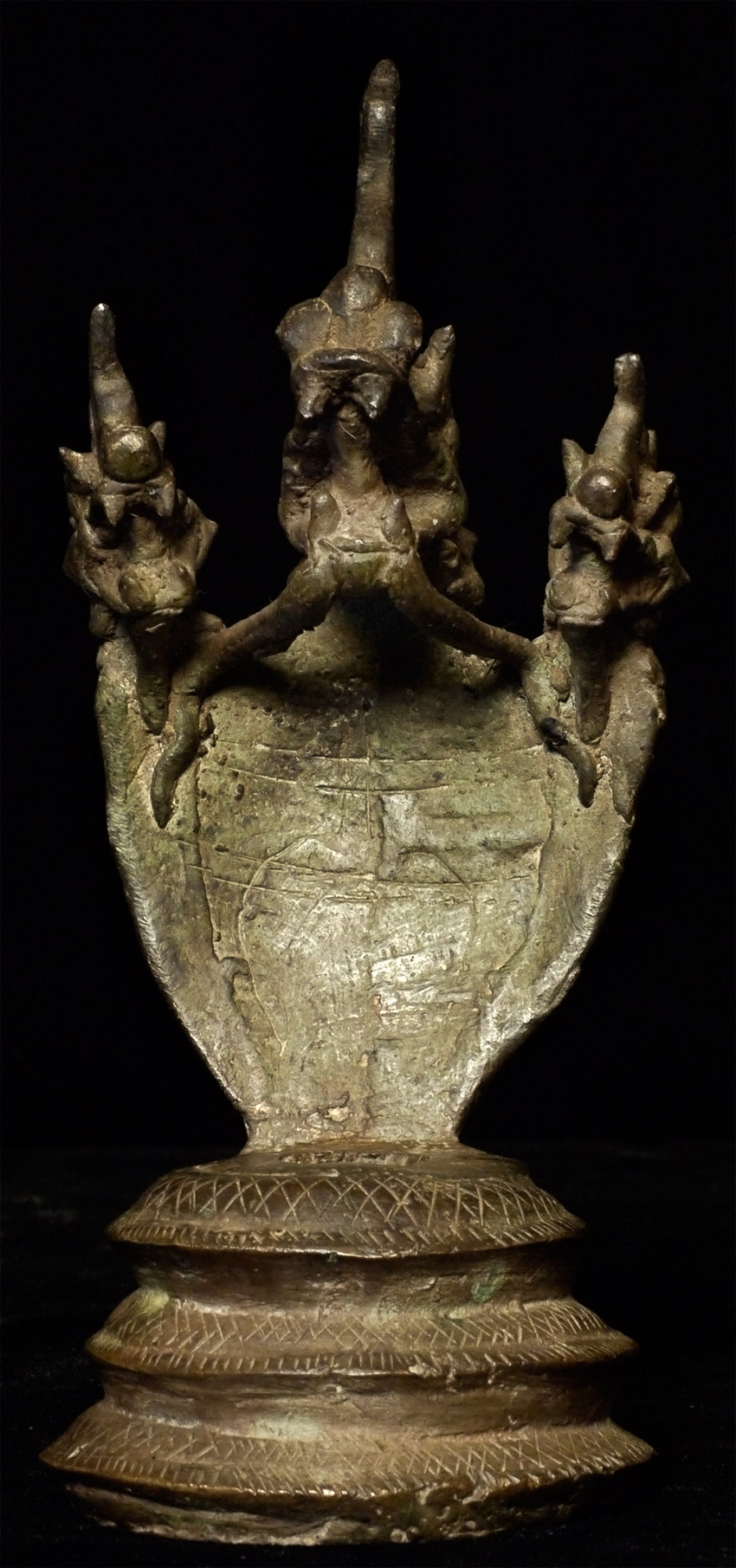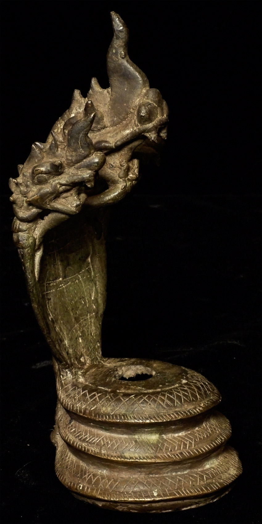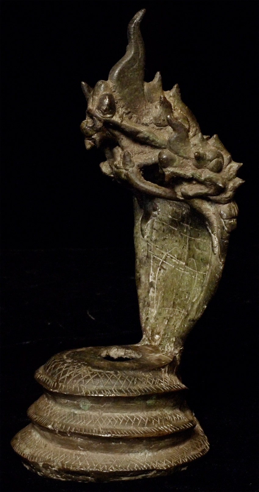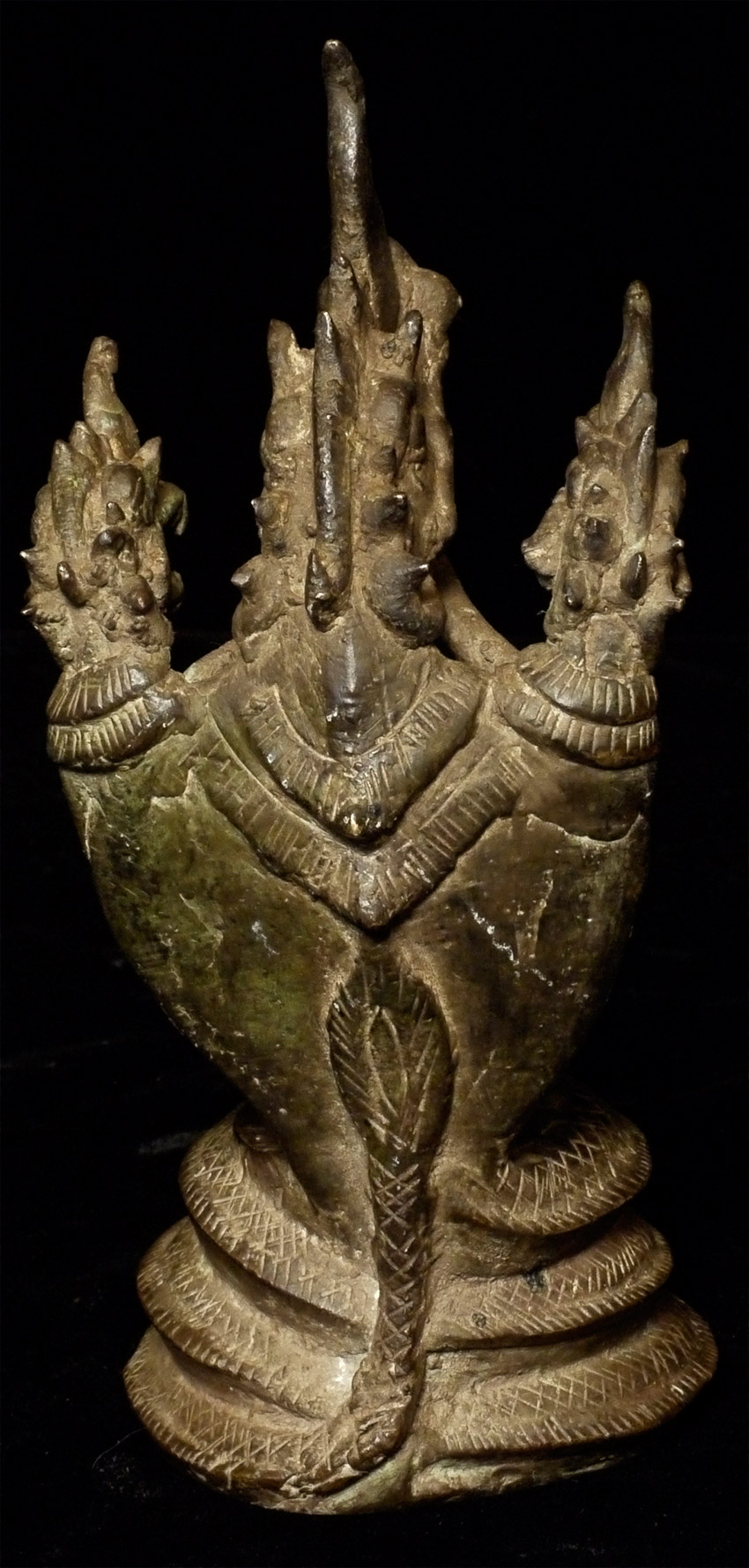 Rare Thai or Cambodian bronze antique 3 headed Naga Canopy stand. Based on 30 years of examining this sort of thing closely, this one is a true antique one made for ritual use, and not one of the 99.8% made as a copy of such. May have very good age. Could be displayed by itself, or could be used to enhance and honor an appropriately sized Buddhist or Hindu figure. Only one I've come across on it's own. Stands 7 inches tall.